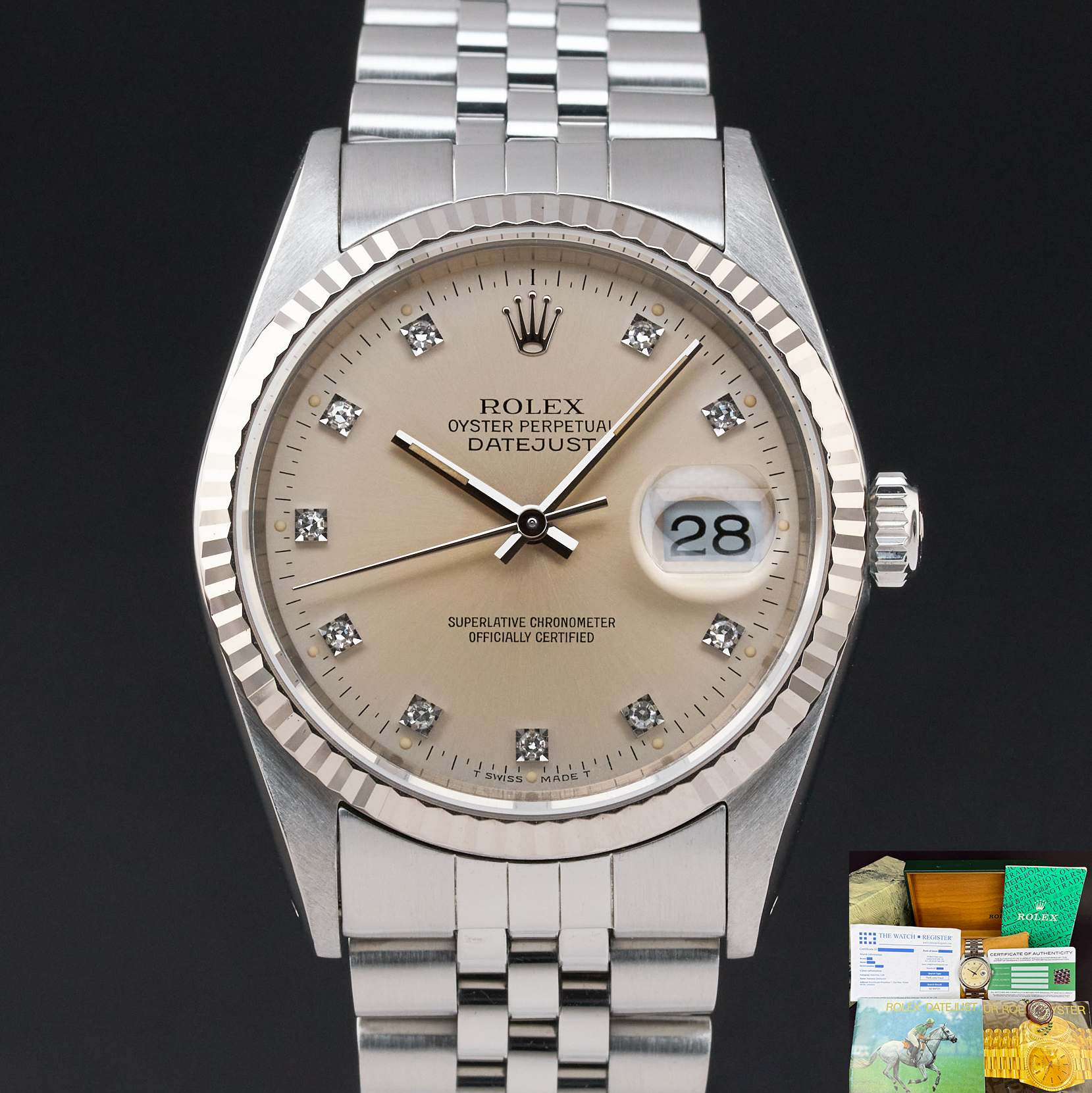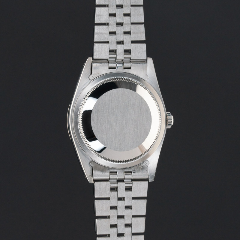 This Rolex Datejust 16234 features a Silver small diamond dial and is crafted from stainless steel, with a production year of 1990.