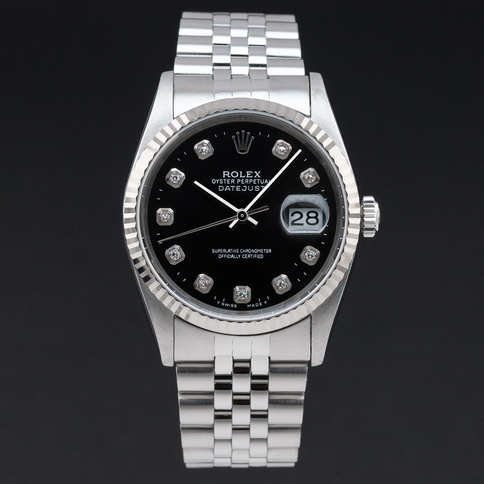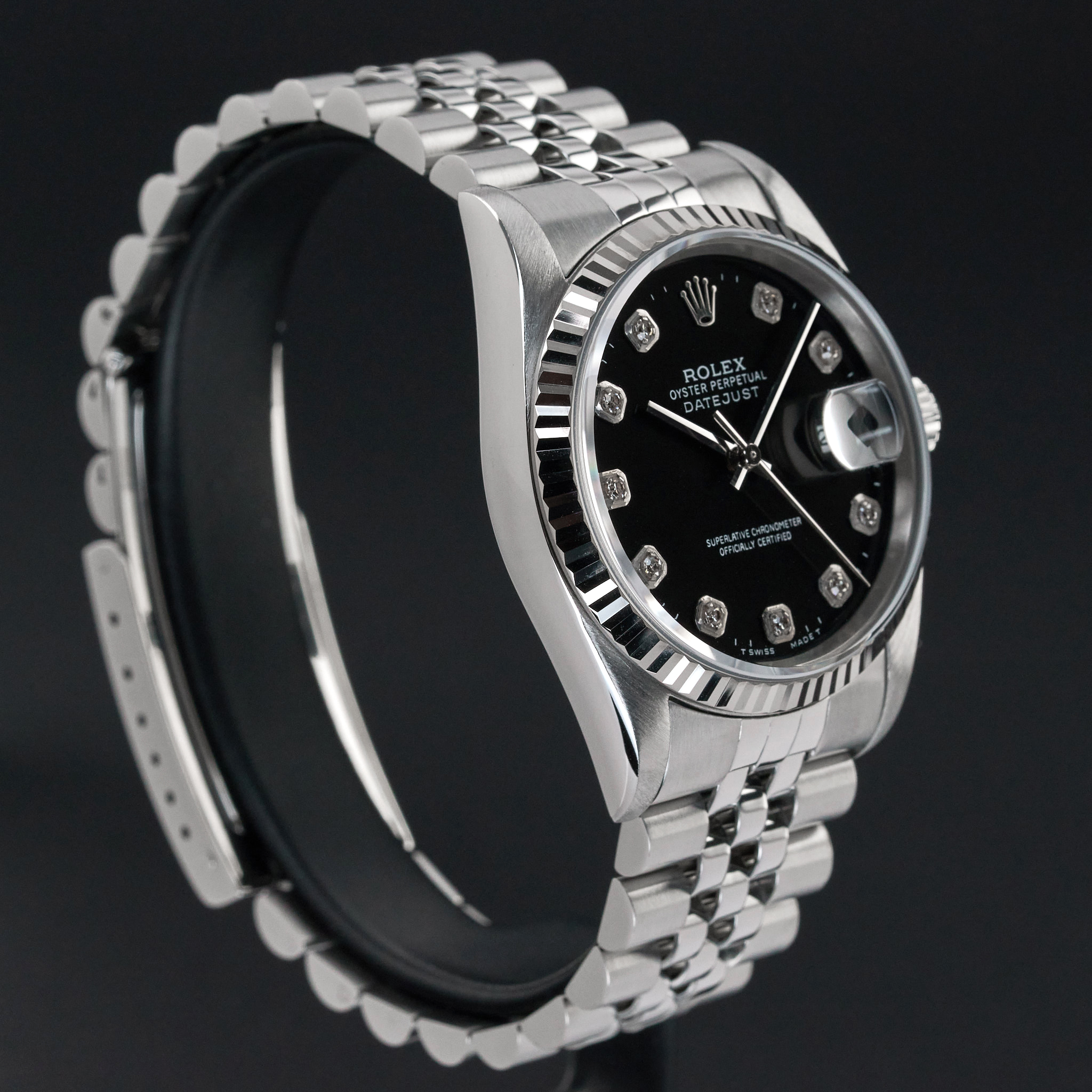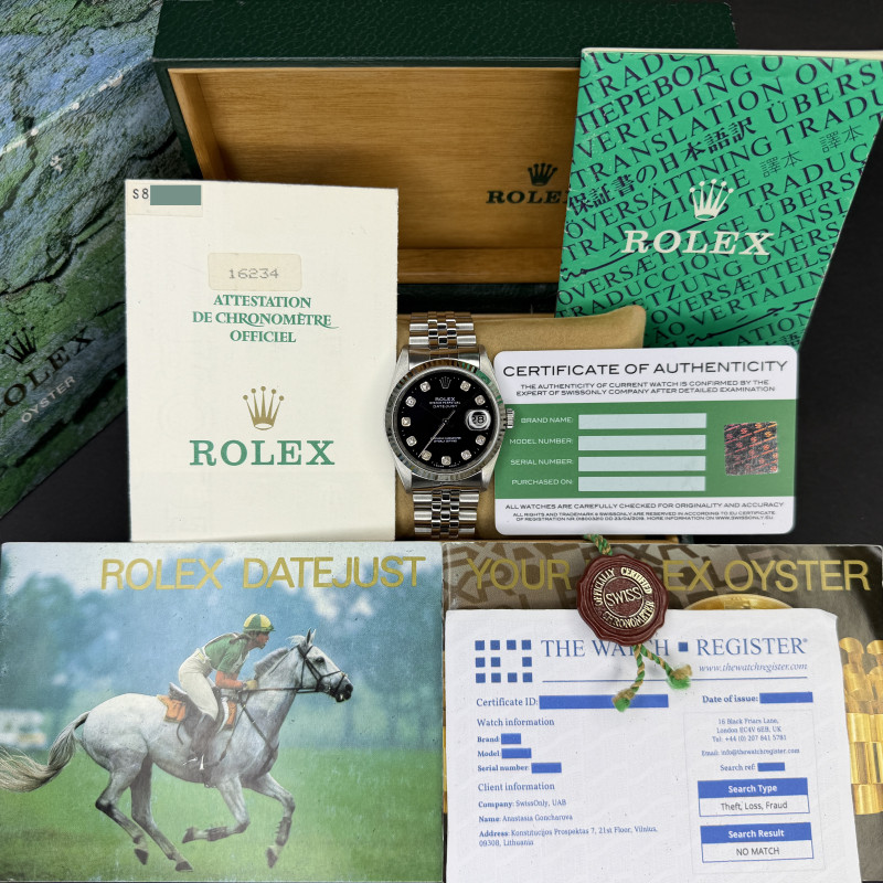 This Rolex Datejust 16234 features a Black Big Diamond dial and is crafted from stainless steel, with a production year of 1994.