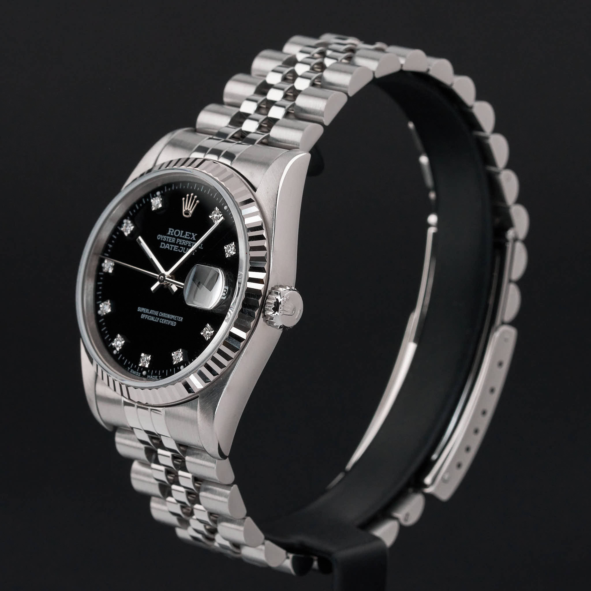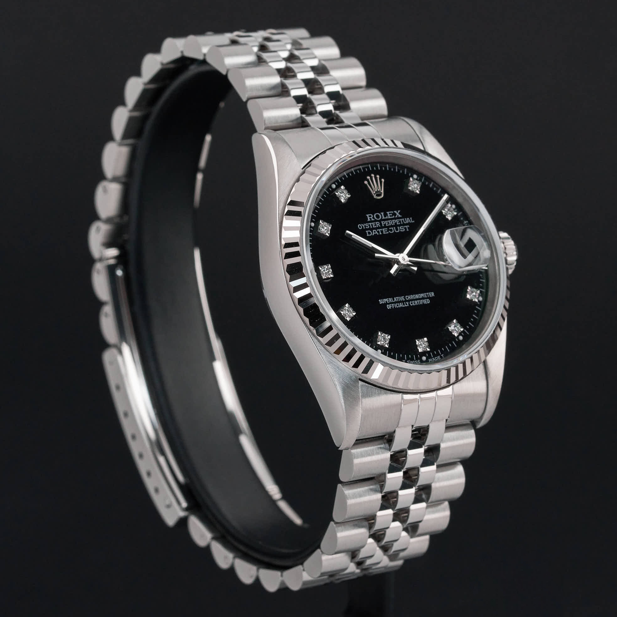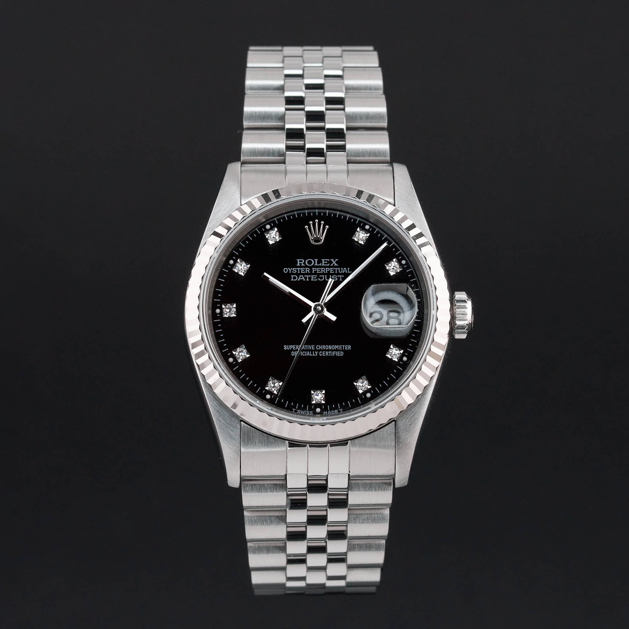 This Rolex Datejust 16234 features a Black small diamond dial and is crafted from stainless steel, with a production year of 1994.