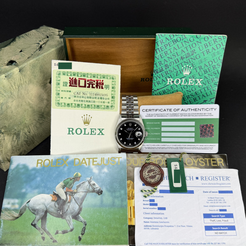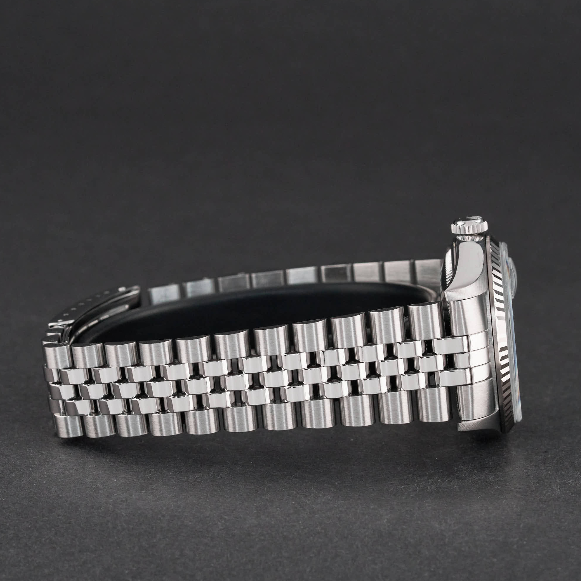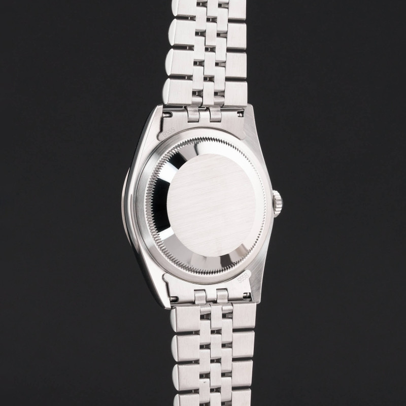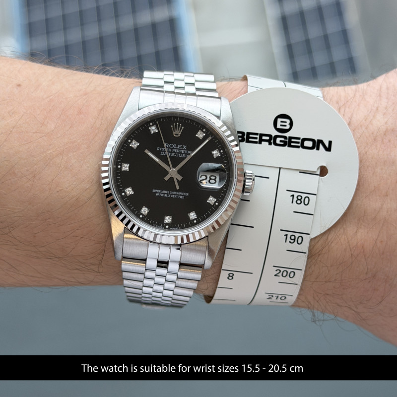 This Rolex Datejust 16234 features a Black small diamond dial and is crafted from stainless steel, with a production year of 1994.