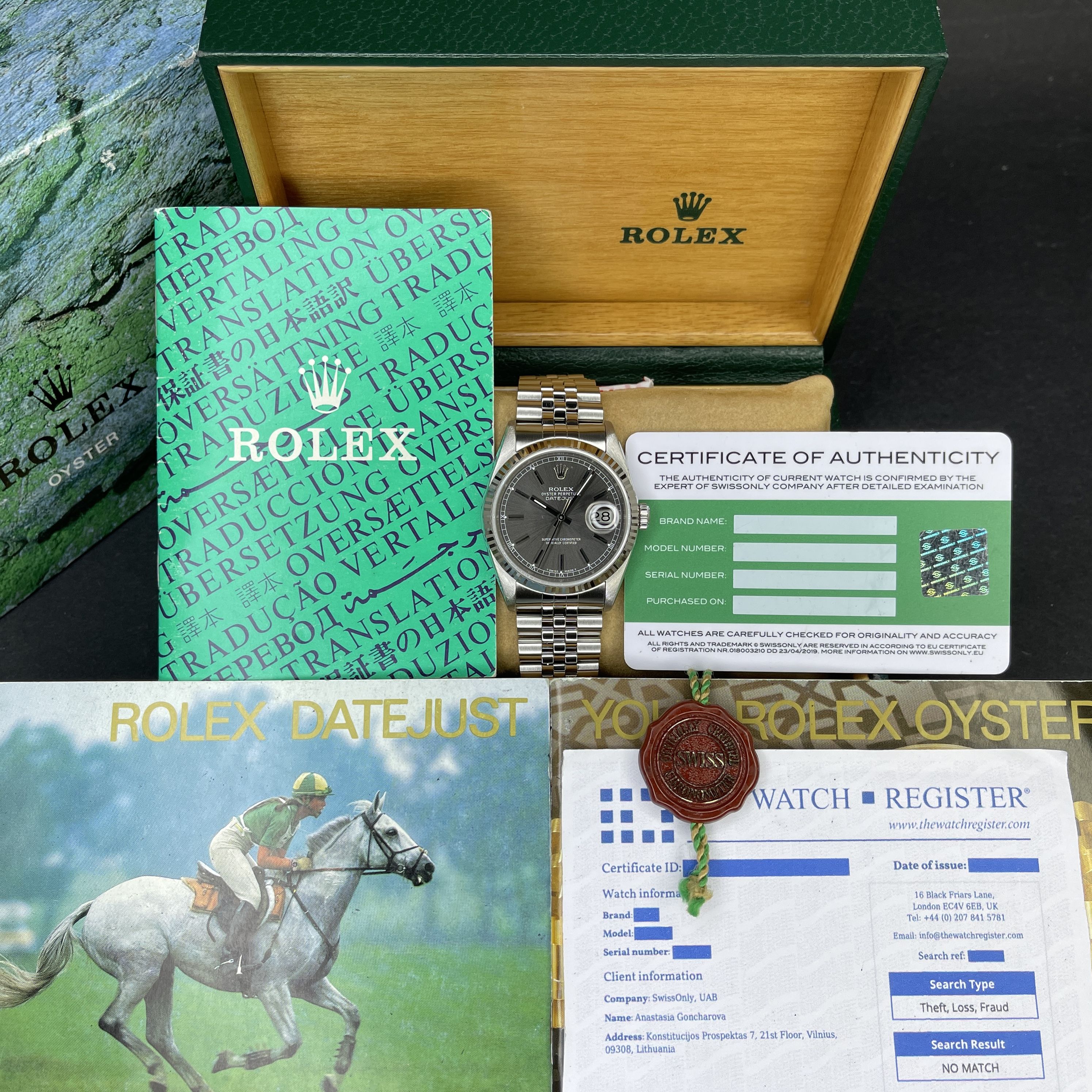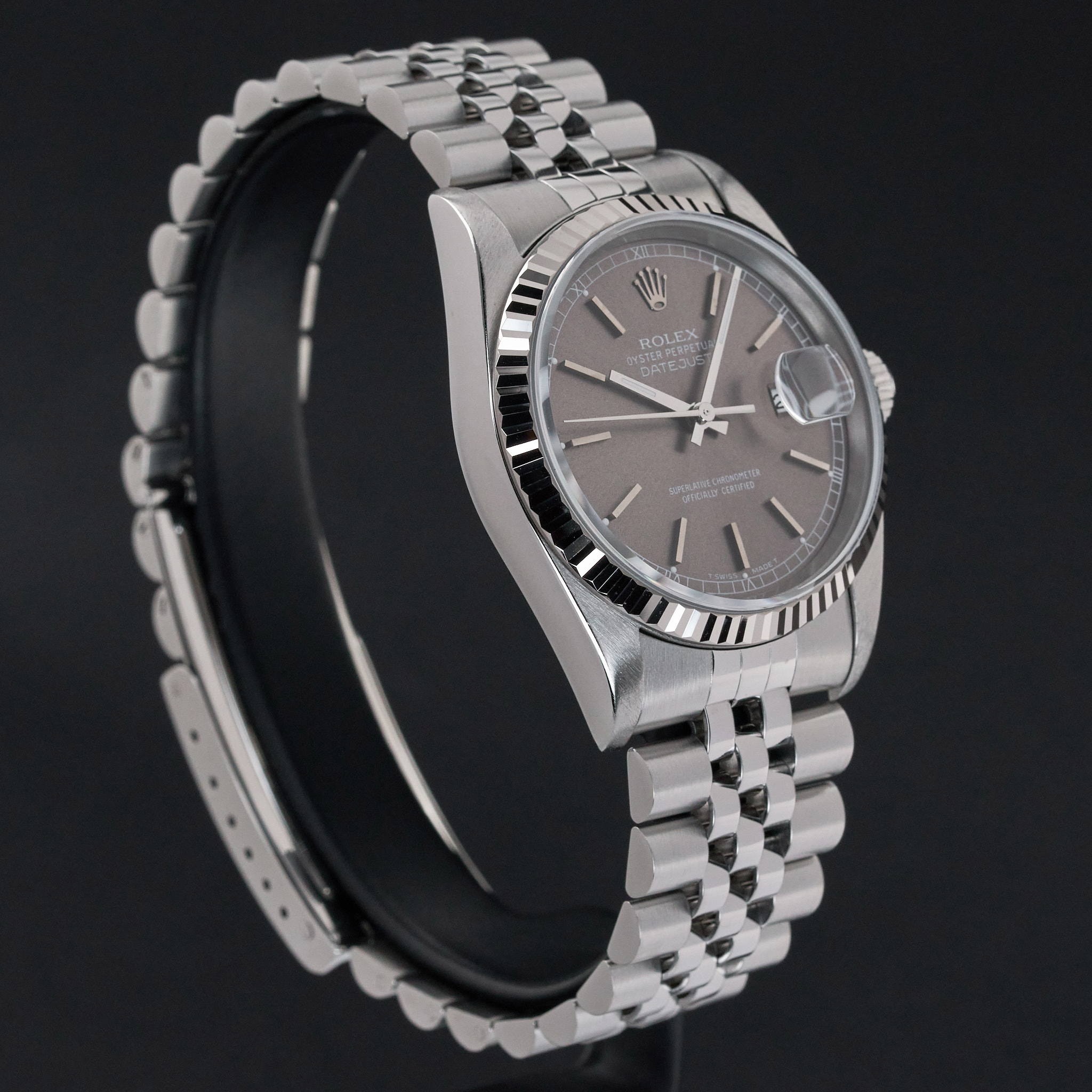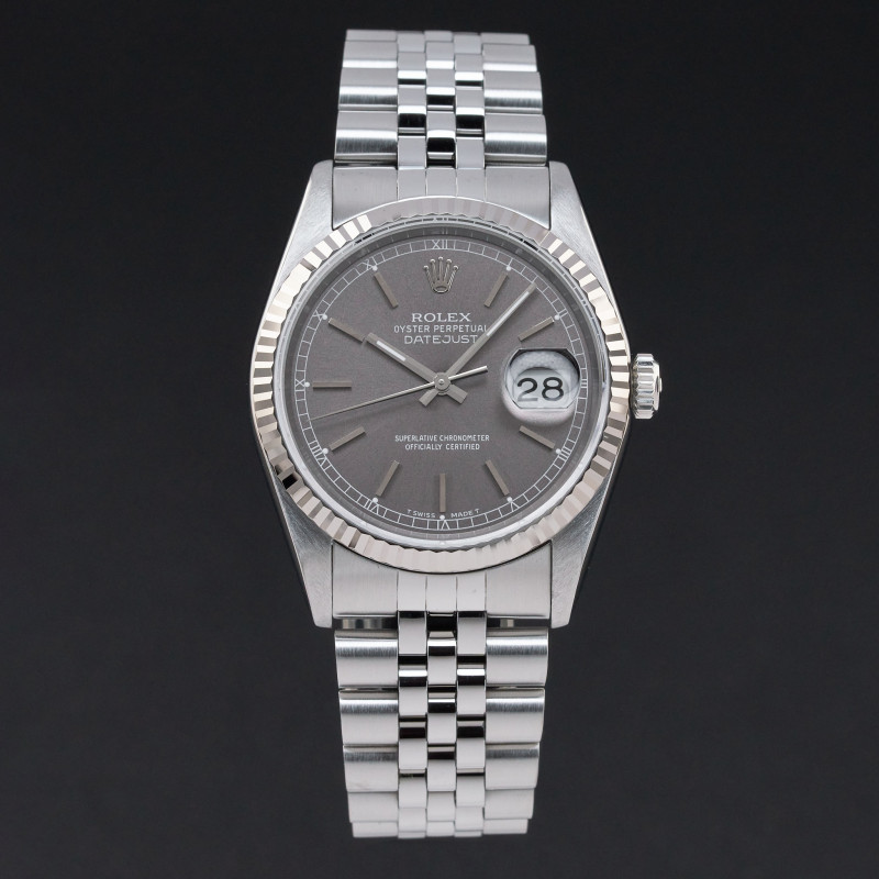This Rolex Datejust 16234 features a Grey dial and is crafted from stainless steel, with a production year of 1994.