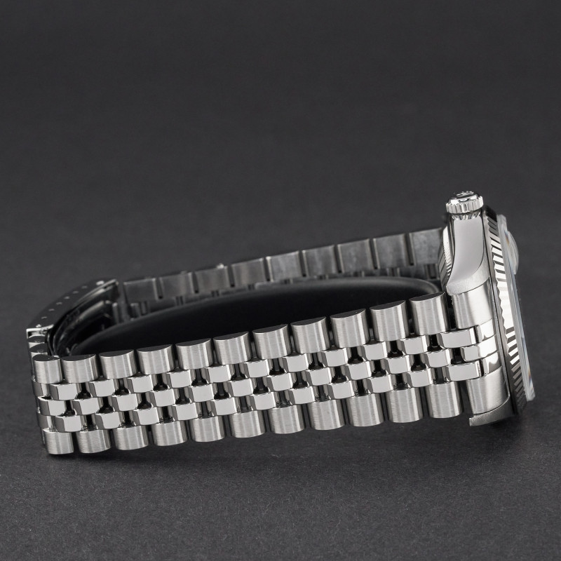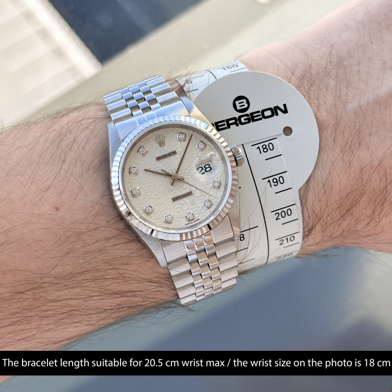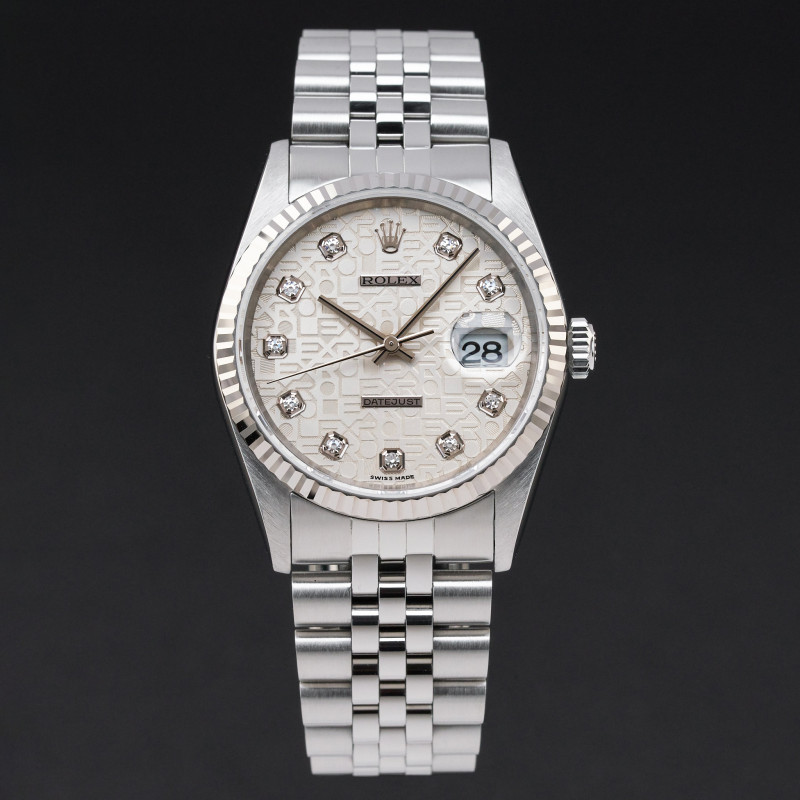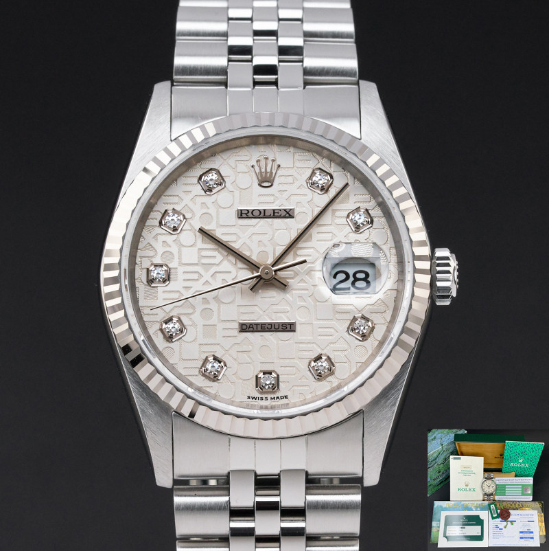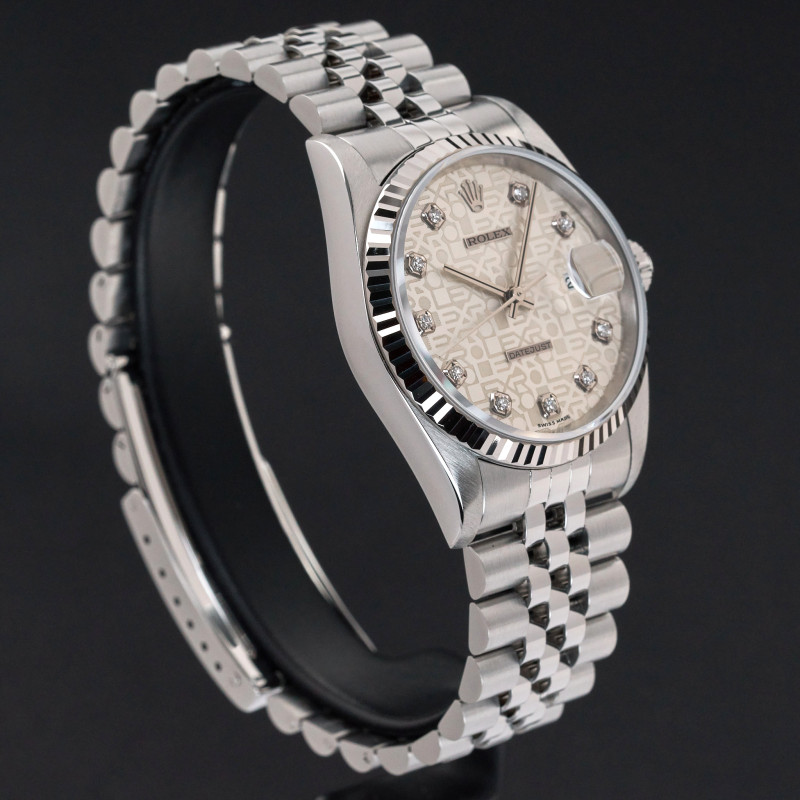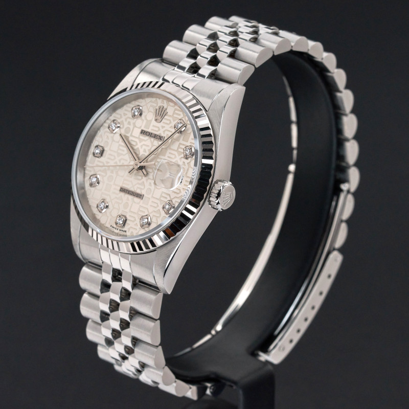 This Rolex Datejust 16234 features a Silver jubilee big diamond dial and is crafted from stainless steel, with a production year of 1995.