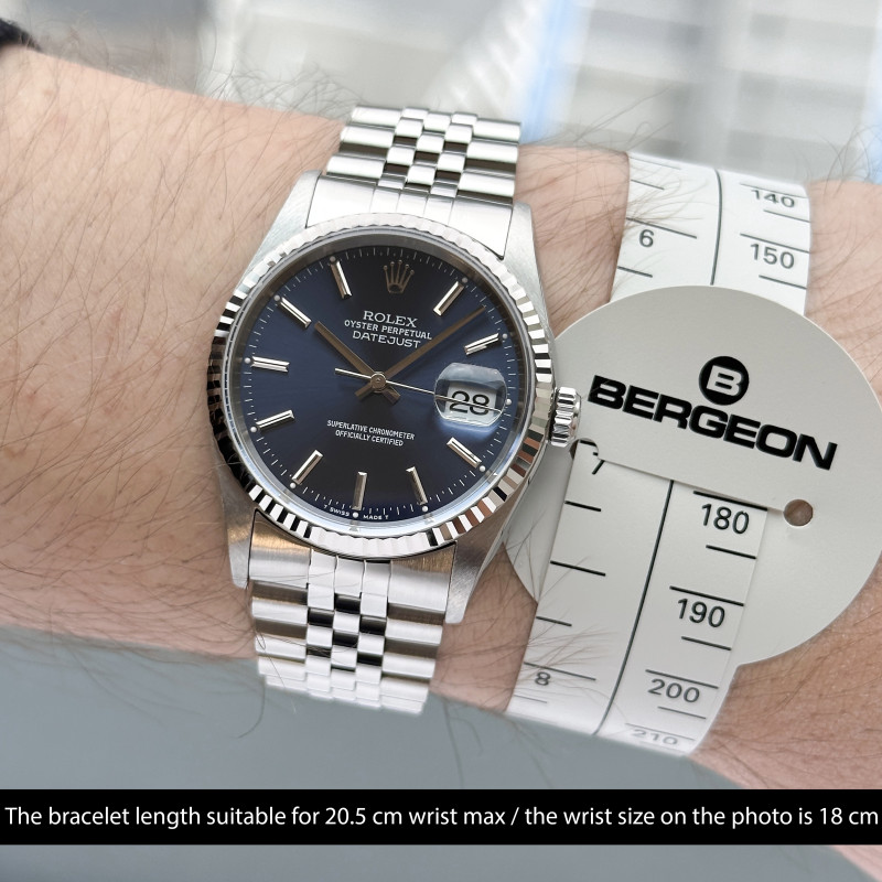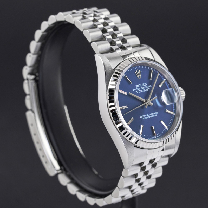 This Rolex Datejust 16234 features a Blue dial and is crafted from stainless steel, with a production year of 1996.
