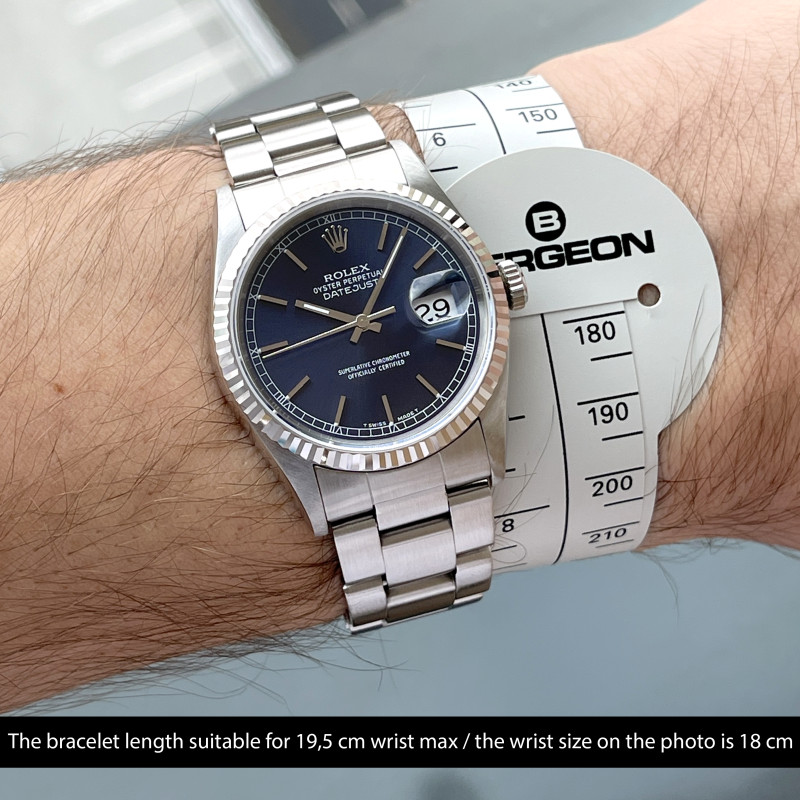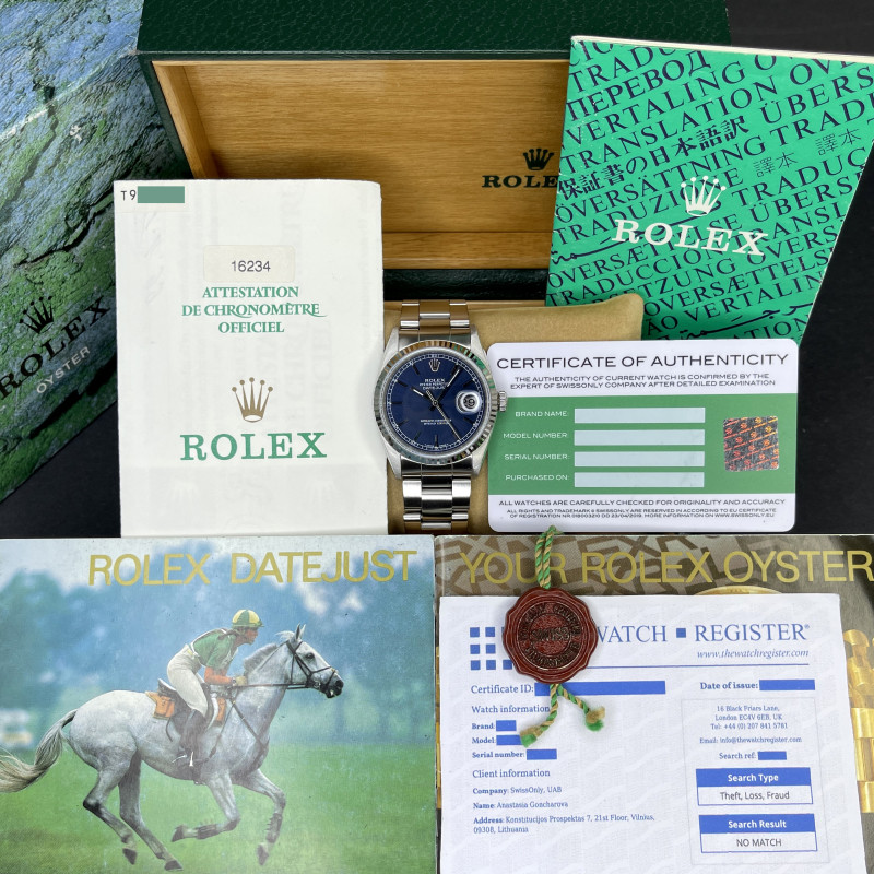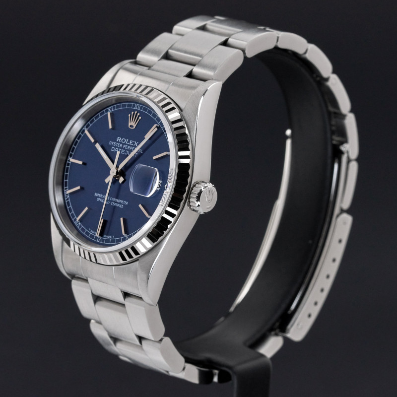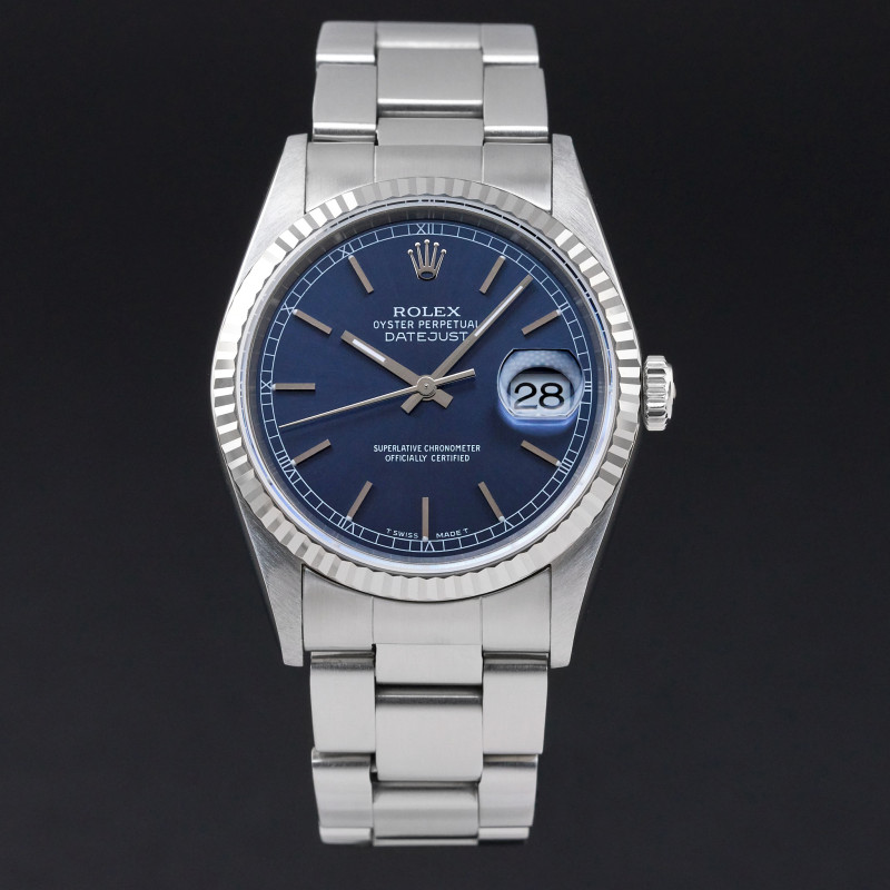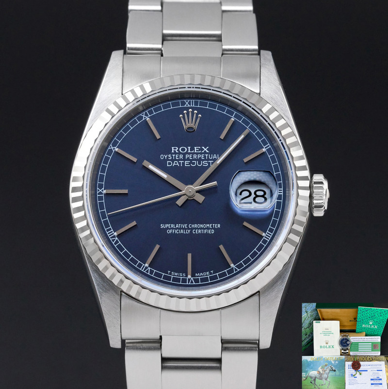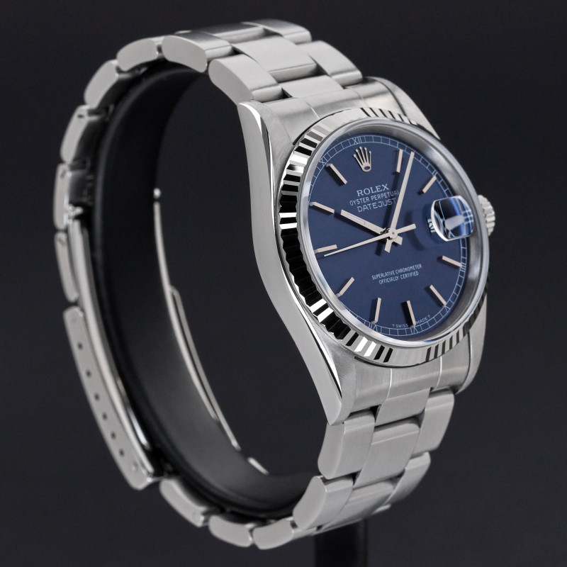 This Rolex Datejust 16234 features a Blue dial and is crafted from stainless steel, with a production year of 1996.