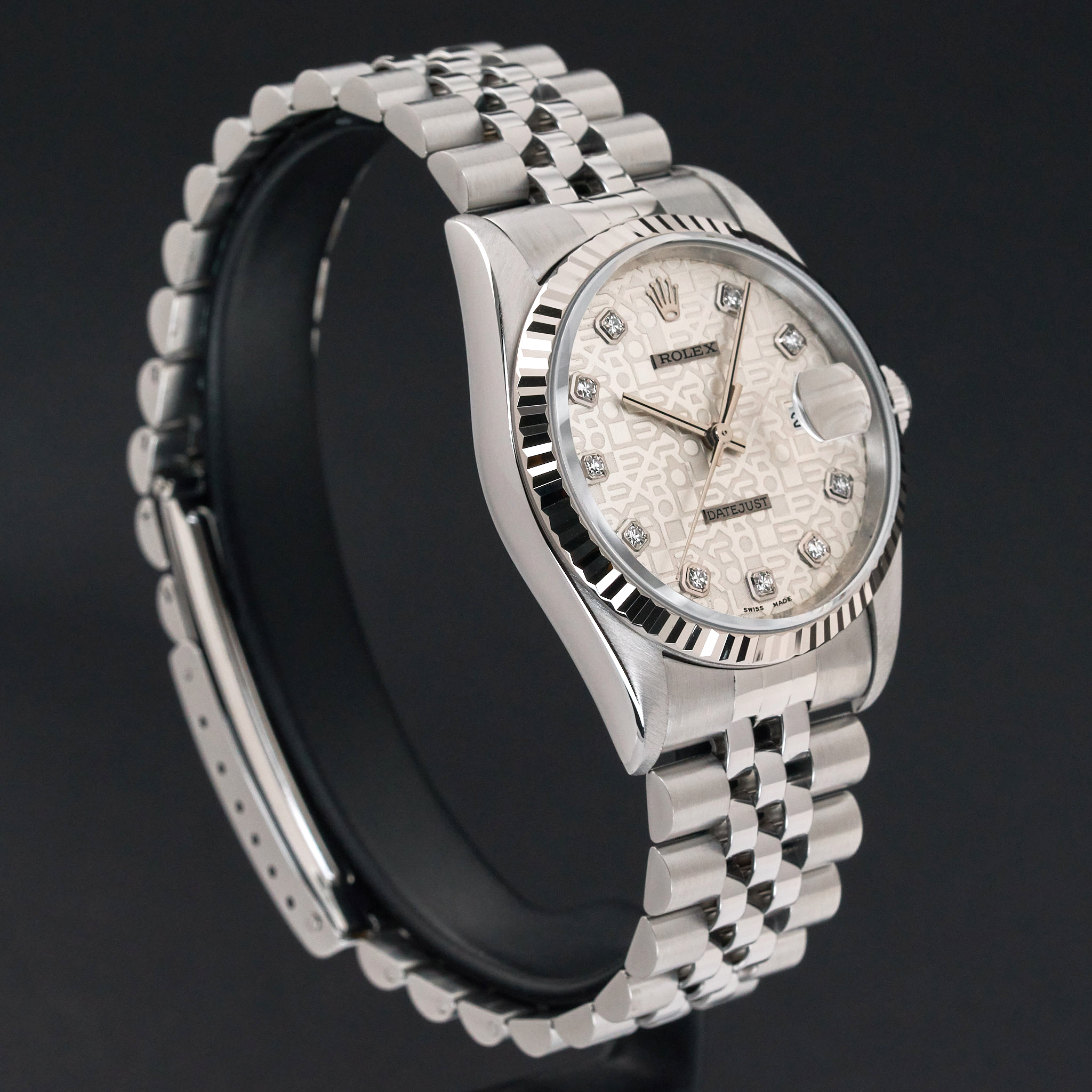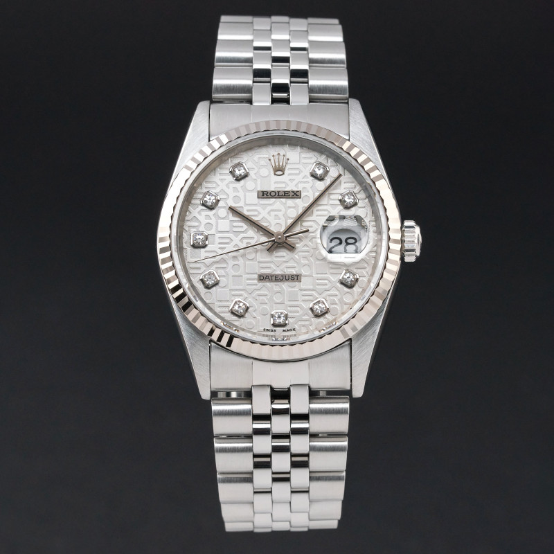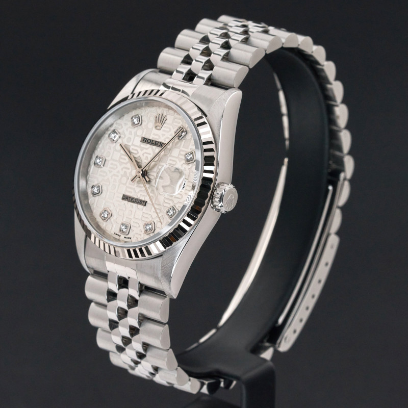This Rolex Datejust 16234 features a Silver jubilee big diamond dial and is crafted from stainless steel, with a production year of 1997.