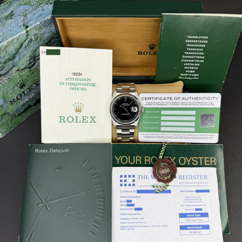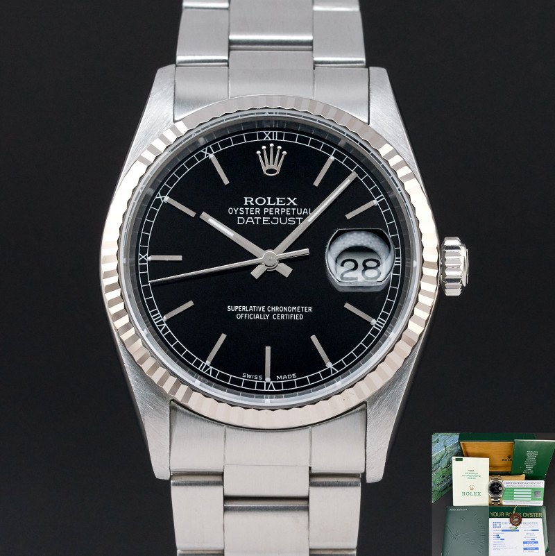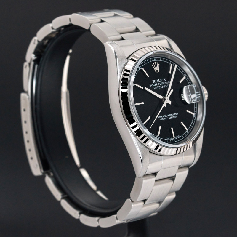 This Rolex Datejust 16234 features a Black dial and is crafted from stainless steel, with a production year of 2000.