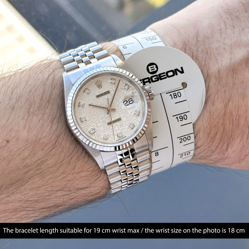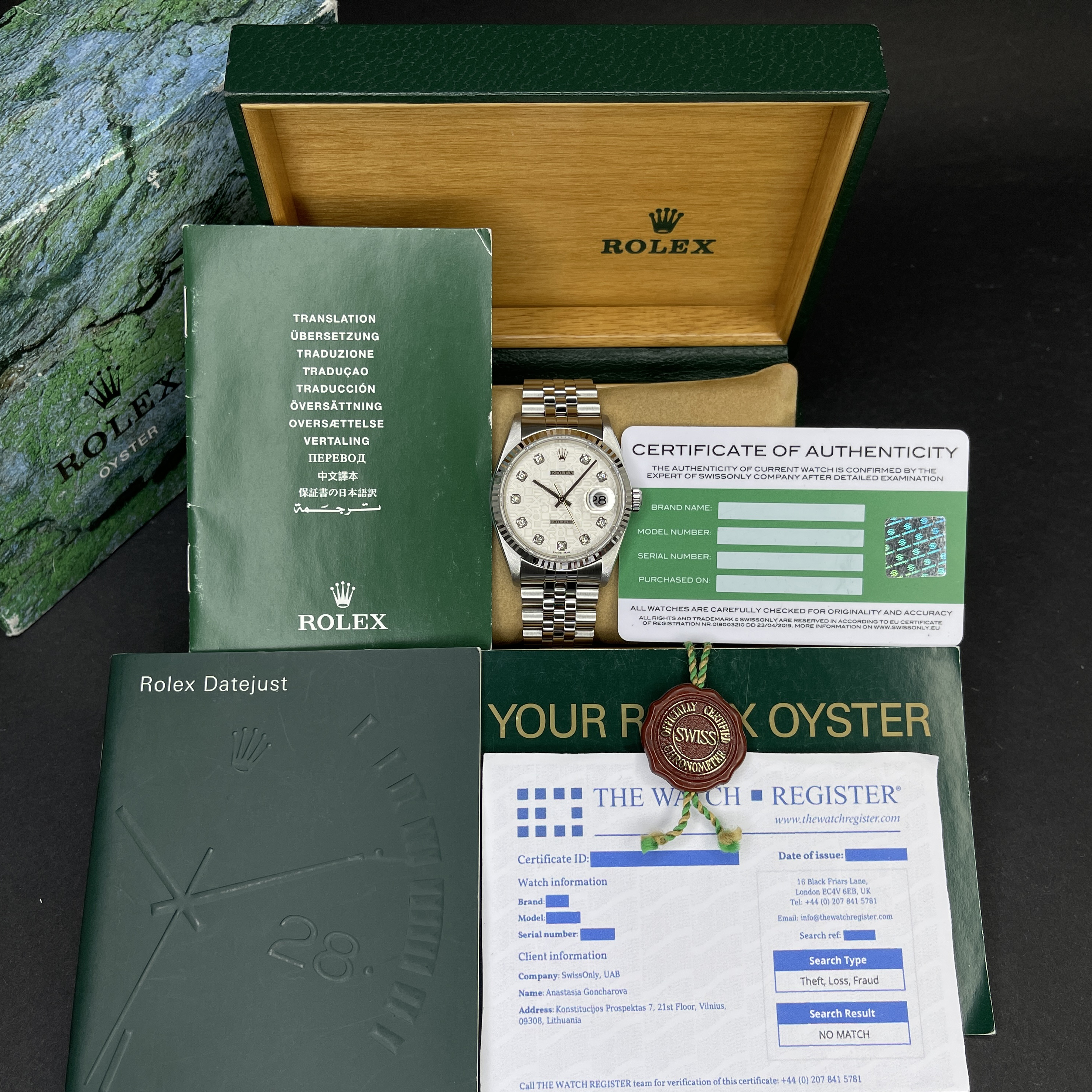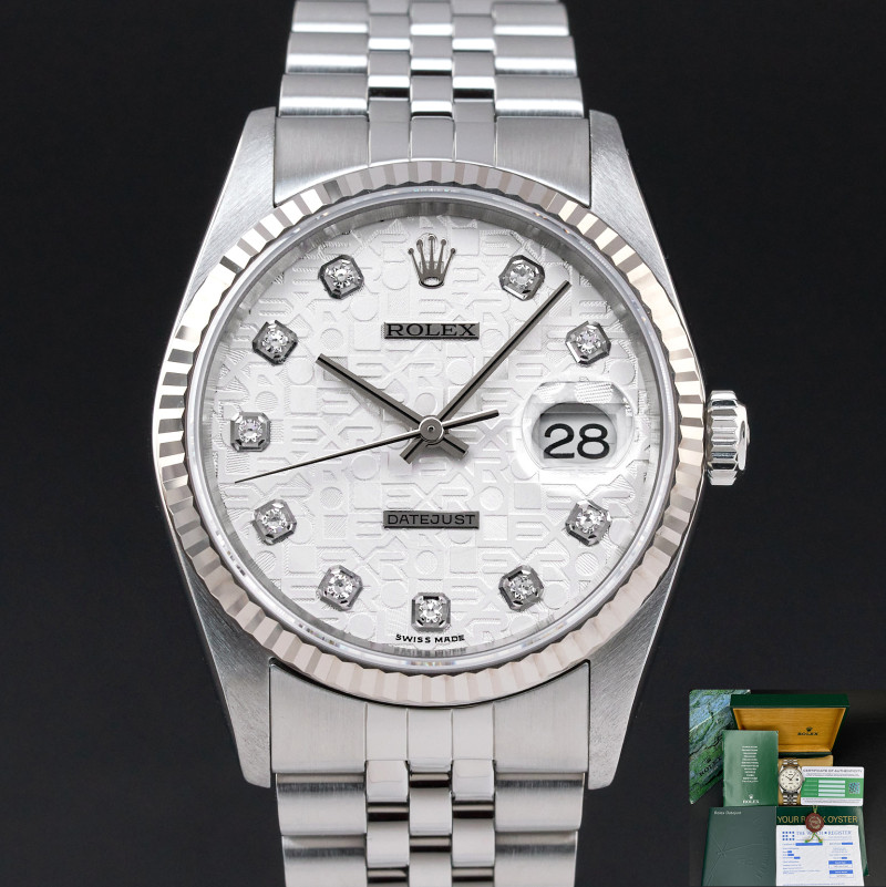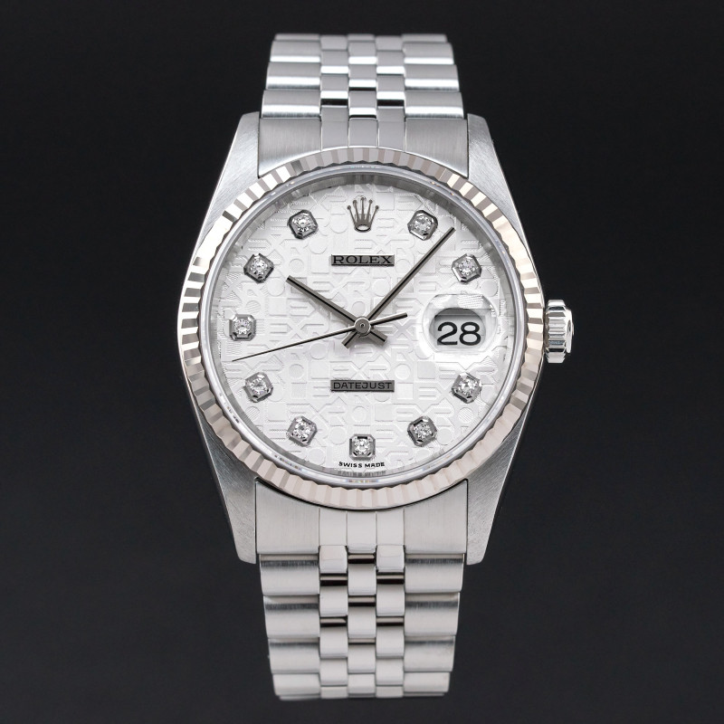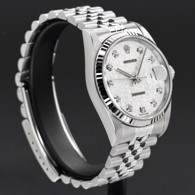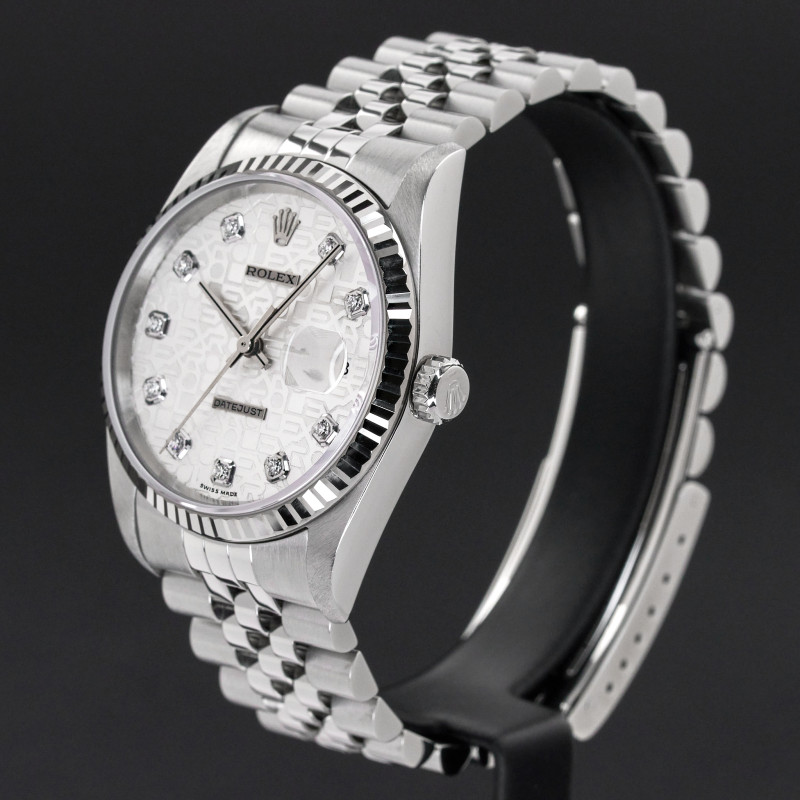 This Rolex Datejust 16234 features a Silver jubilee diamond dial and is crafted from stainless steel, with a production year of 2000.