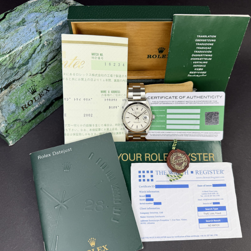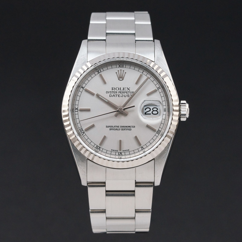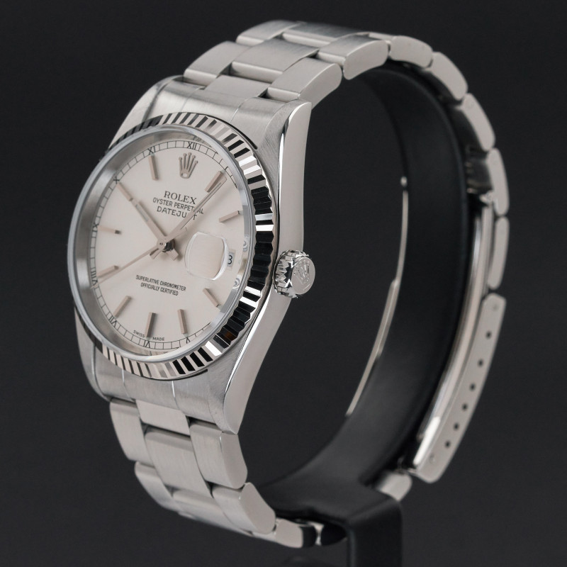 This Rolex Datejust 16234 features a Silver dial and is crafted from stainless steel, with a production year of 2001.