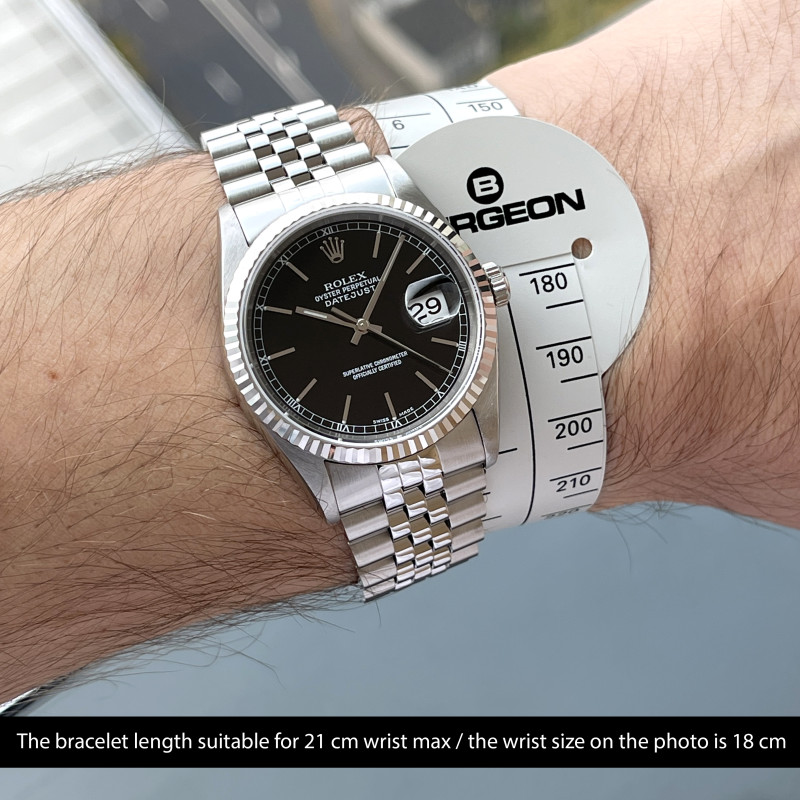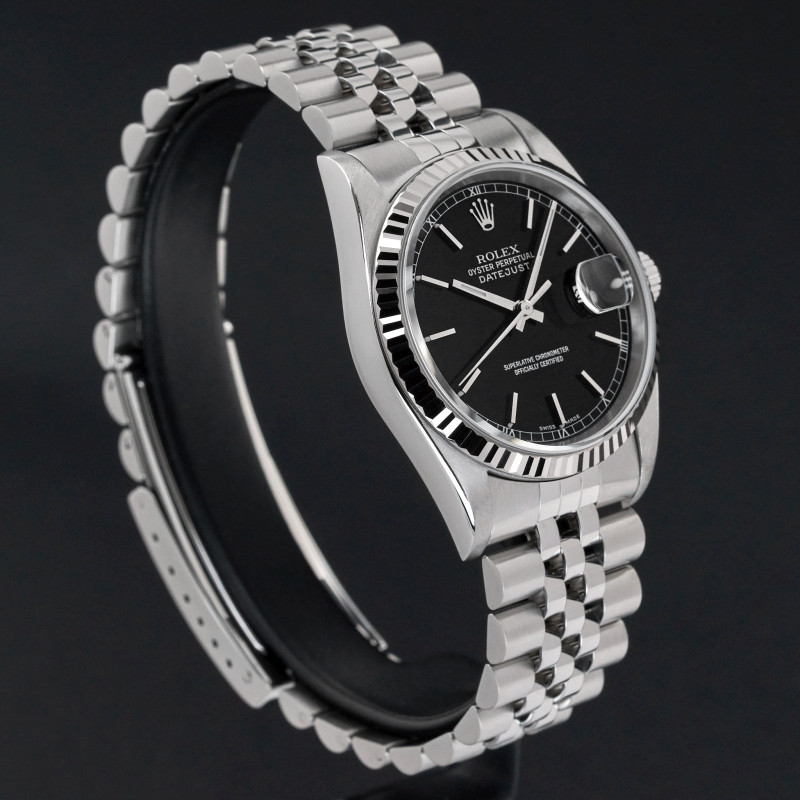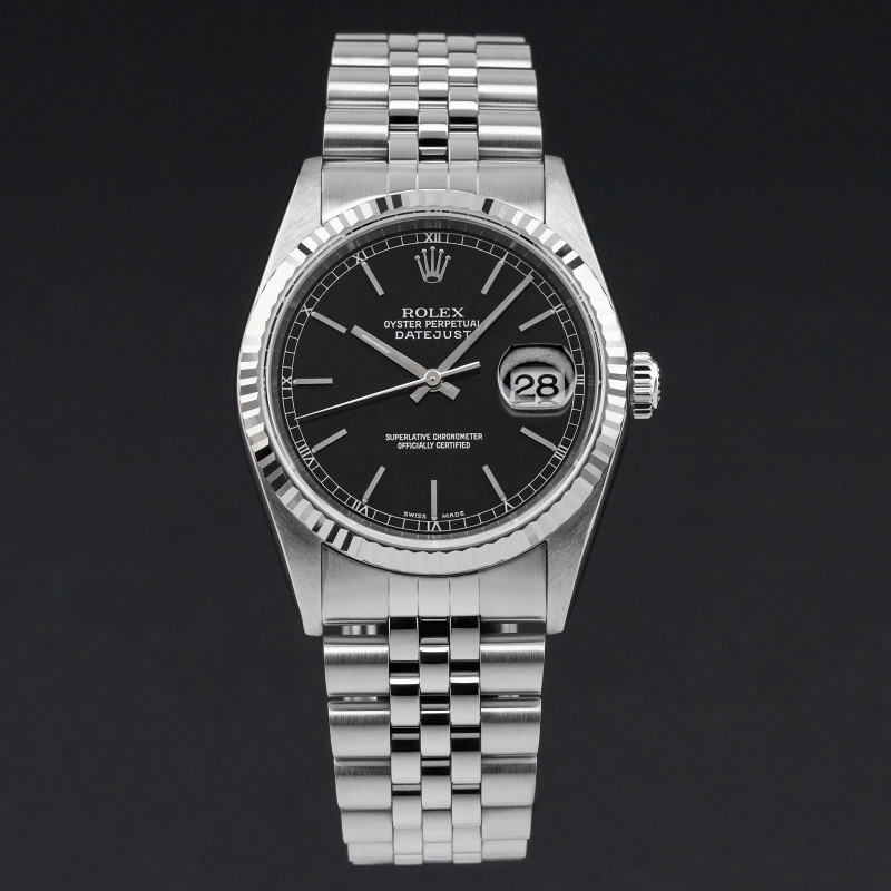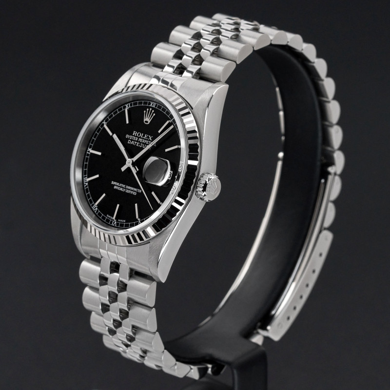 This Rolex Datejust 16234 features a Black dial and is crafted from stainless steel, with a production year of 2002.
