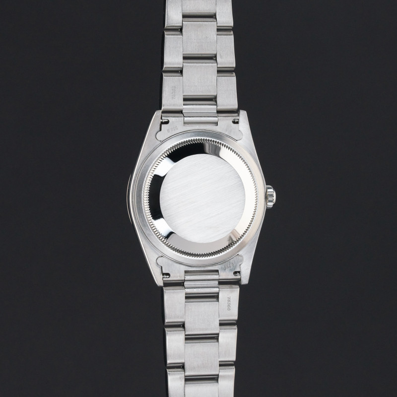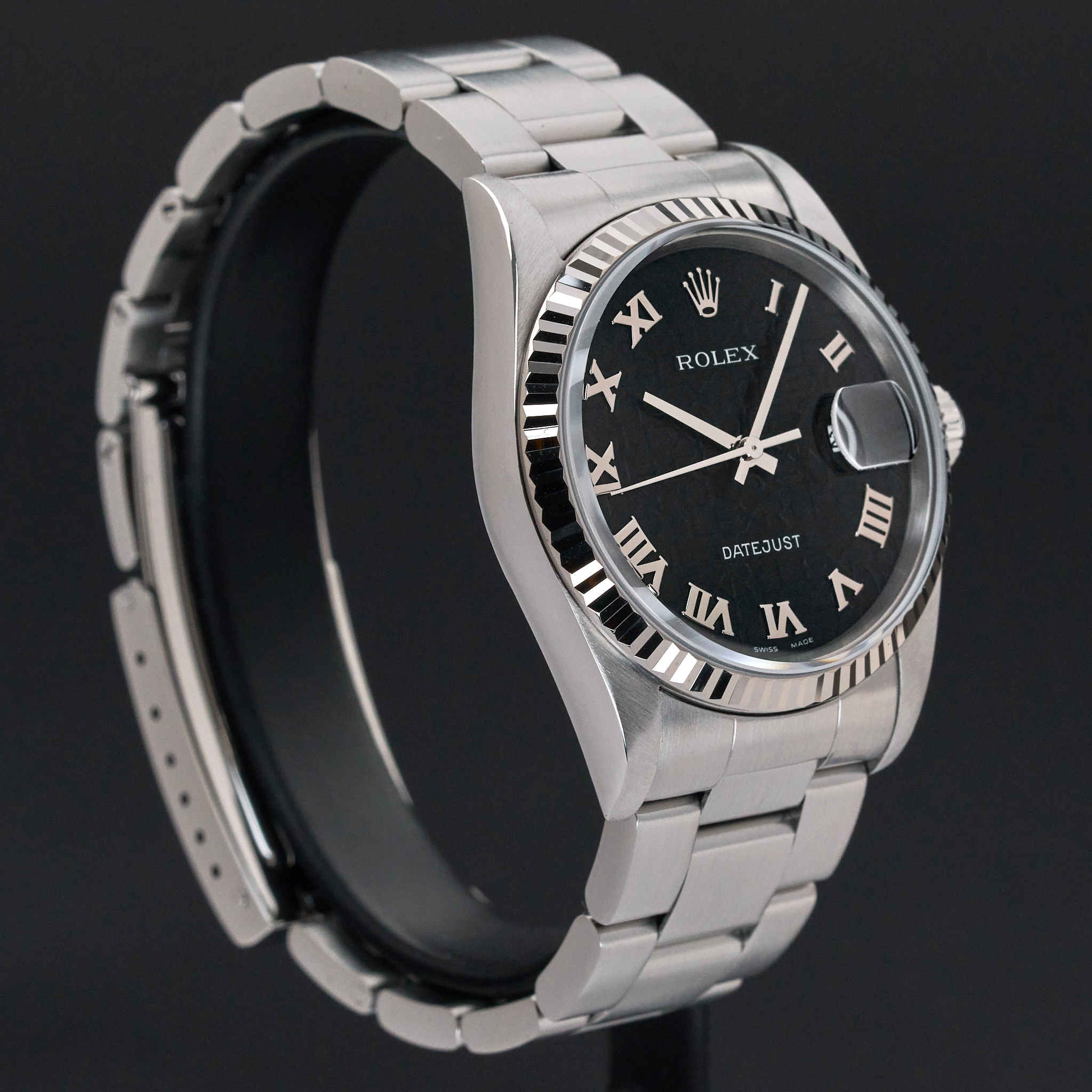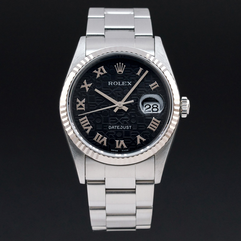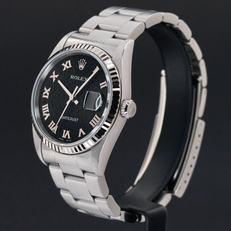 This Rolex Datejust 16234 features a Black Jubilee Roman dial and is crafted from stainless steel, with a production year of 2002.