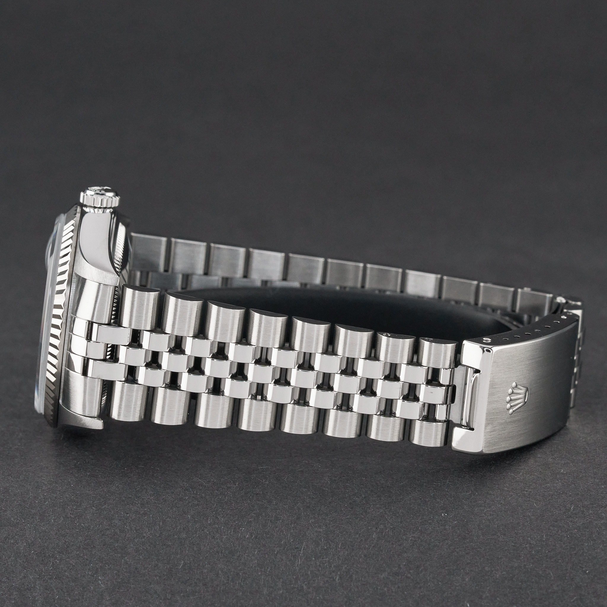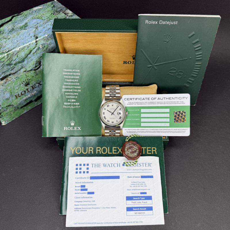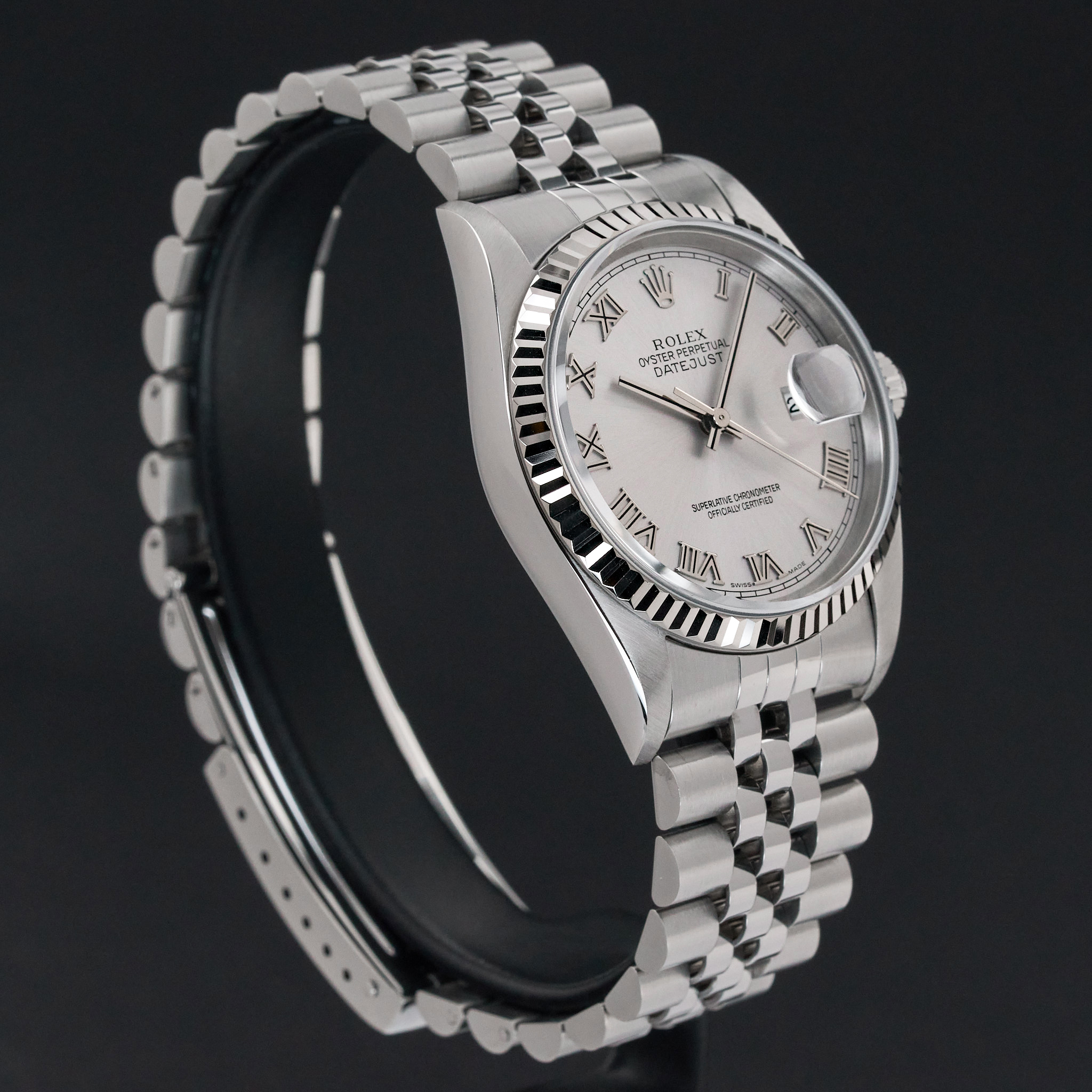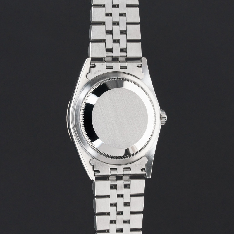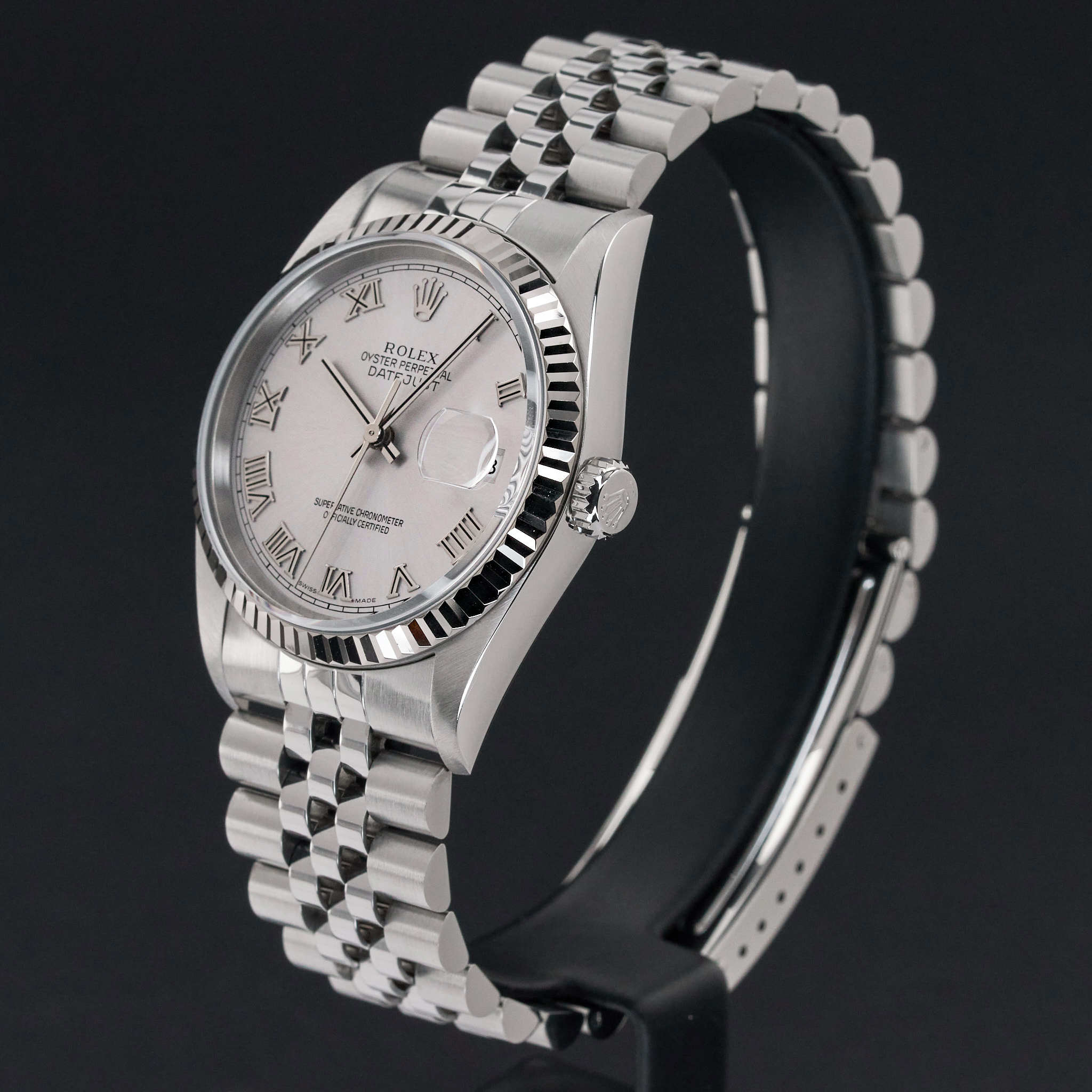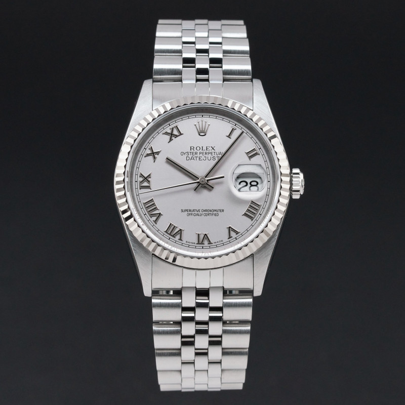 This Rolex Datejust 16234 features a Grey Roman dial and is crafted from stainless steel, with a production year of 2002.