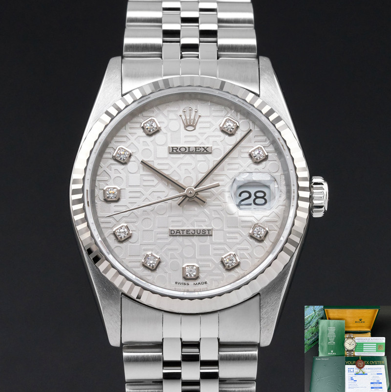 This Rolex Datejust 16234 features a Silver jubilee diamond dial and is crafted from stainless steel, with a production year of 2002.