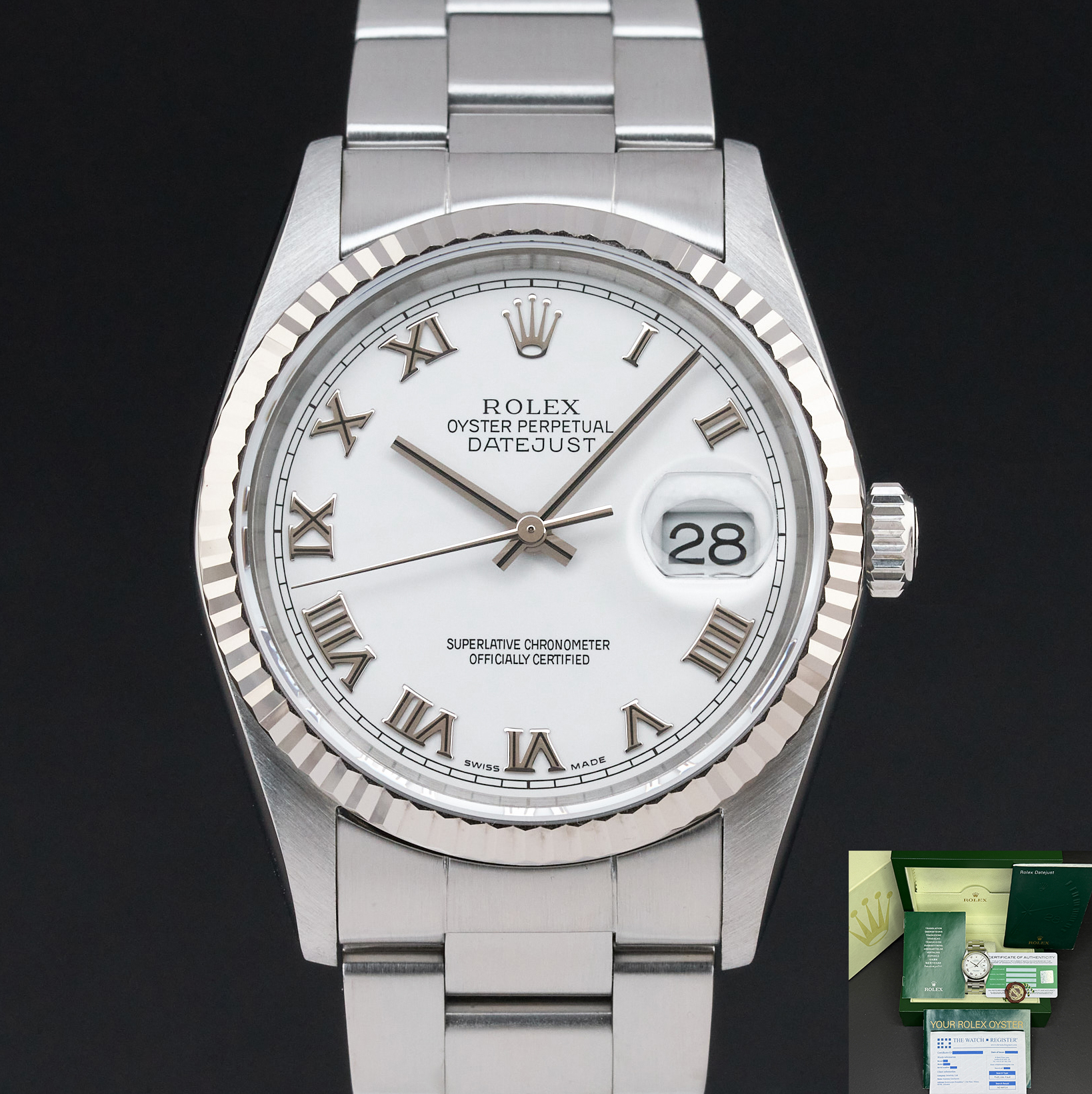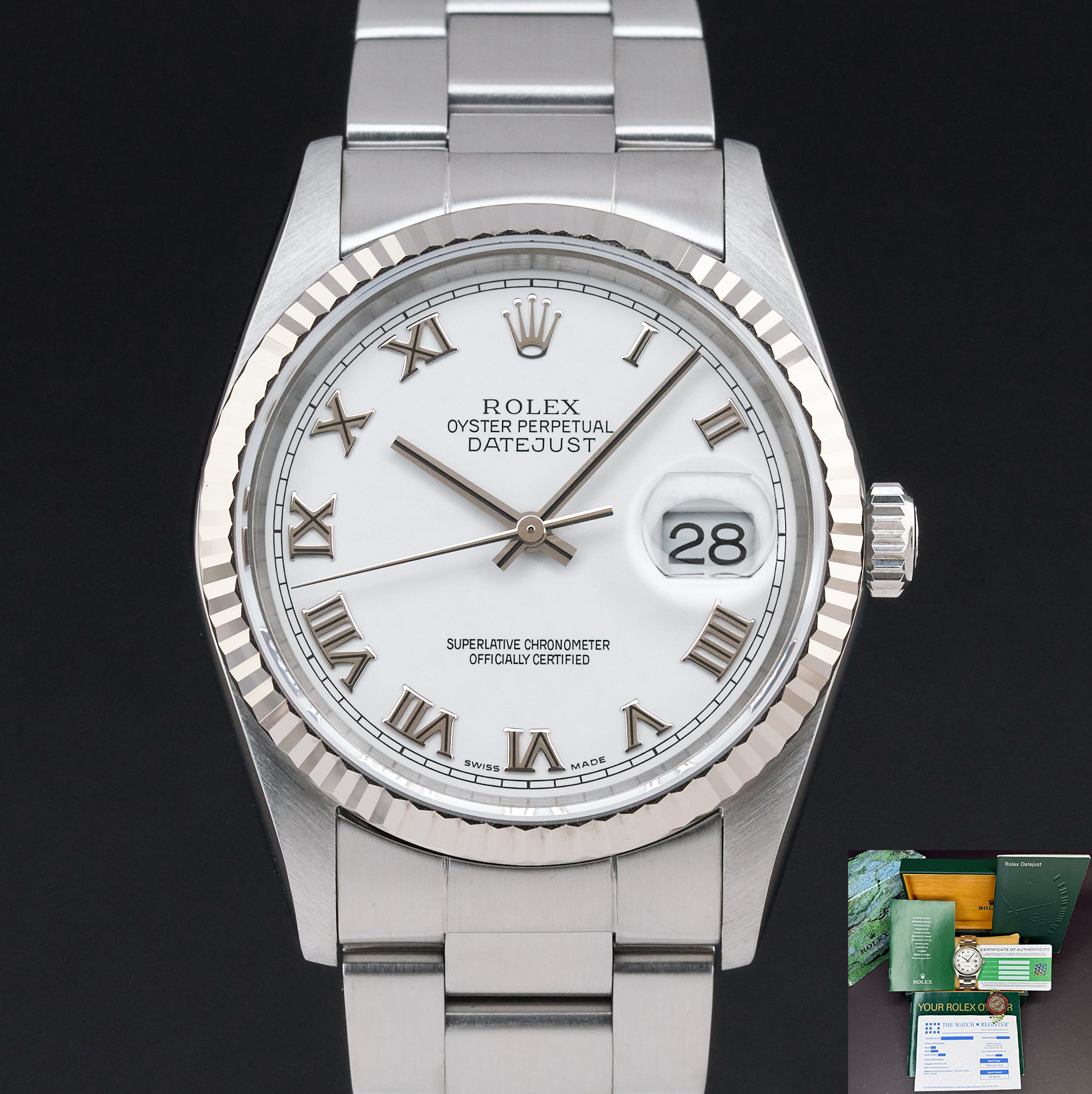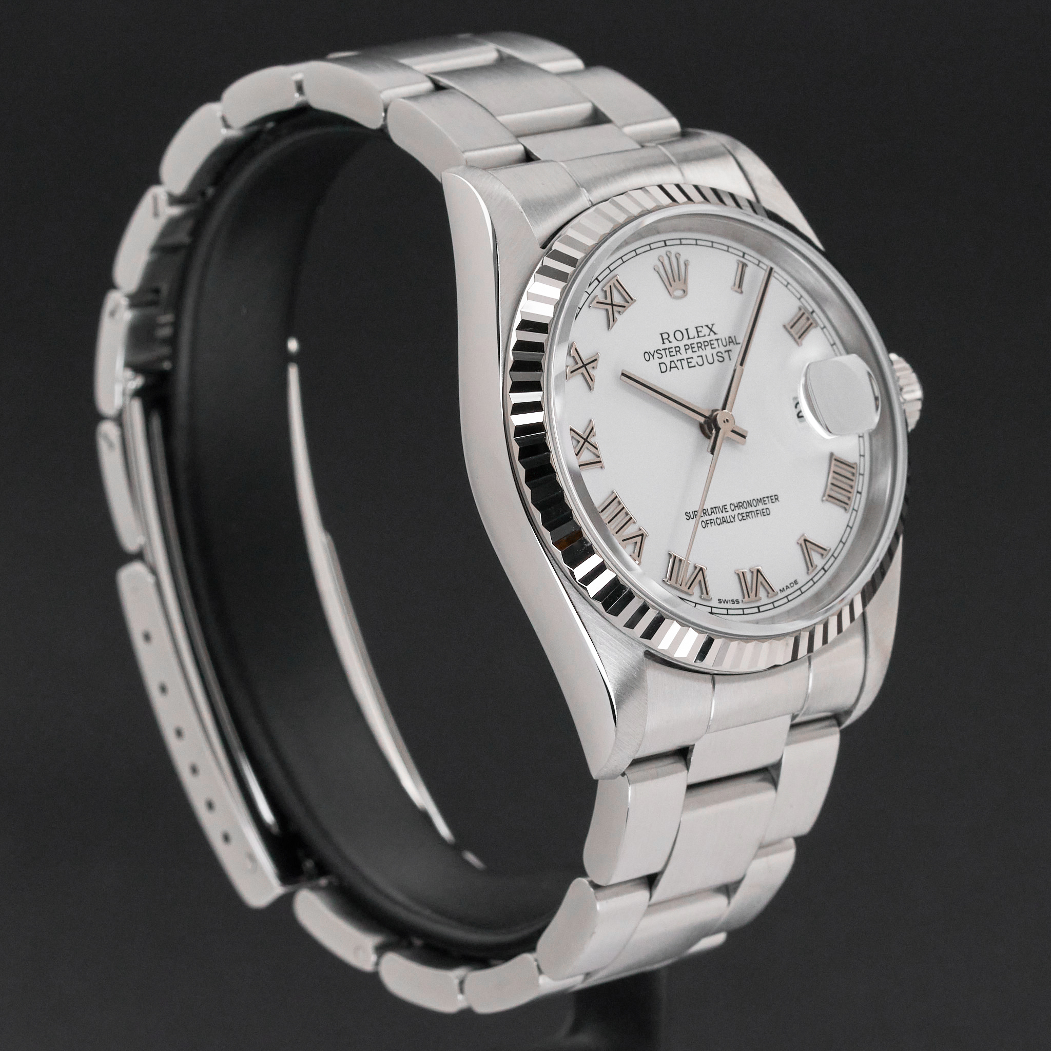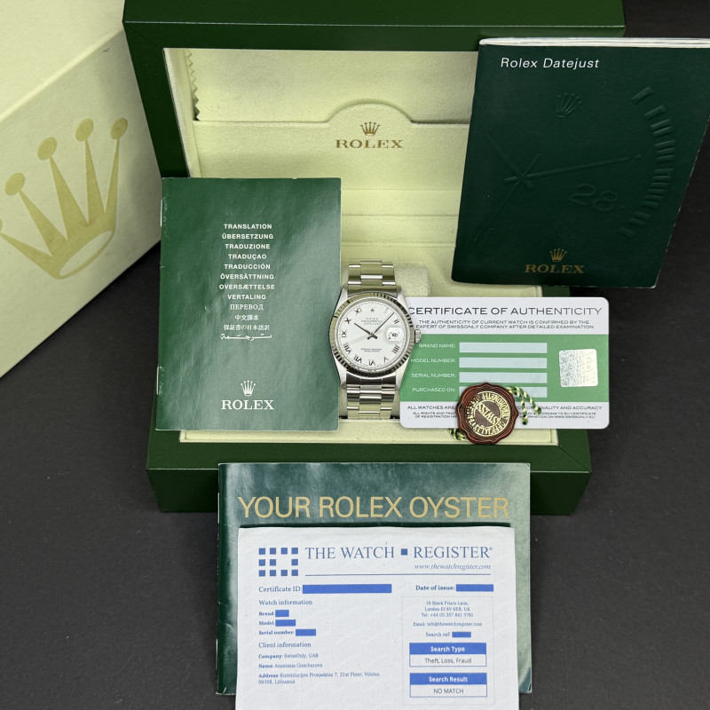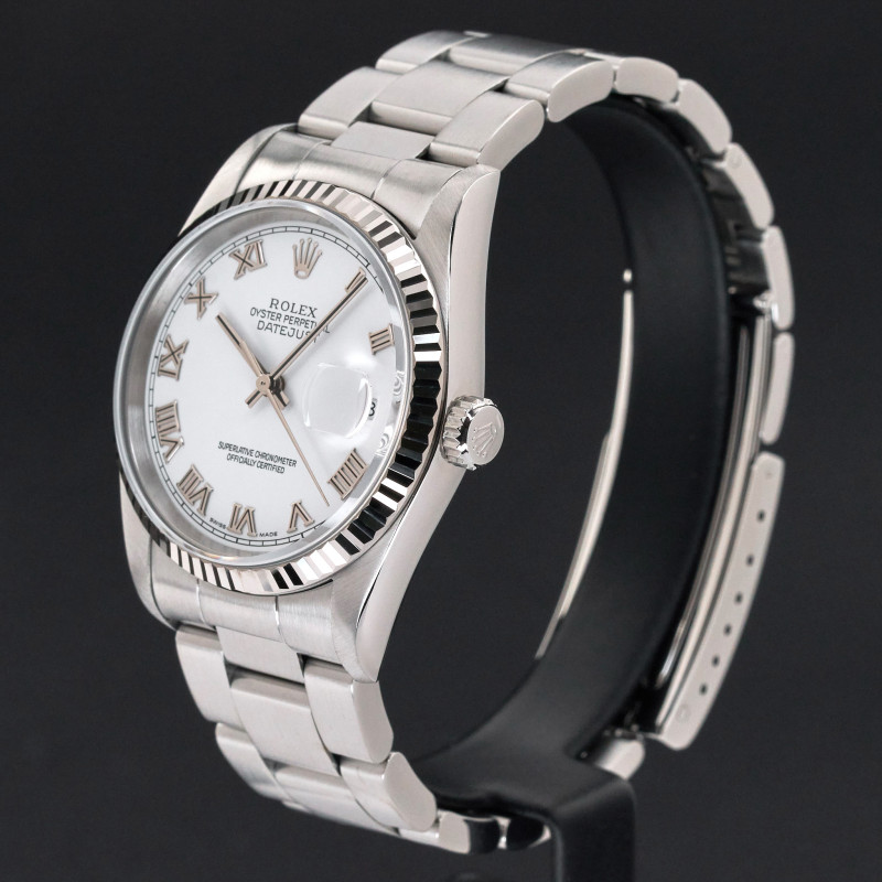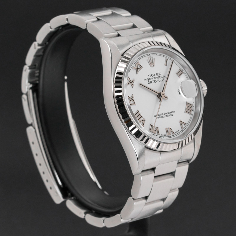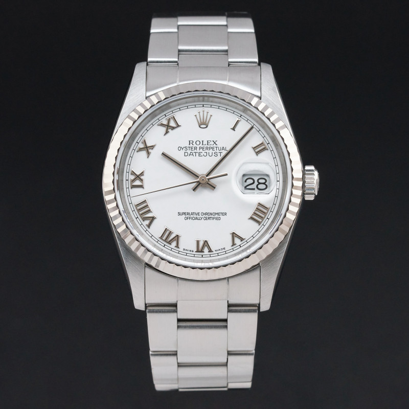 This Rolex Datejust 16234 features a White Roman dial and is crafted from stainless steel, with a production year of 2005.