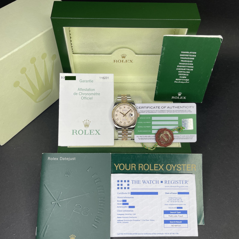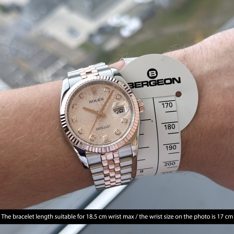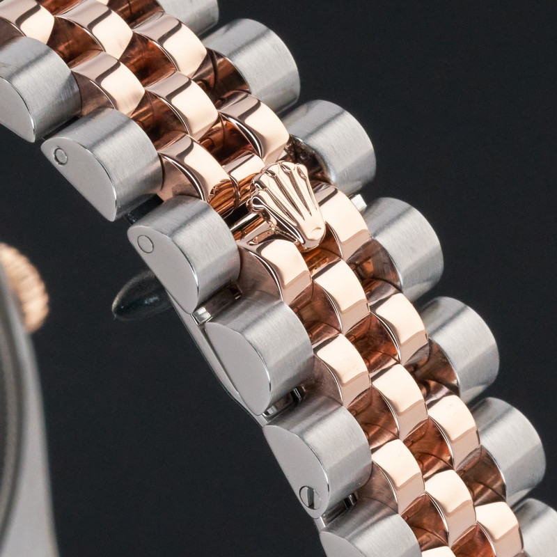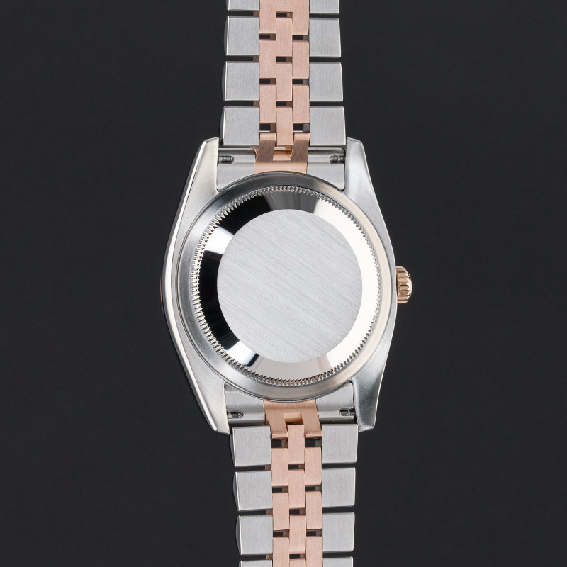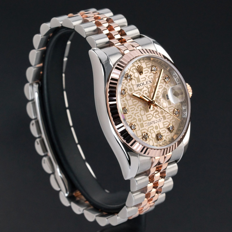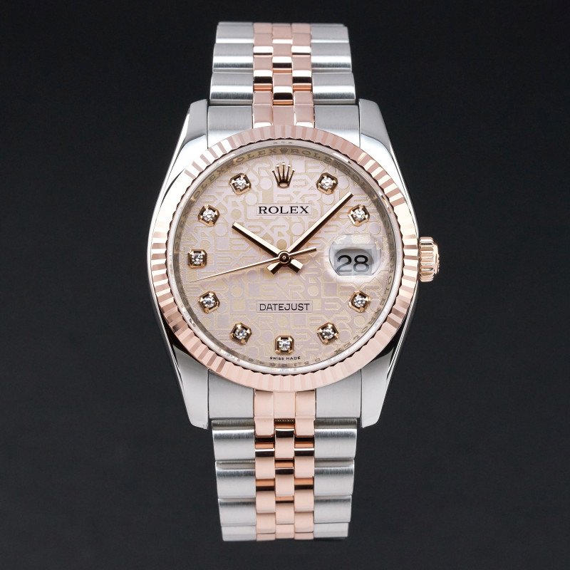 This Rolex Datejust 116231 features a Pink jubilee diamond dial and is crafted from 18K rose gold and stainless steel, with a production year of 2006.