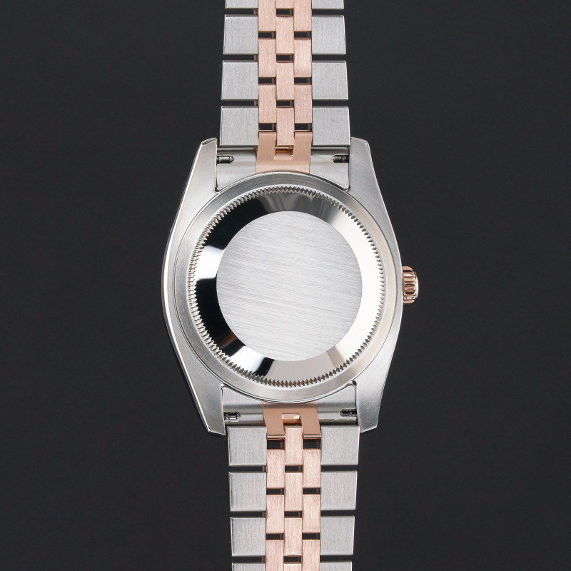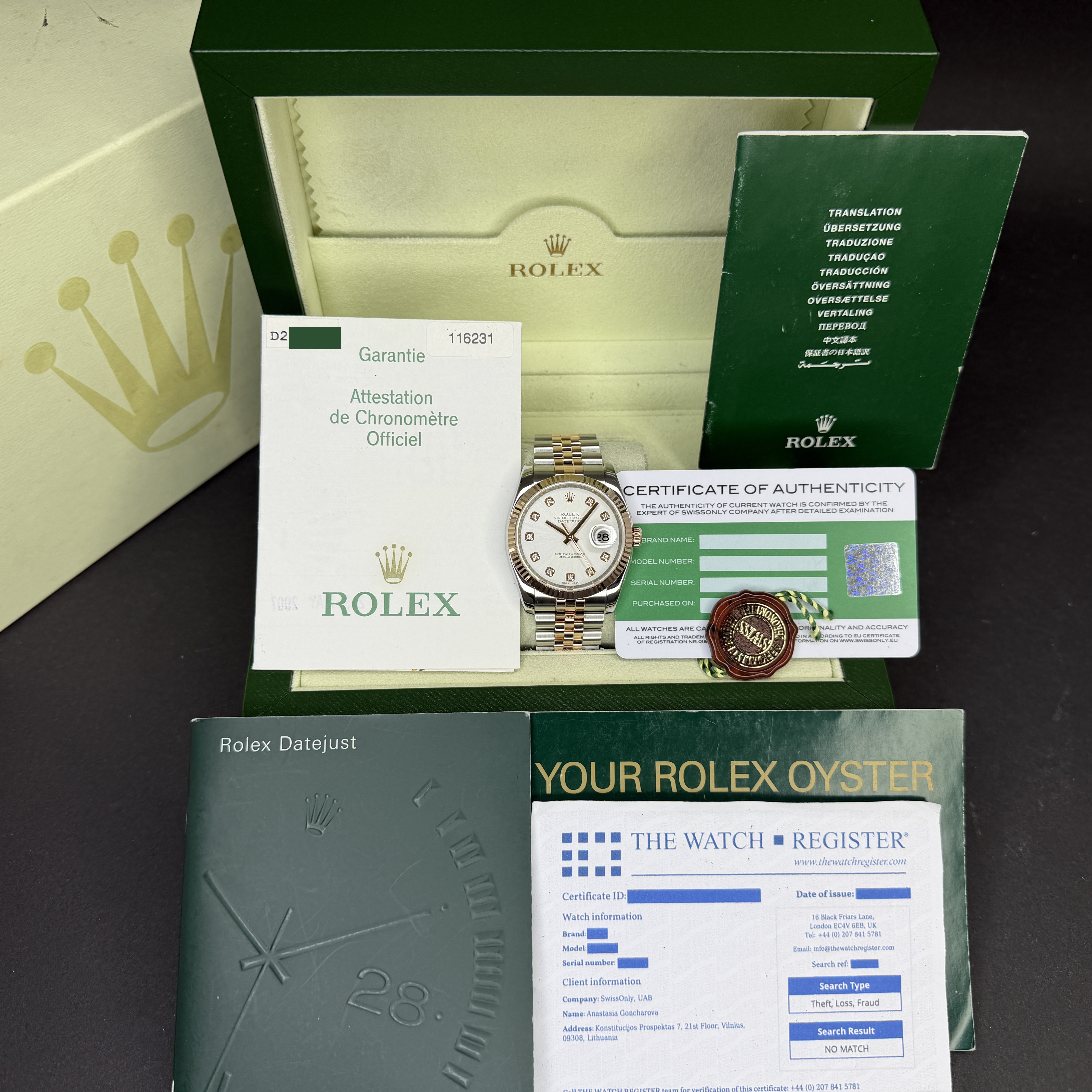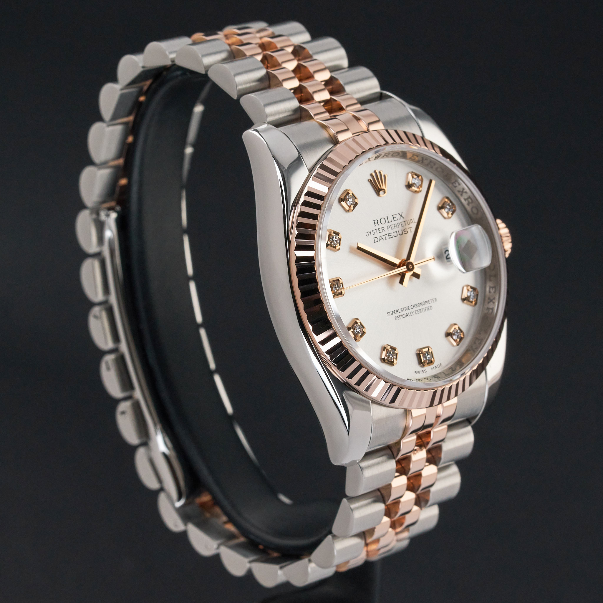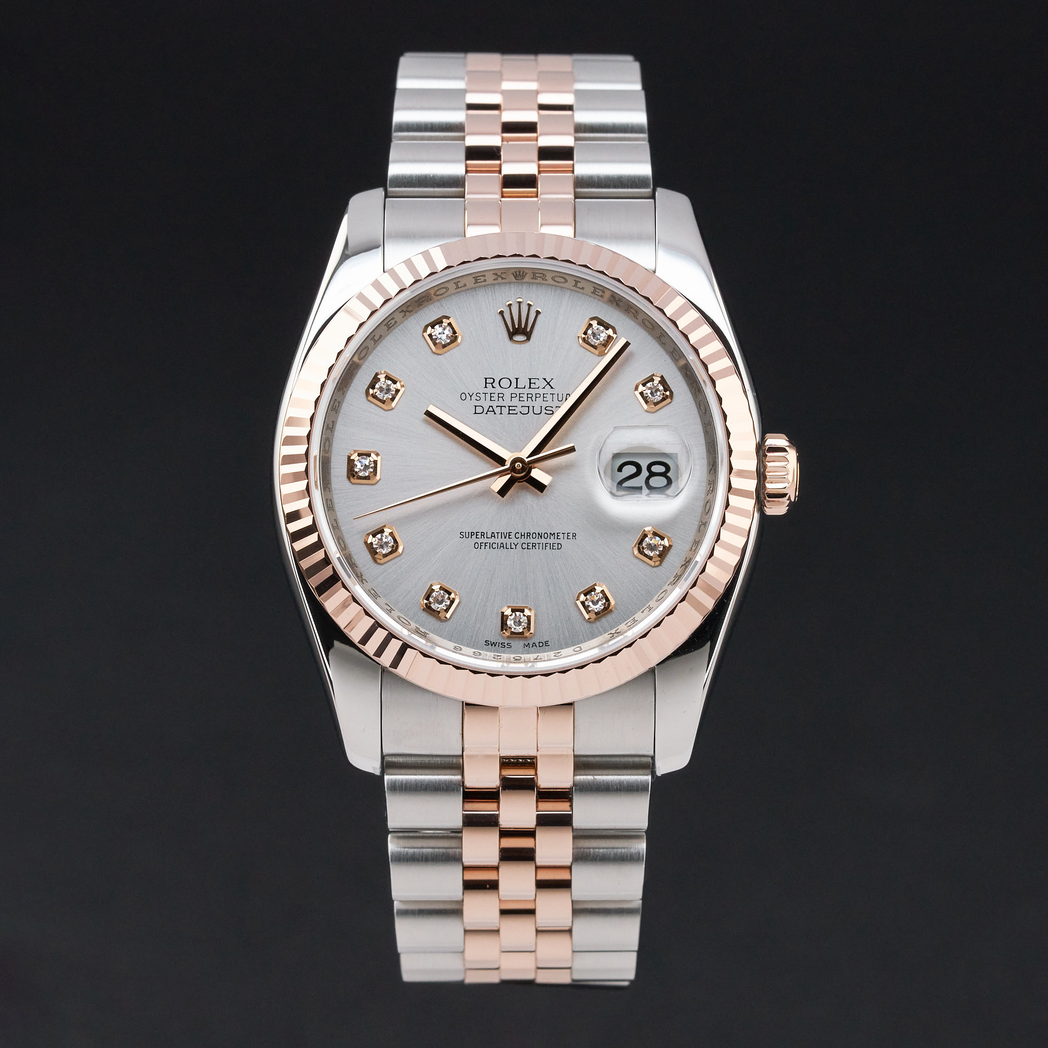 This Rolex Datejust 116231 features a Silver diamond dial and is crafted from 18K rose gold and stainless steel, with a production year of 2006.