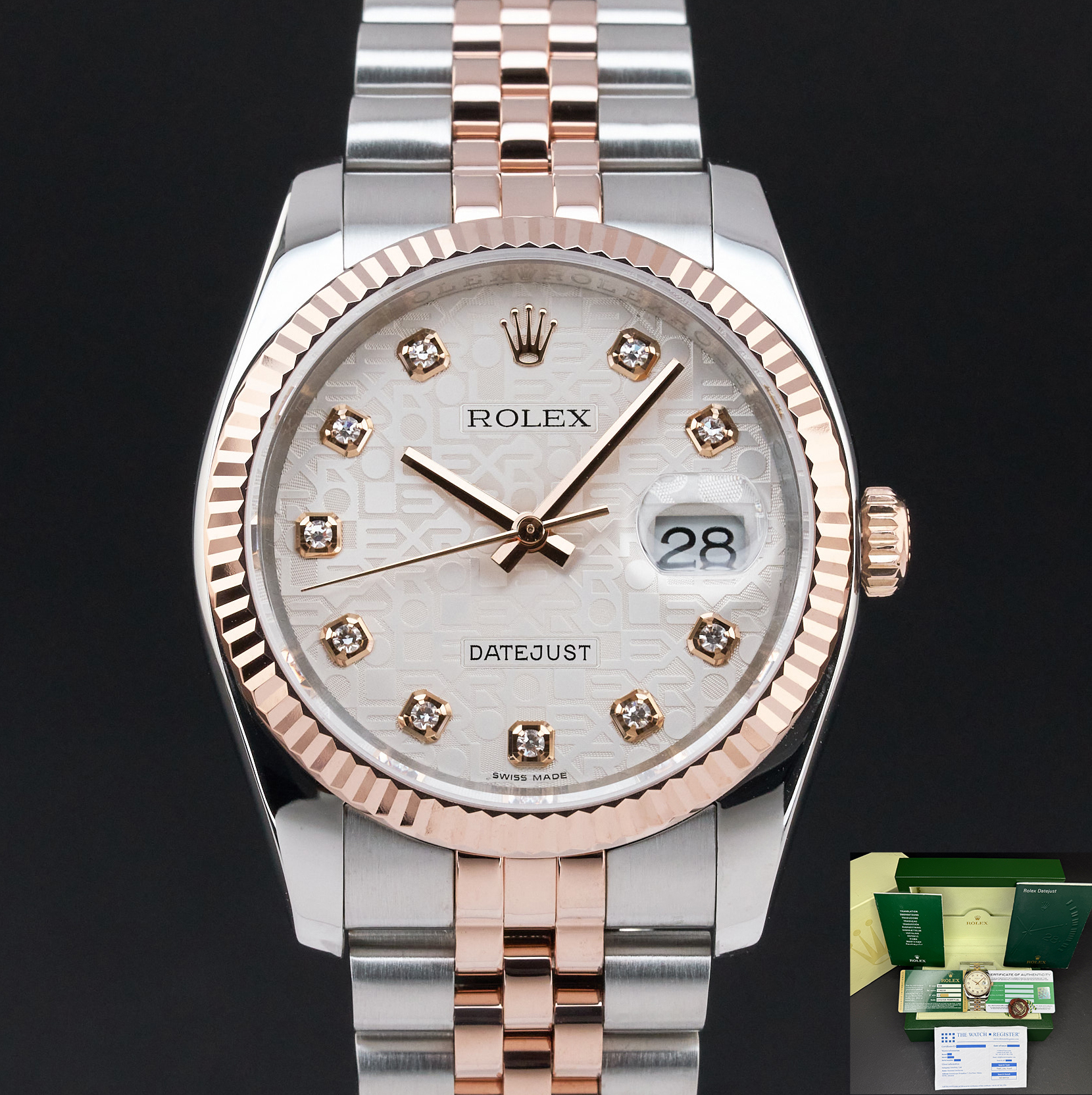This Rolex Datejust 116231 features a Silver jubilee diamond dial and is crafted from 18K rose gold and stainless steel, with a production year of 2009.