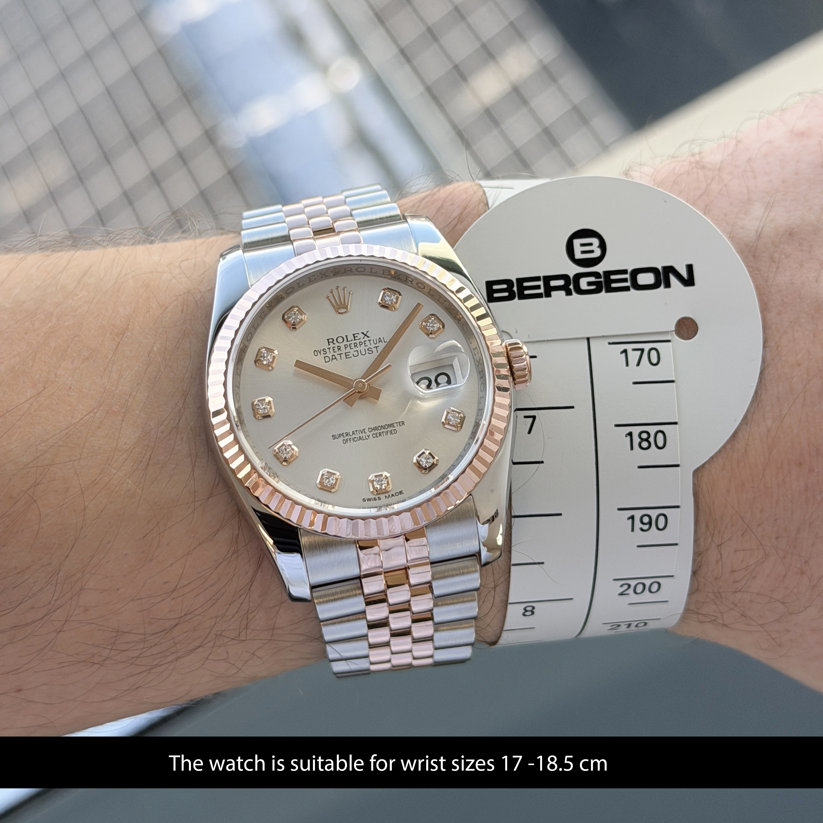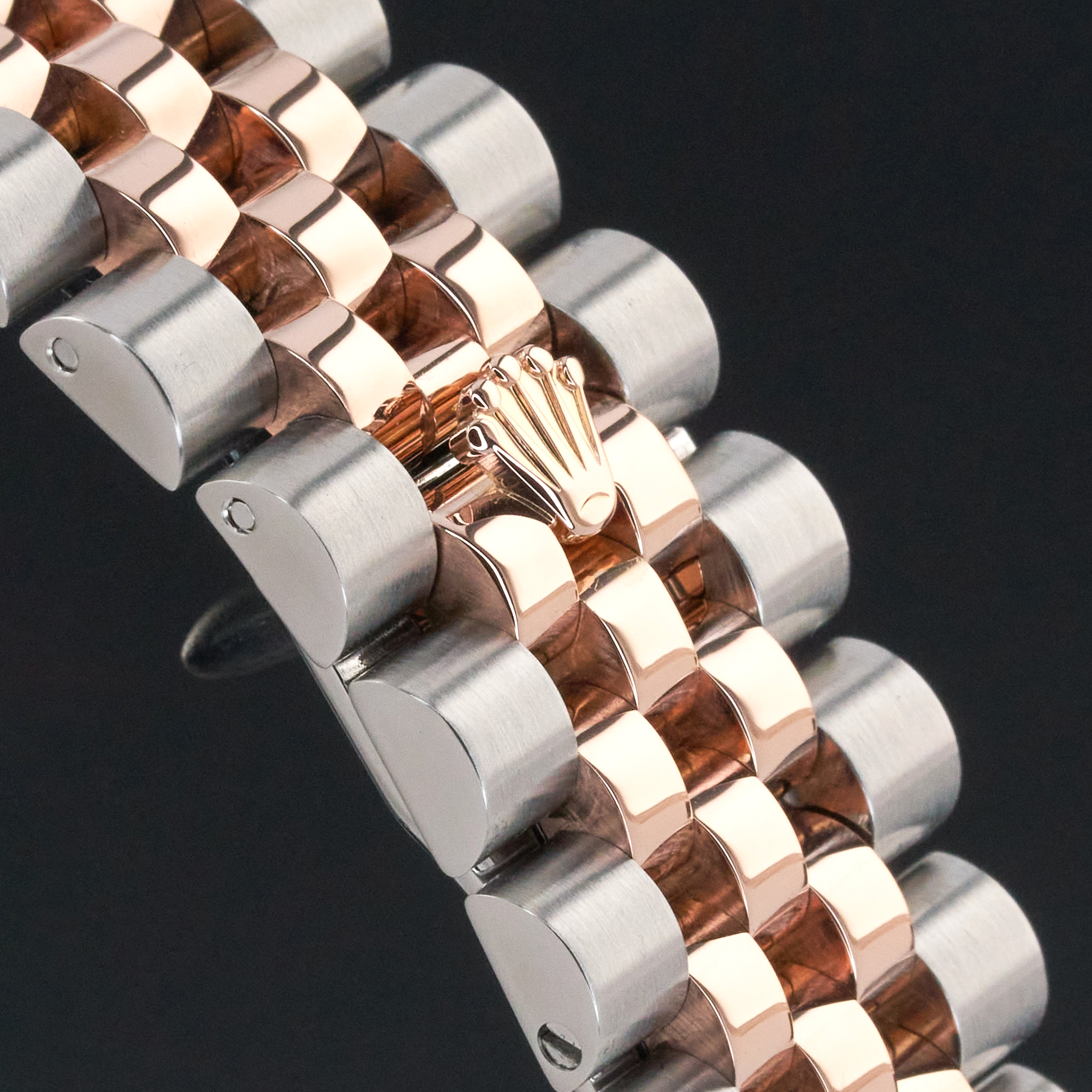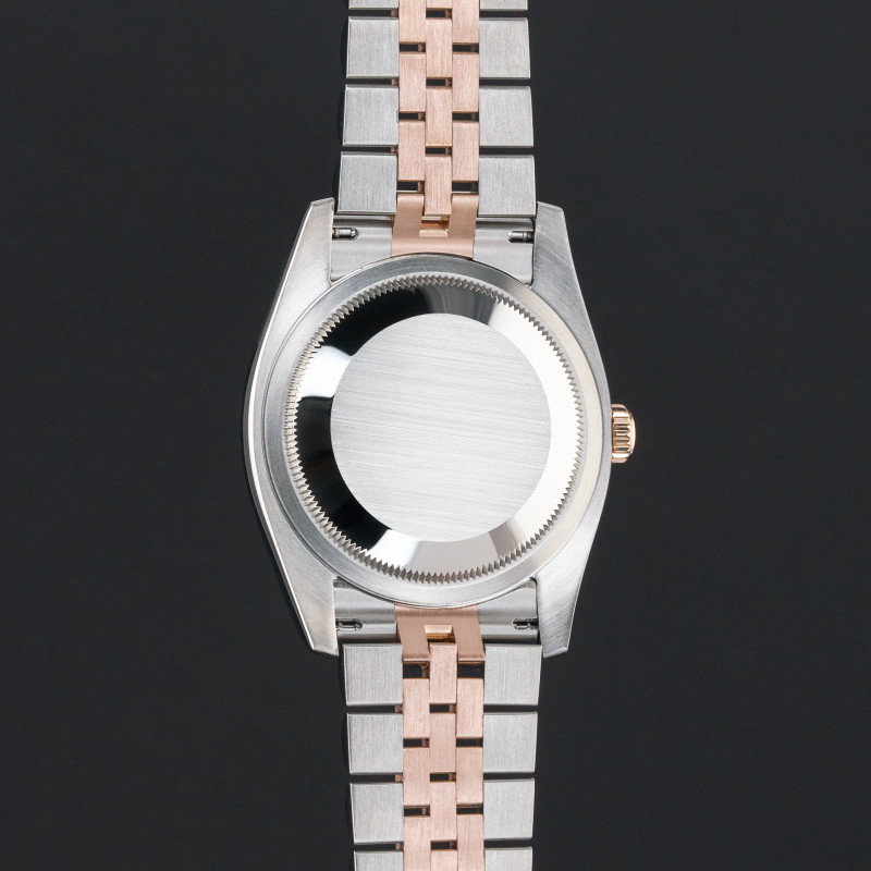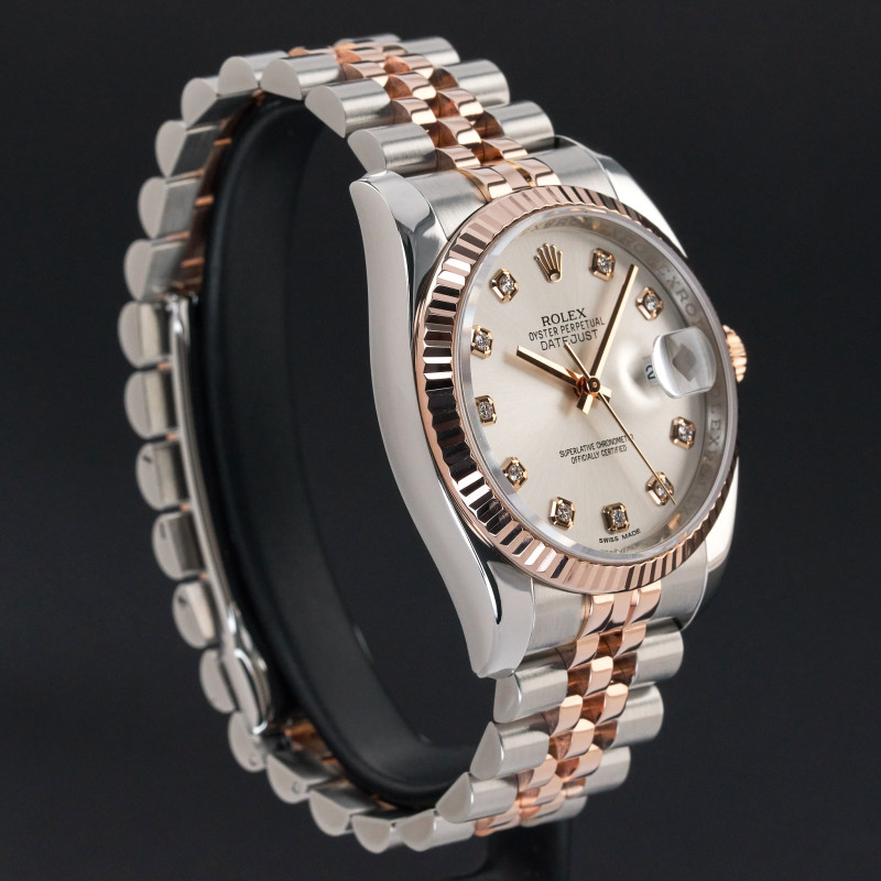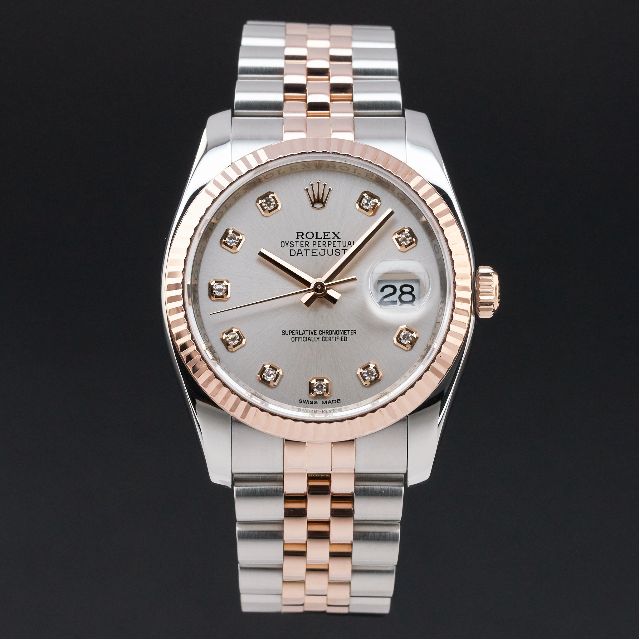 This Rolex Datejust 116231 features a Silver diamond dial and is crafted from 18K rose gold and stainless steel, with a production year of 2010.