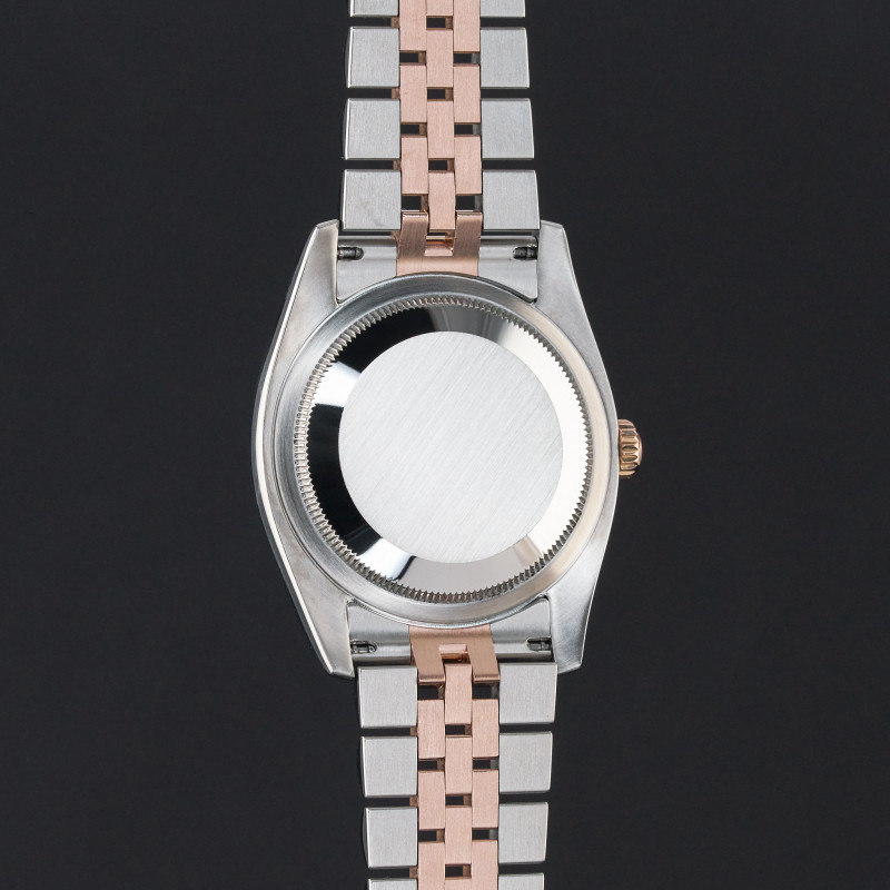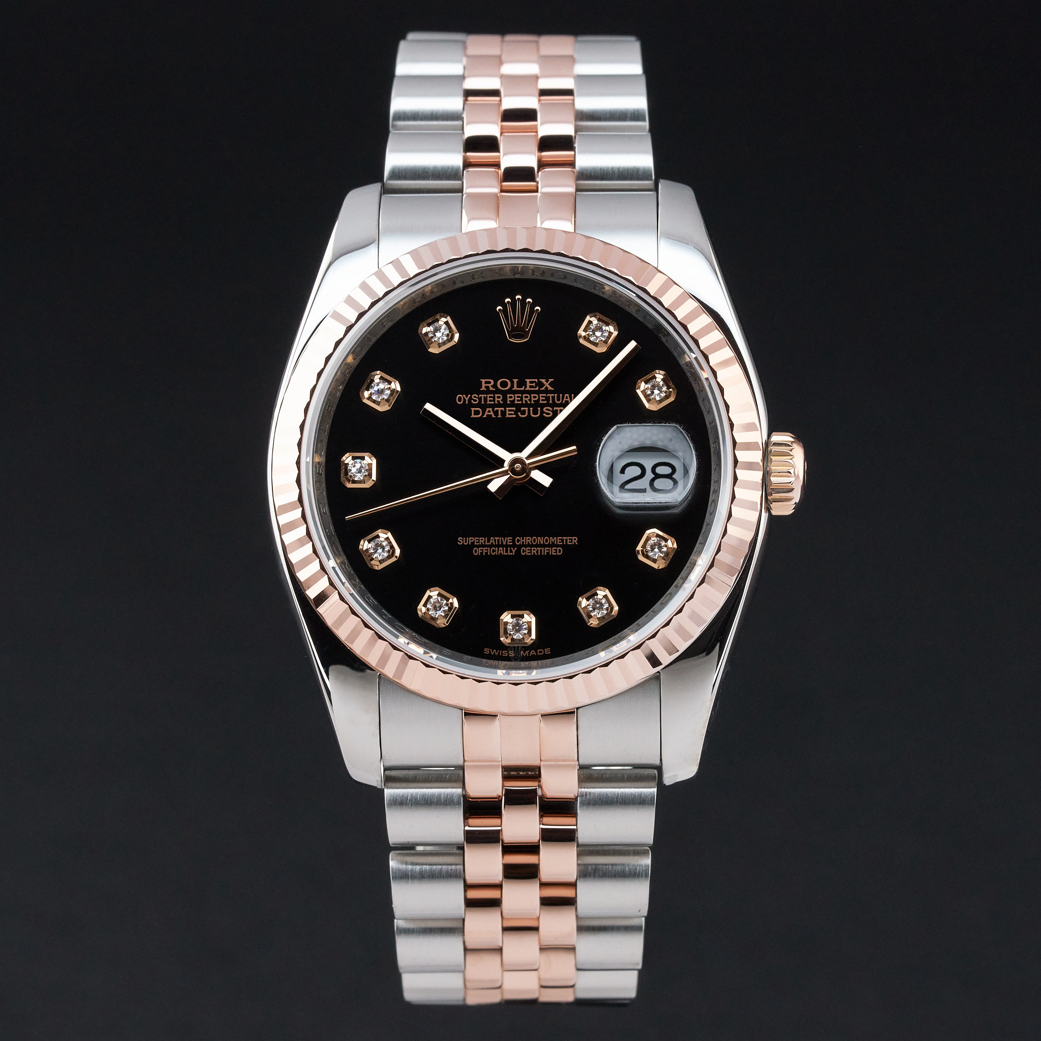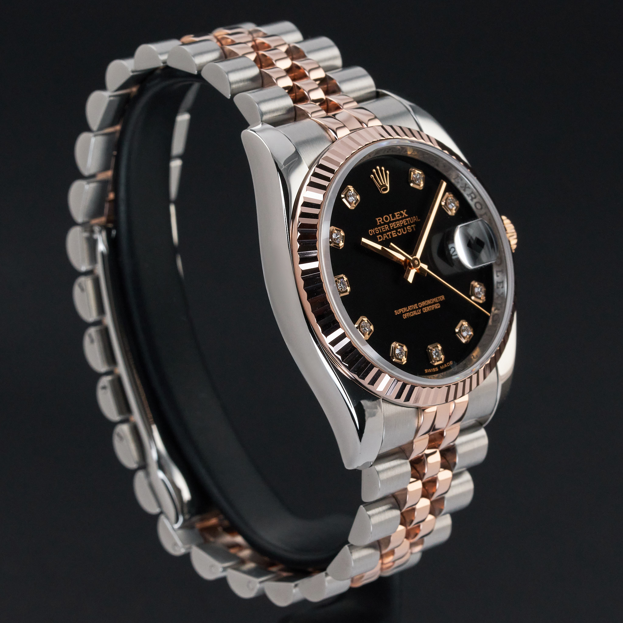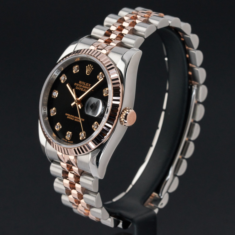 This Rolex Datejust 116231 features a Black diamond dial and is crafted from 18K rose gold and stainless steel.