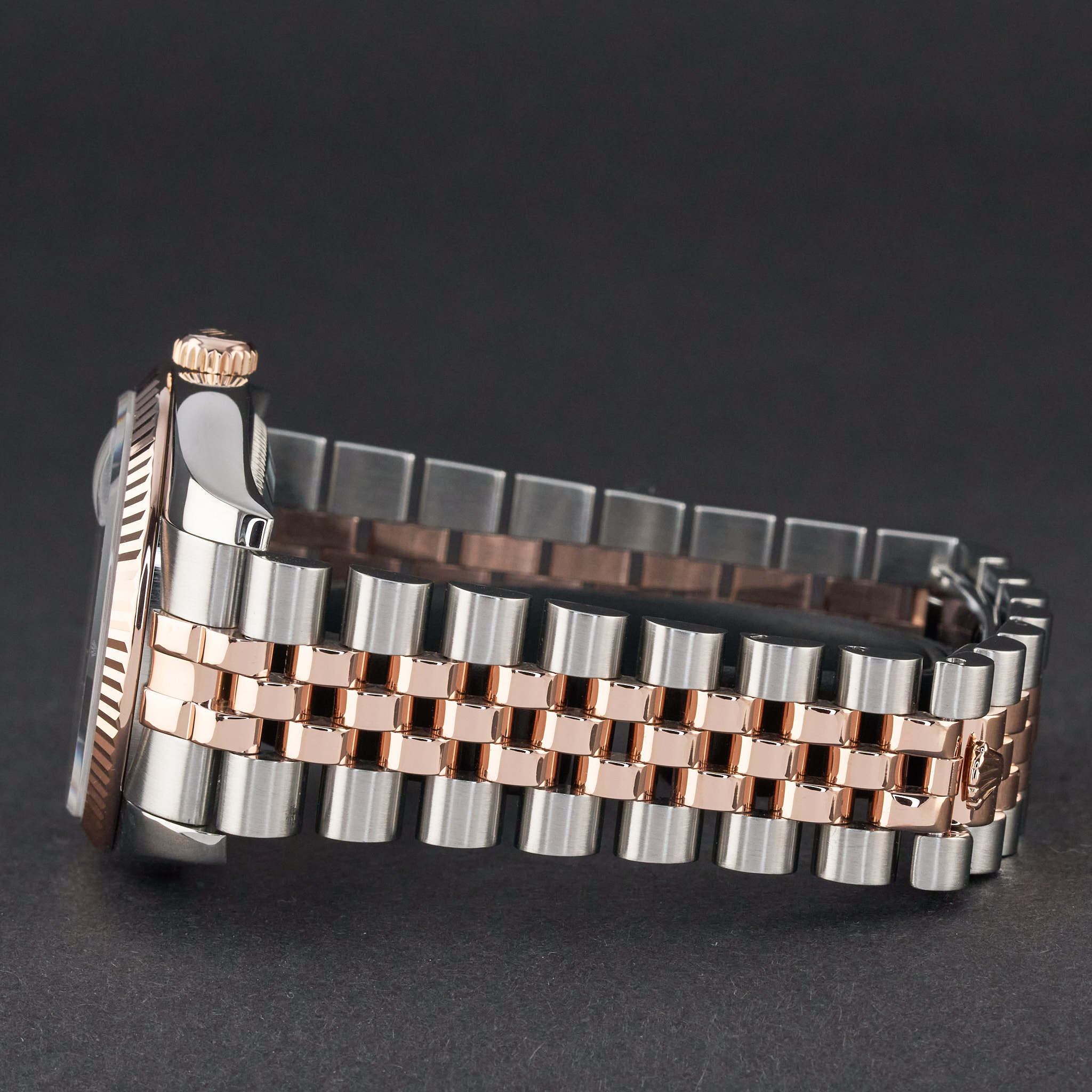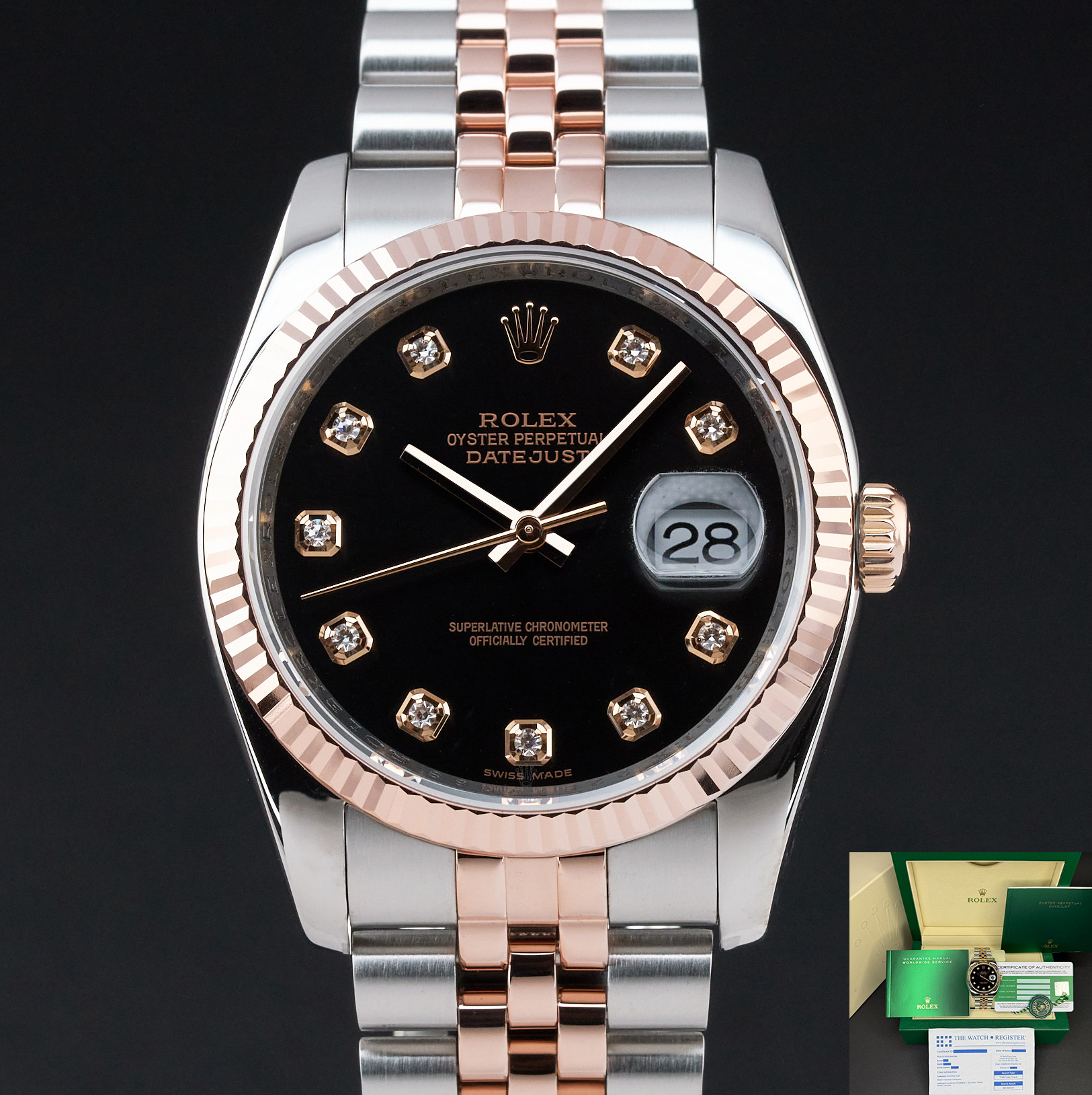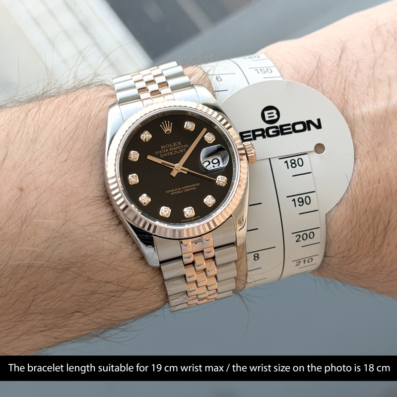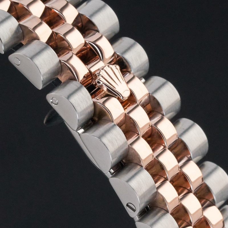 This Rolex Datejust 116231 features a Black diamond dial and is crafted from 18K rose gold and stainless steel.