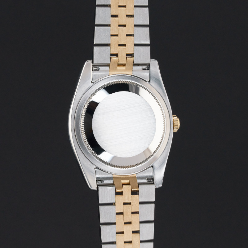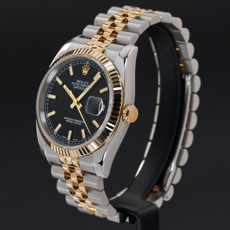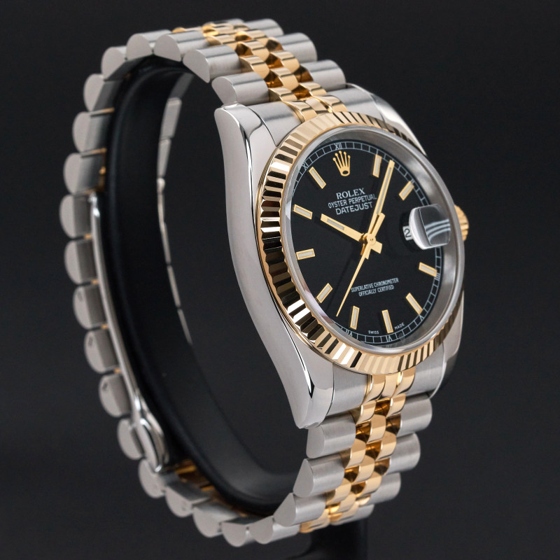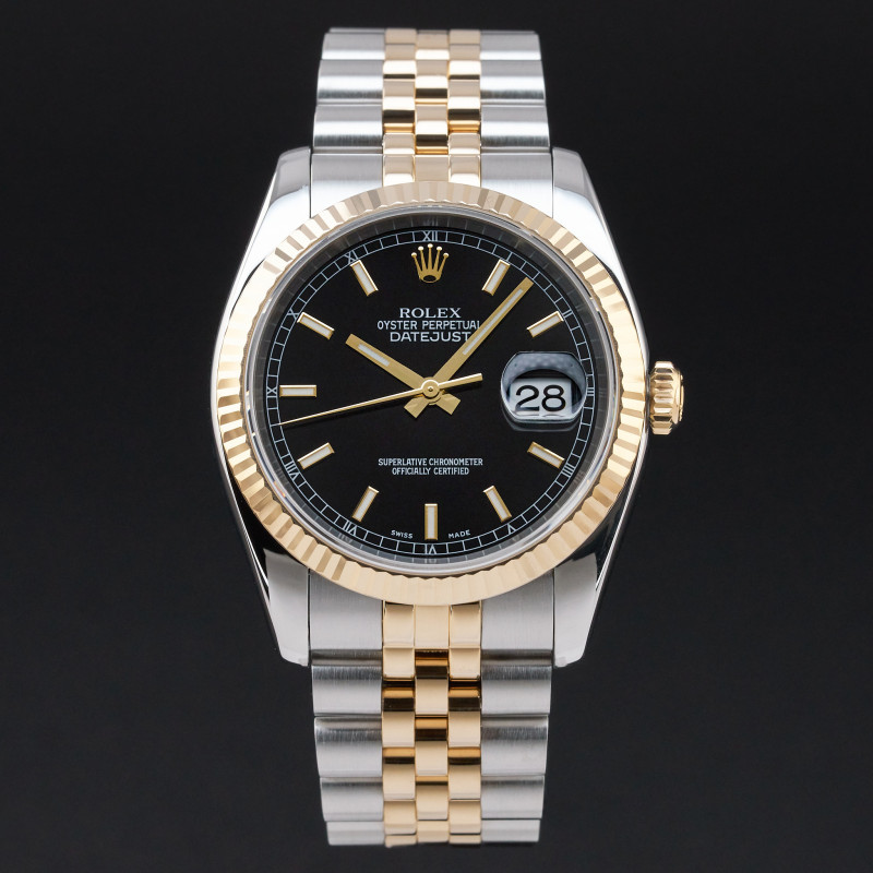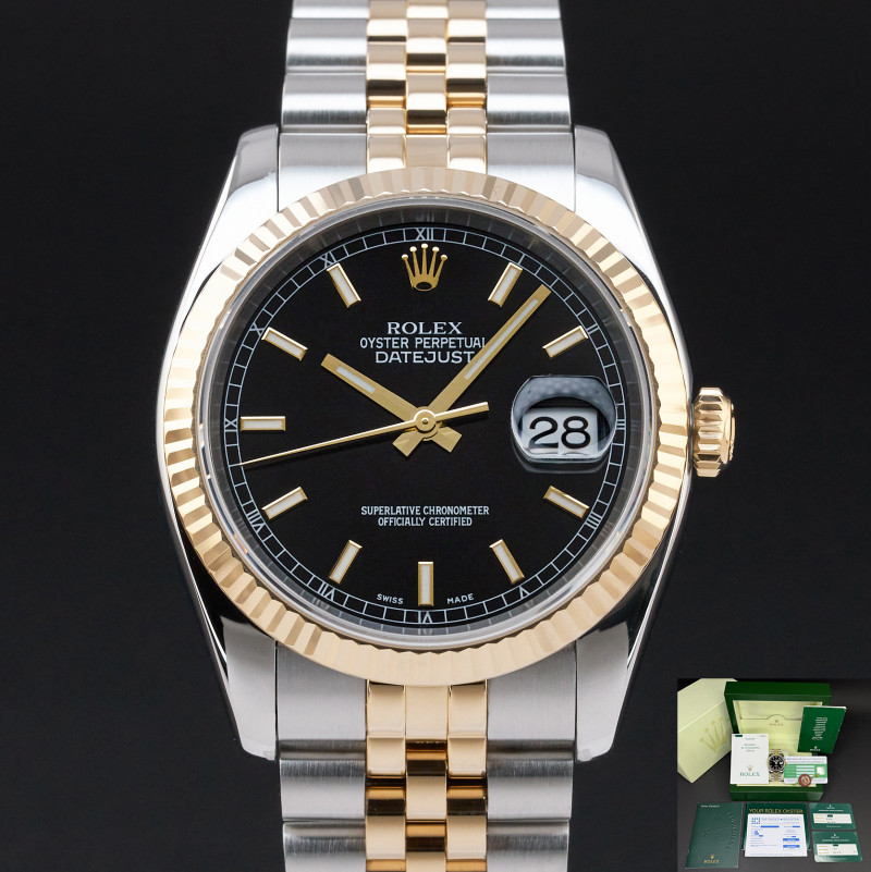 This Rolex Datejust 116233 features a Black dial and is crafted from 18K yellow gold and stainless steel, with a production year of 2004.
