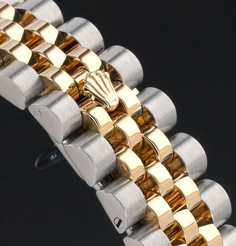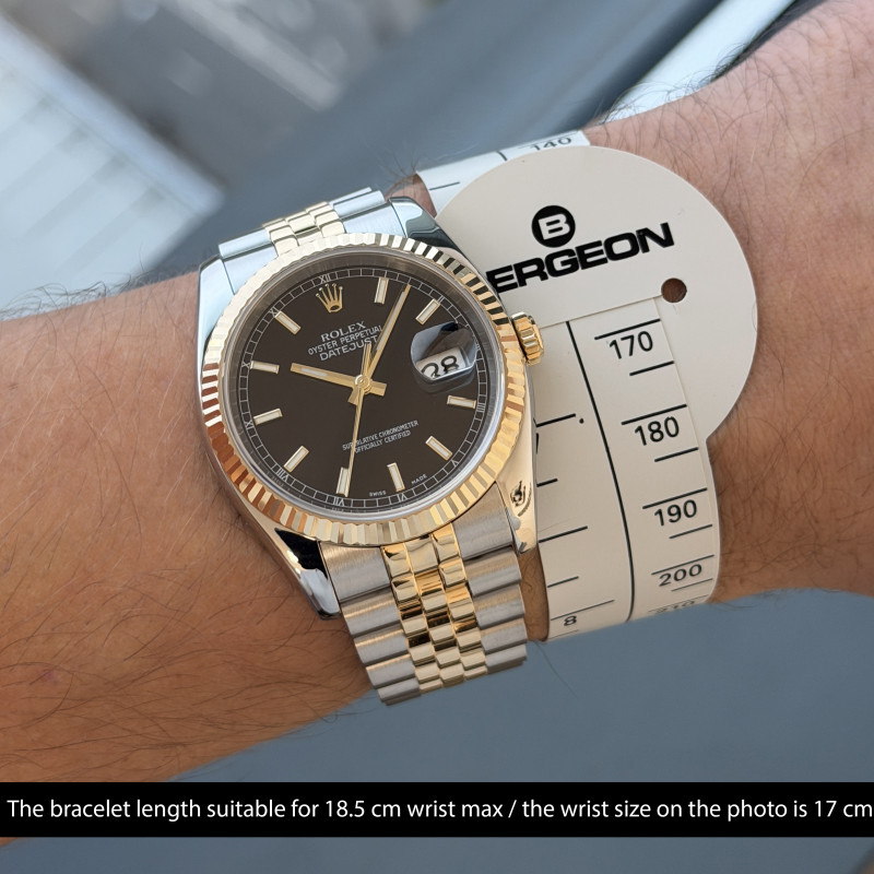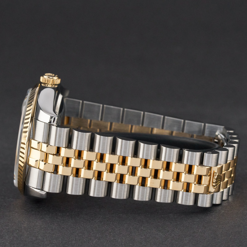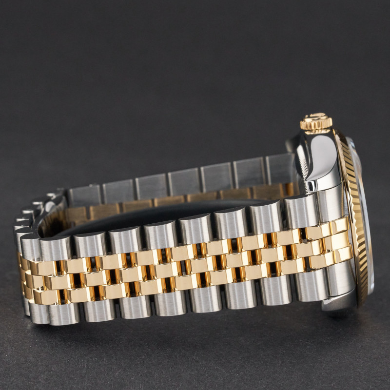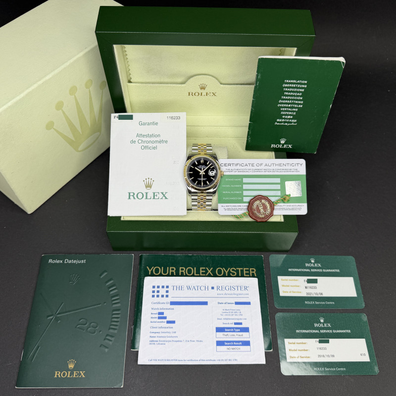 This Rolex Datejust 116233 features a Black dial and is crafted from 18K yellow gold and stainless steel, with a production year of 2004.