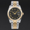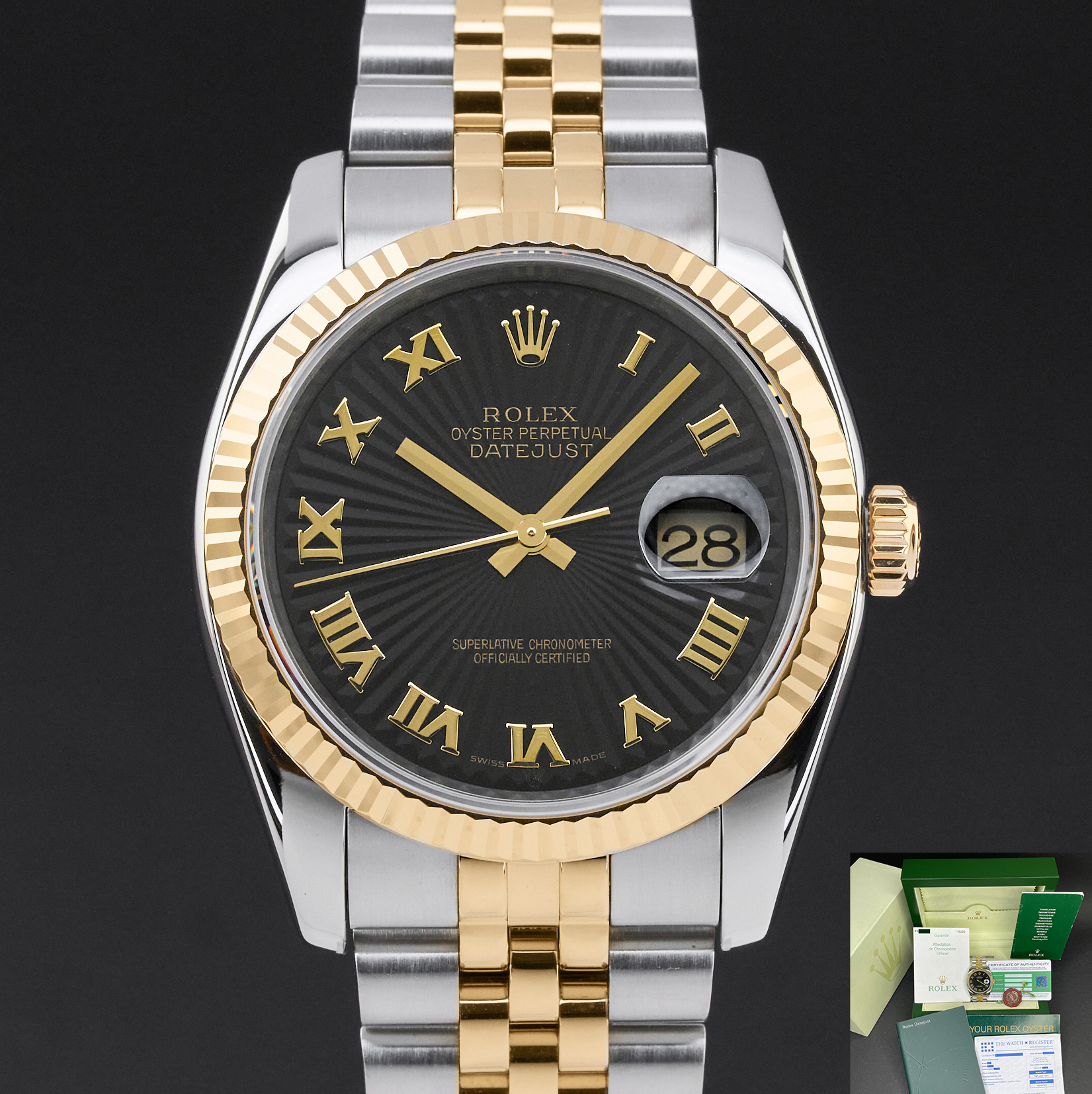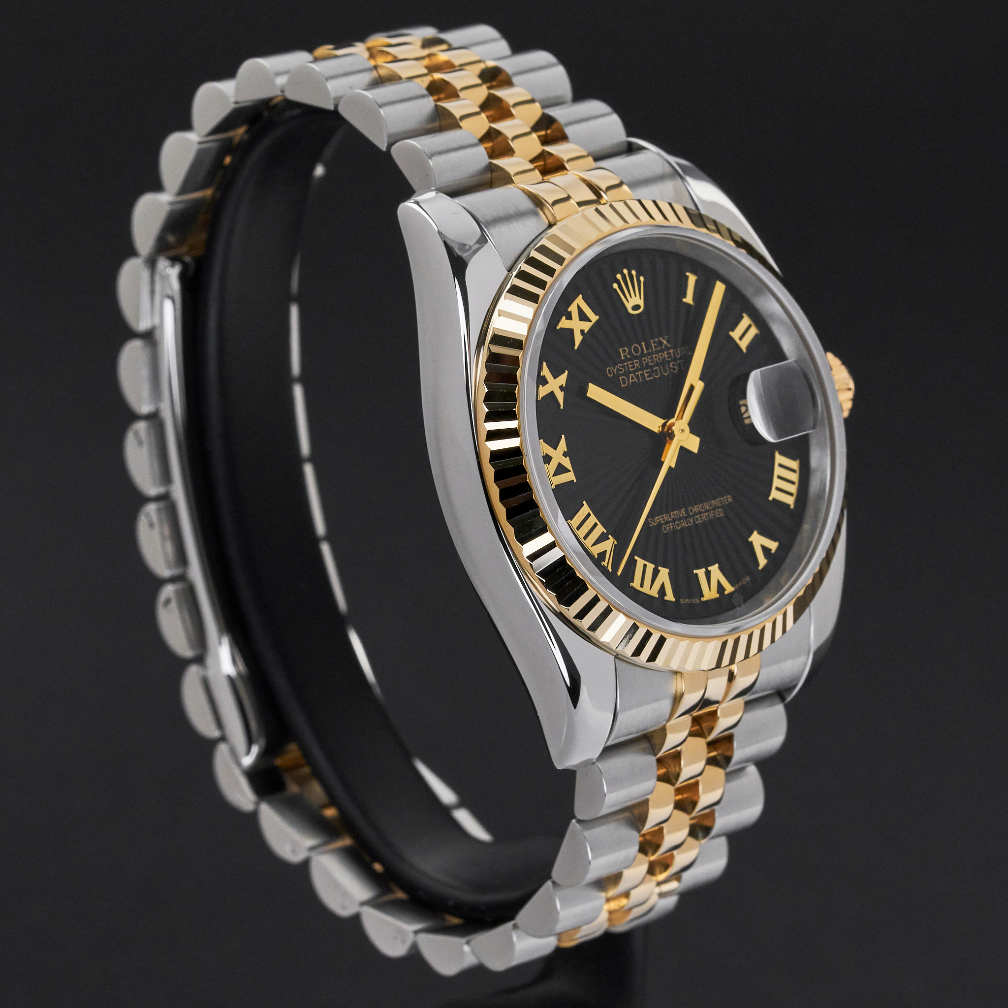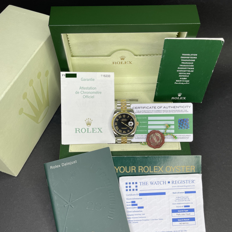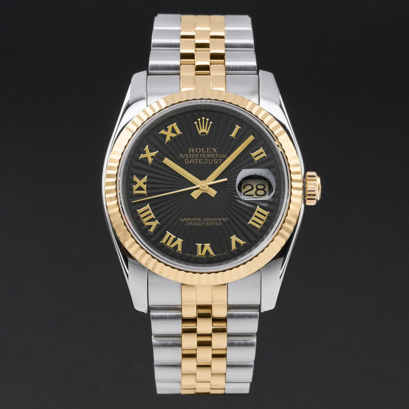 This Rolex Datejust 116233 features a Black sunbeam Roman dial and is crafted from 18K yellow gold and stainless steel, with a production year of 2004.