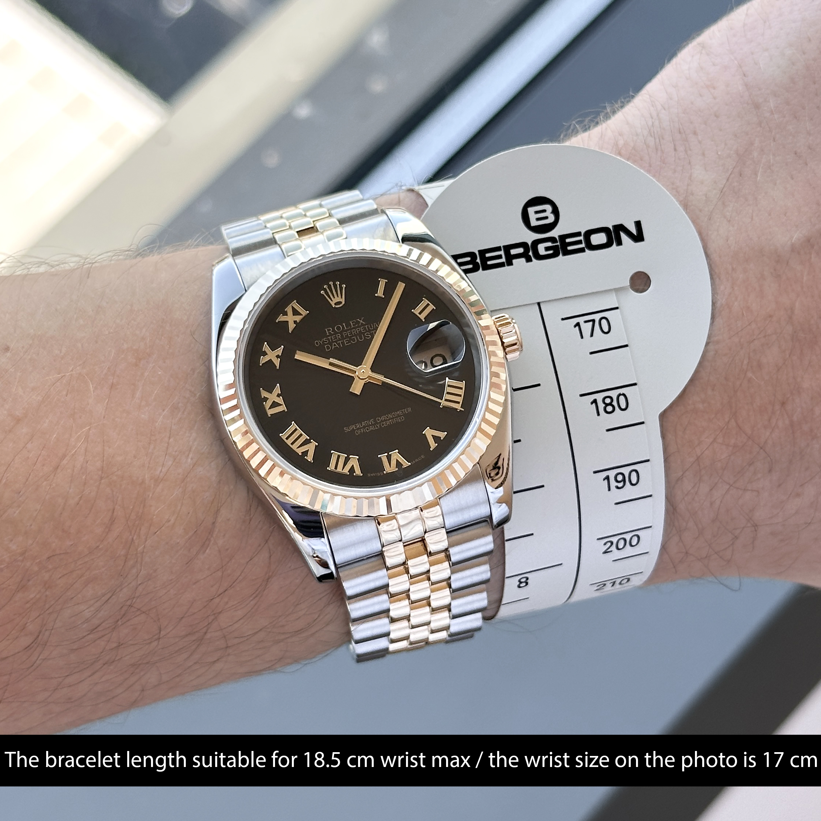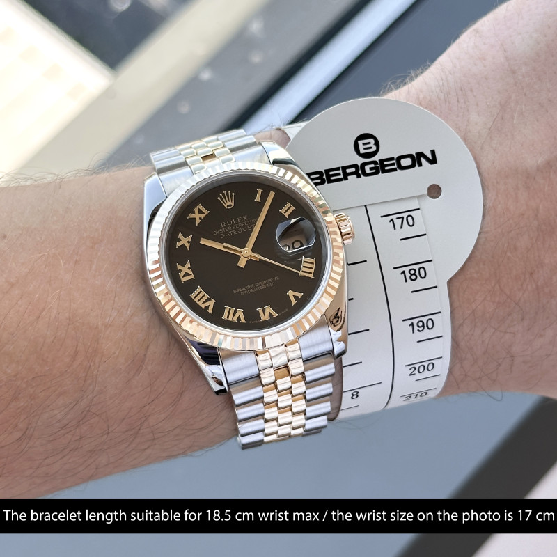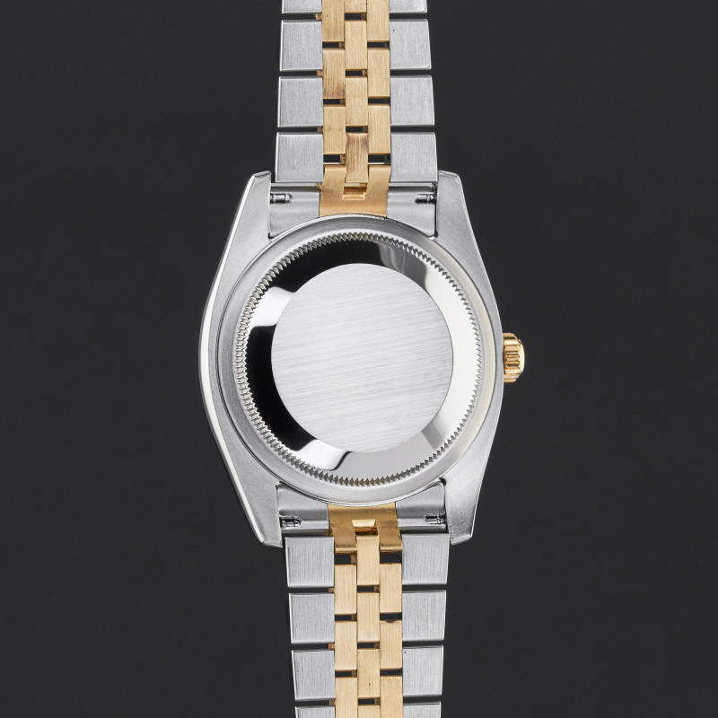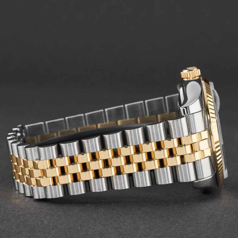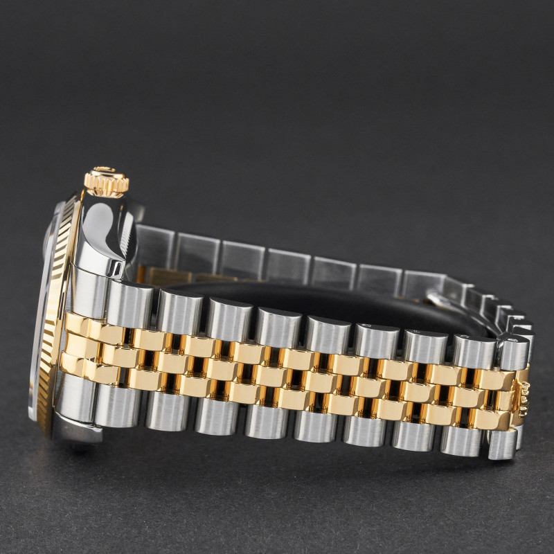 This Rolex Datejust 116233 features a Black sunbeam Roman dial and is crafted from 18K yellow gold and stainless steel, with a production year of 2004.