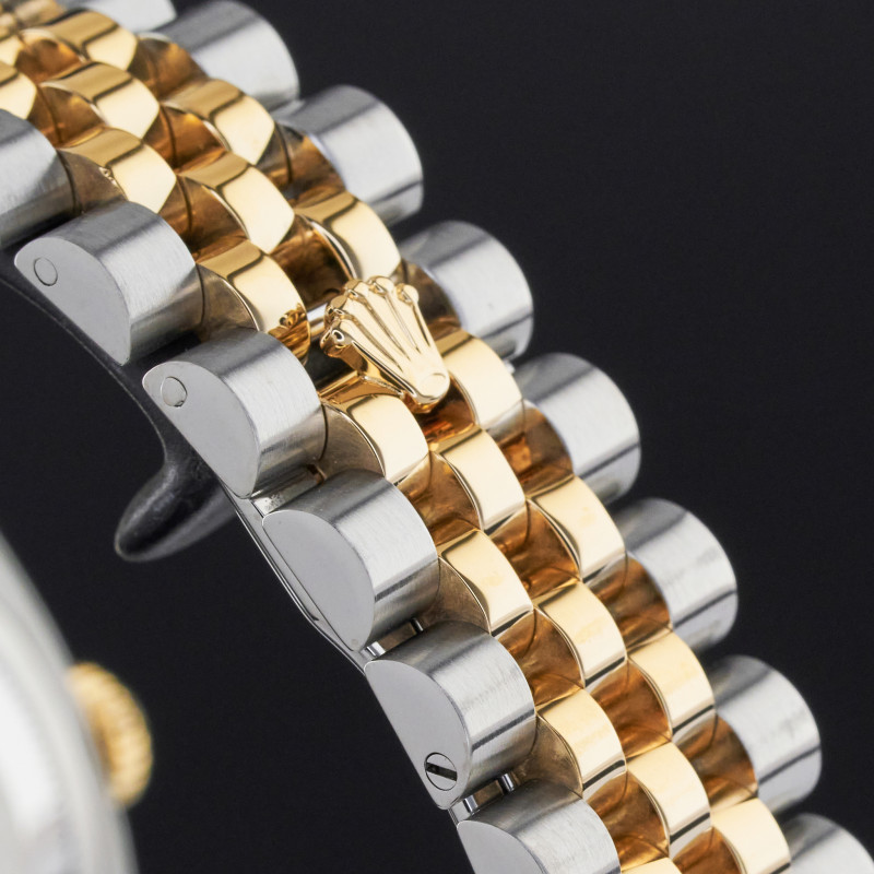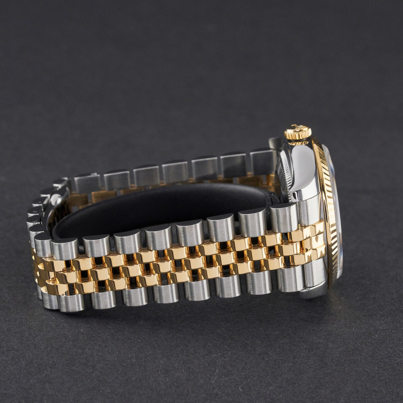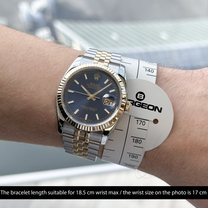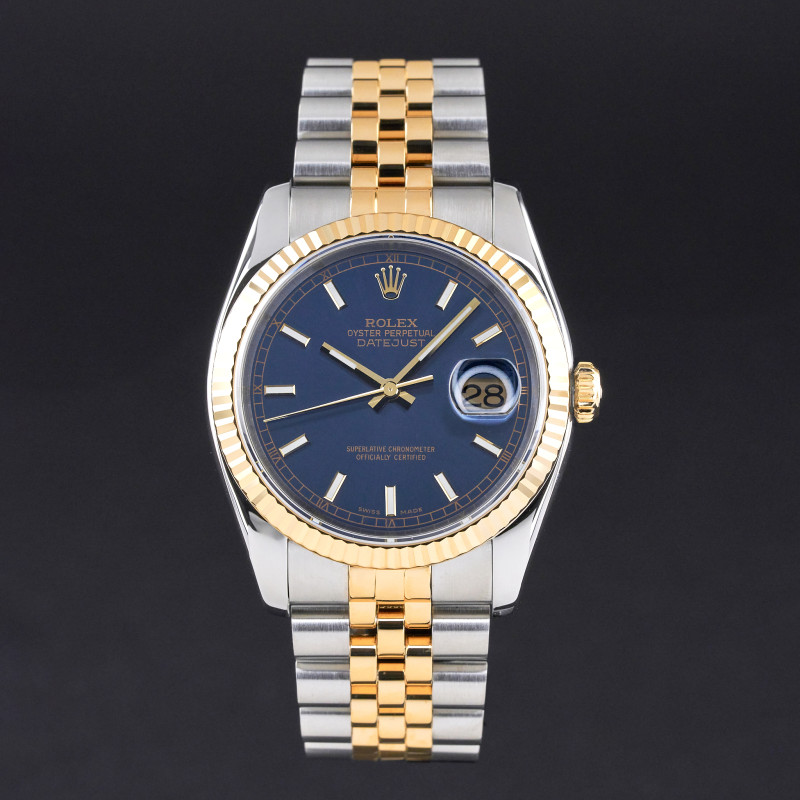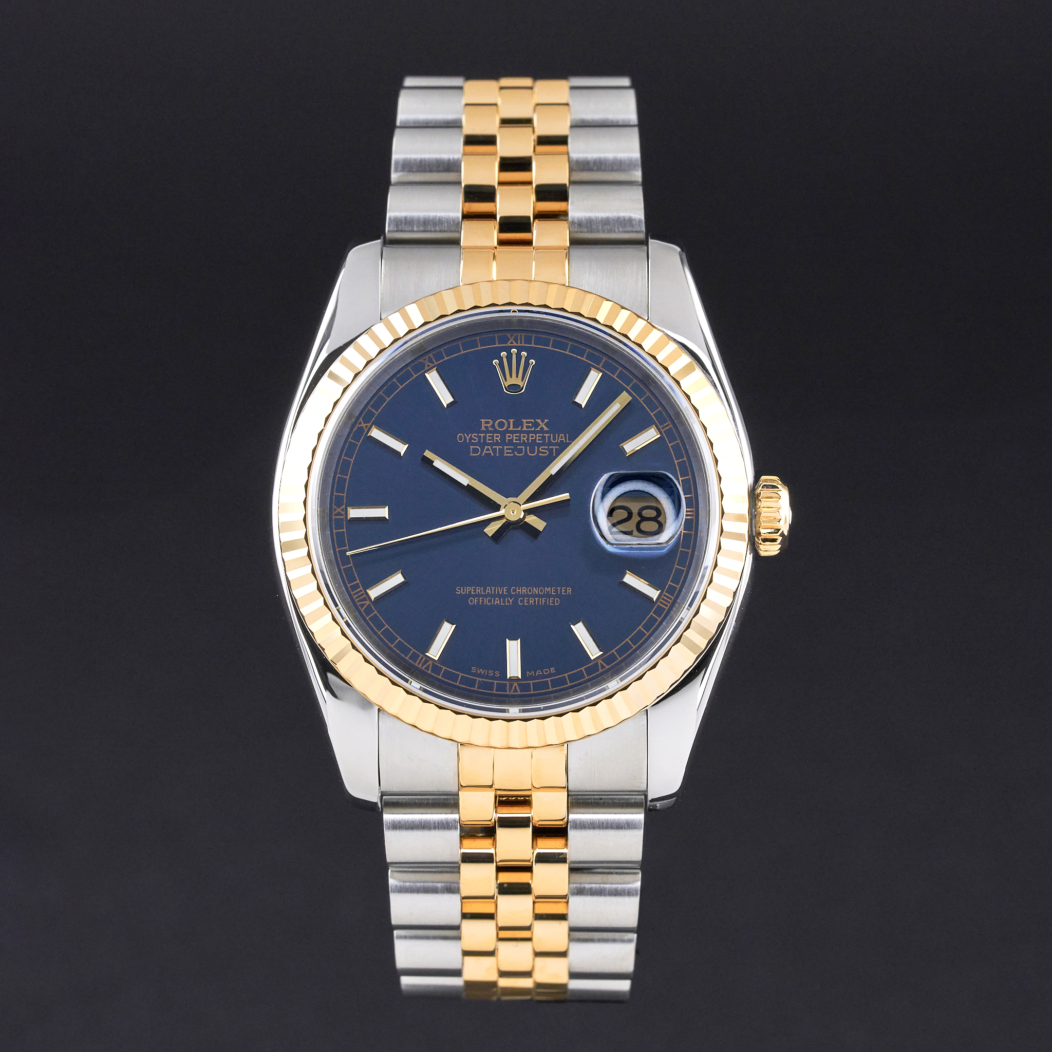 This Rolex Datejust 116233 features a Blue dial and is crafted from 18K yellow gold and stainless steel, with a production year of 2004.