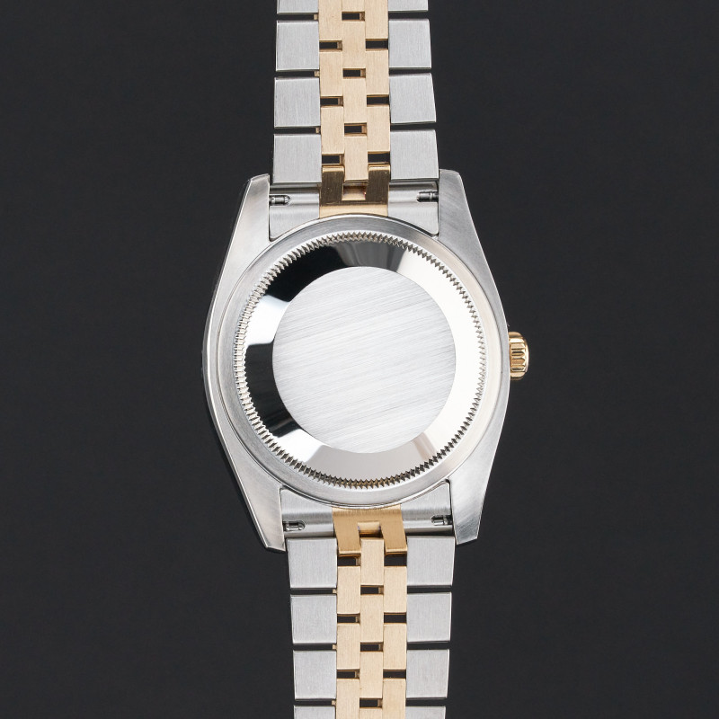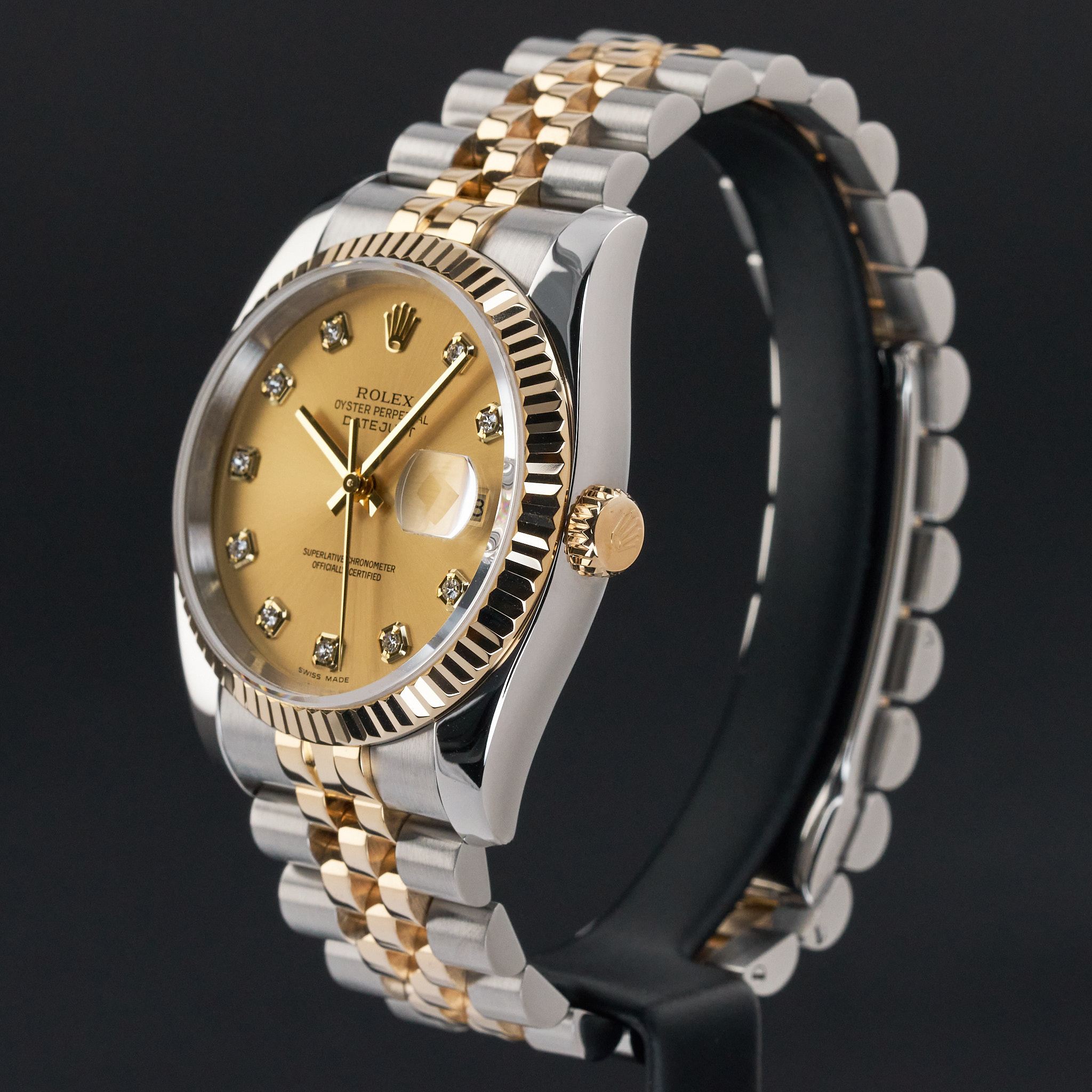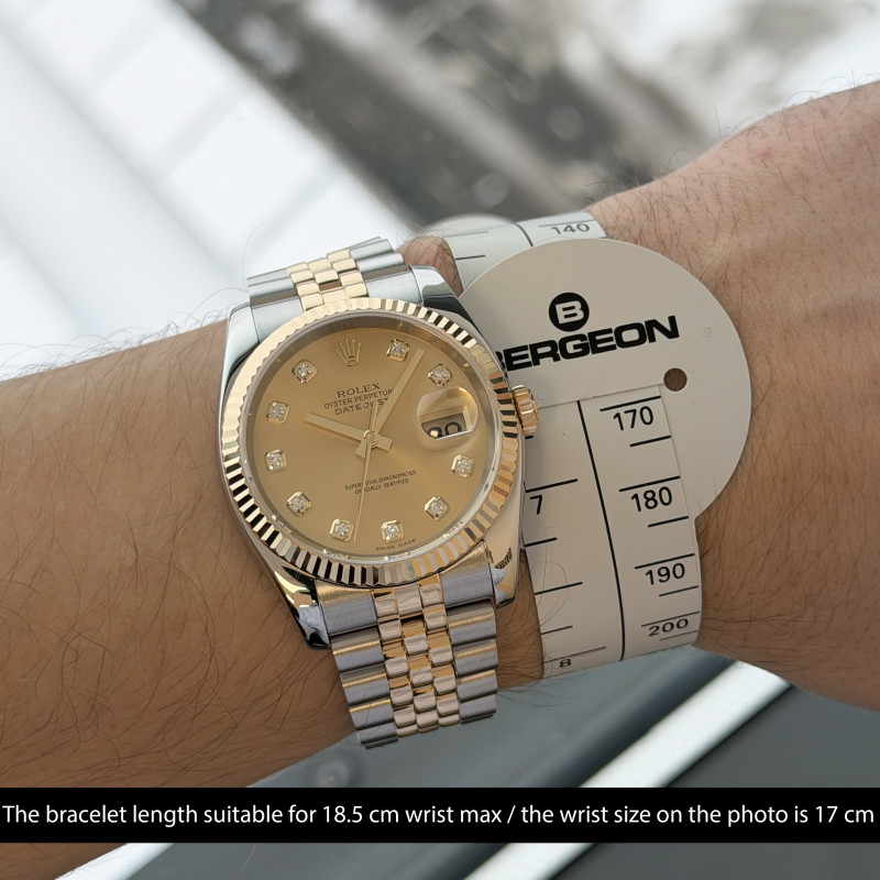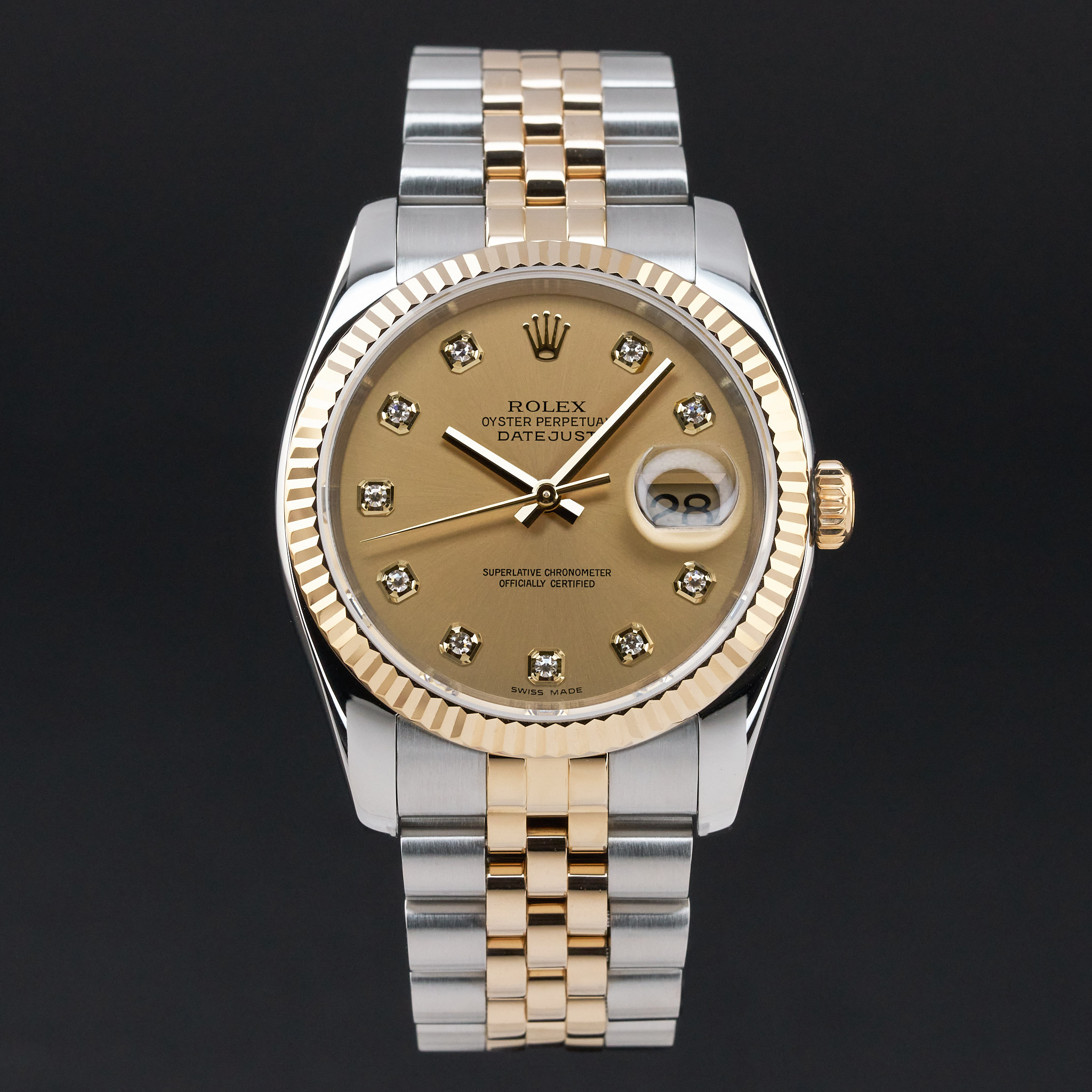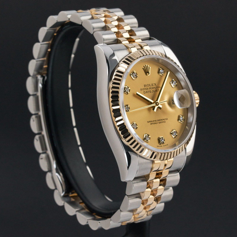 This Rolex Datejust 116233 features a Champagne diamond dial and is crafted from 18K yellow gold and stainless steel, with a production year of 2004.