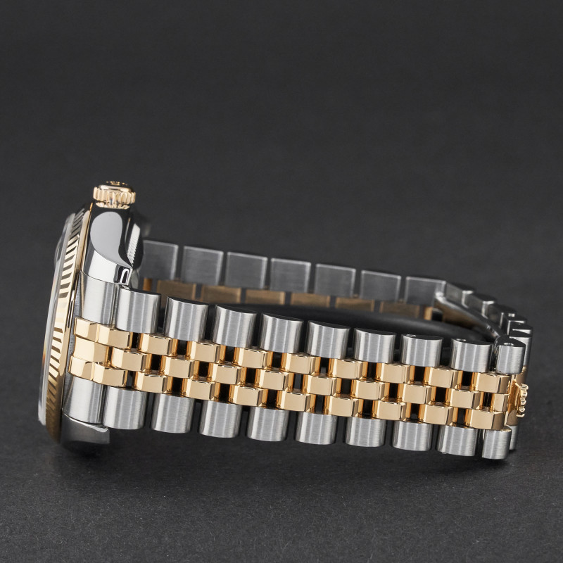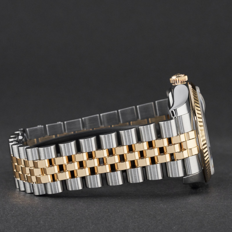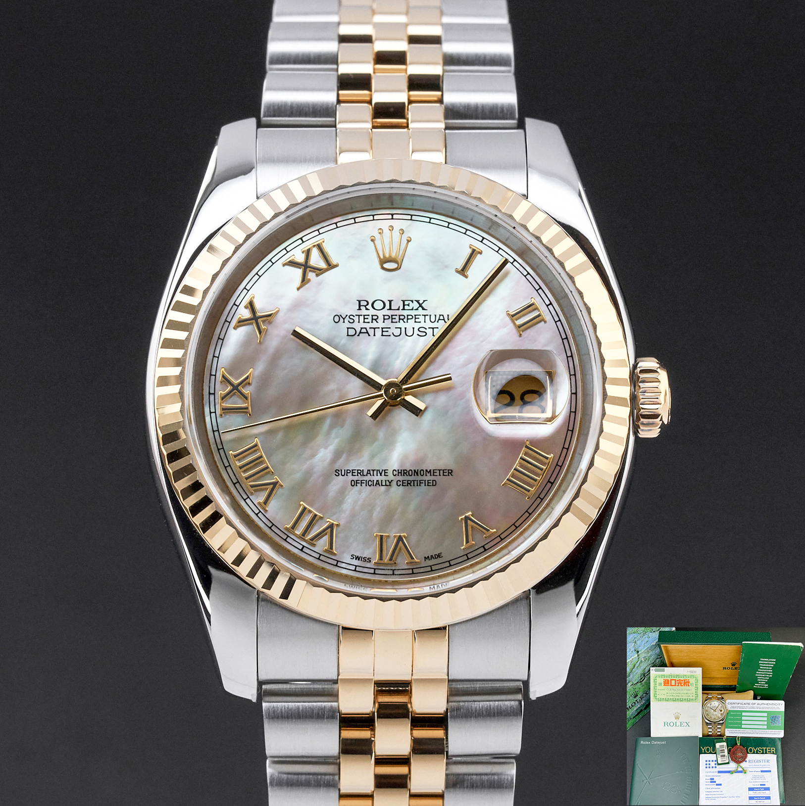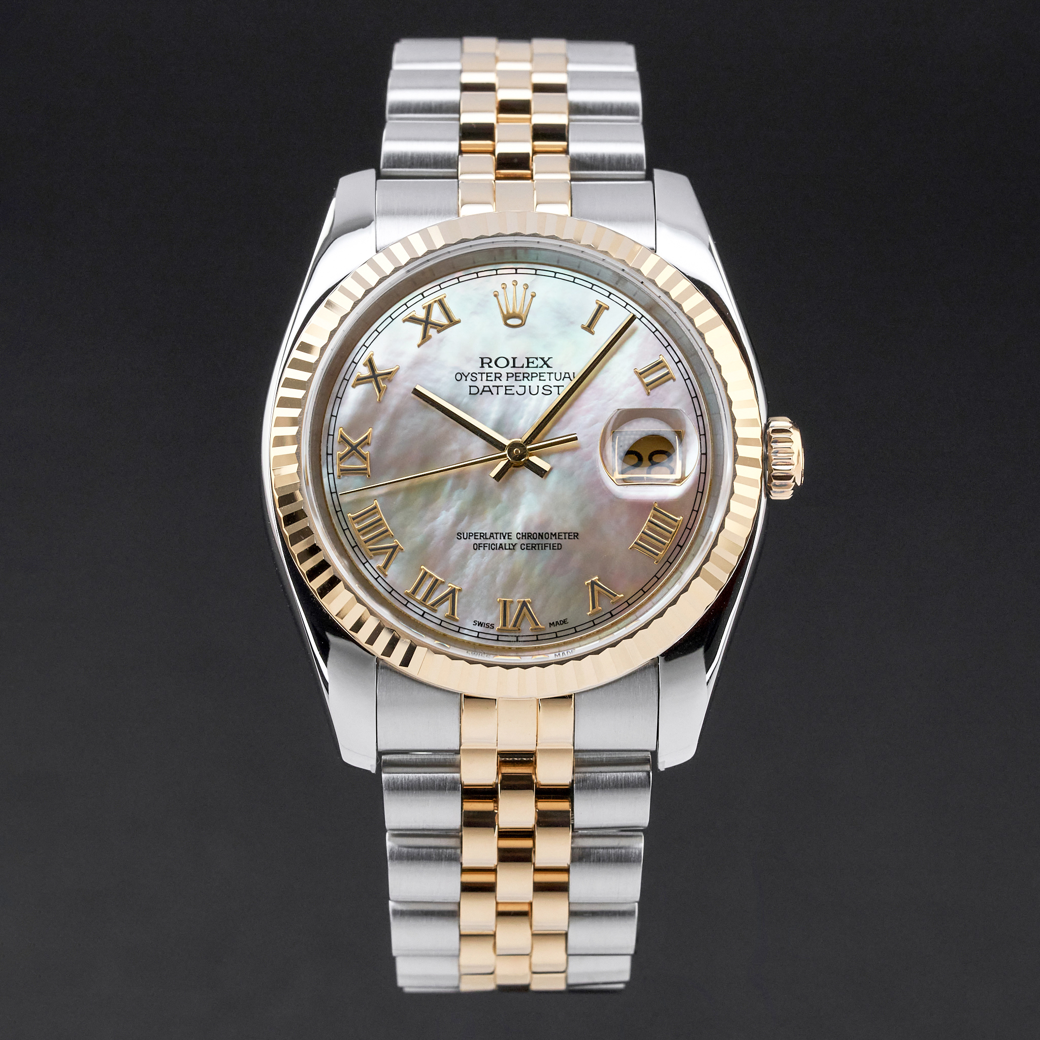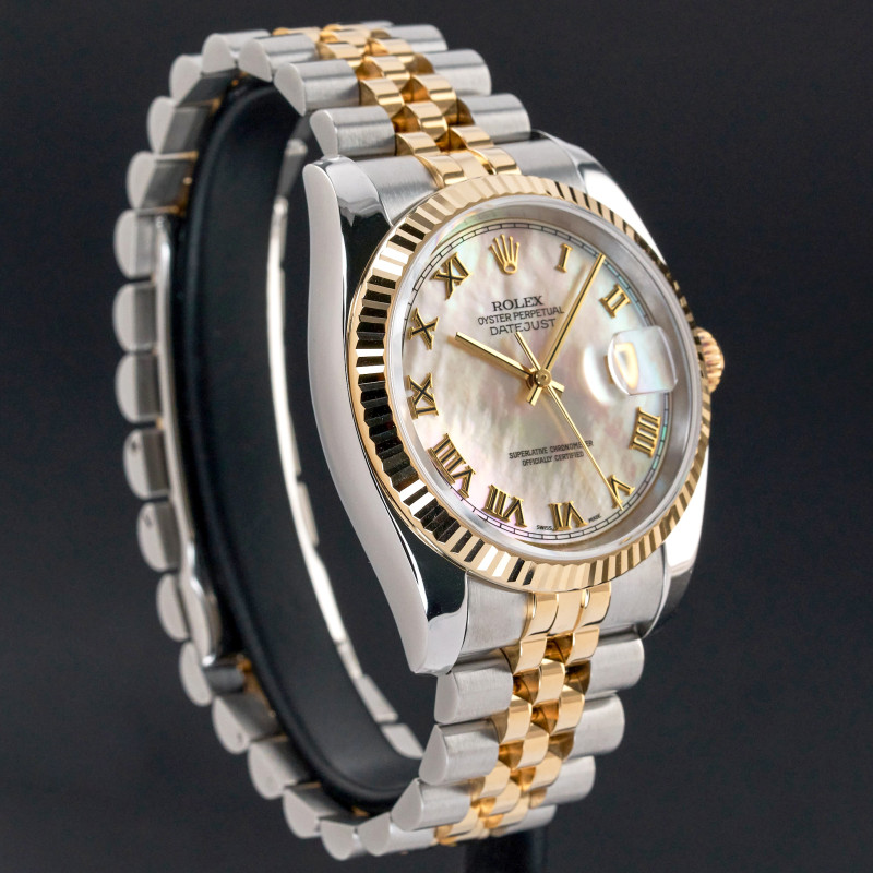 This Rolex Datejust 116233 features a Mother of Pearl Roman dial and is crafted from 18K yellow gold and stainless steel, with a production year of 2004.