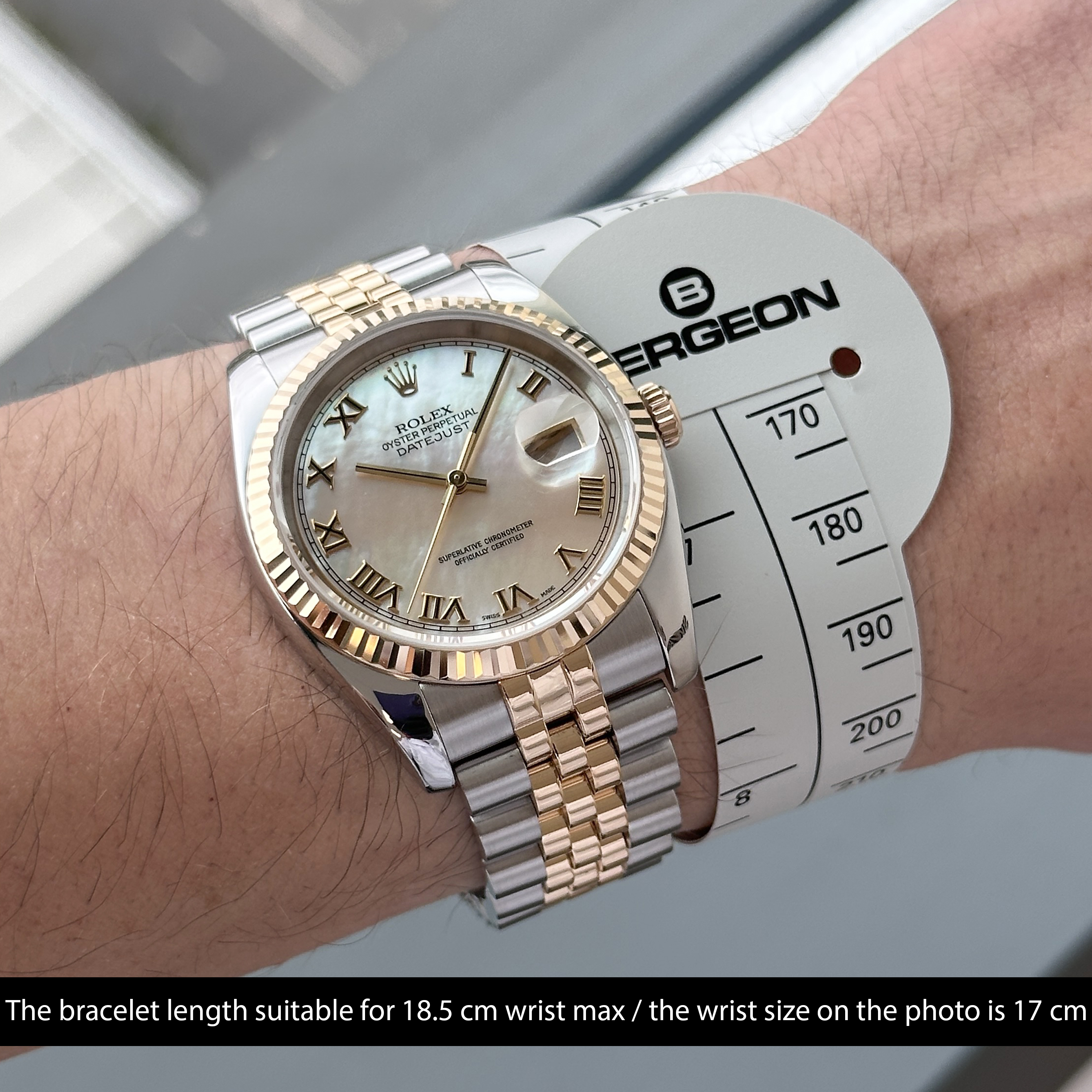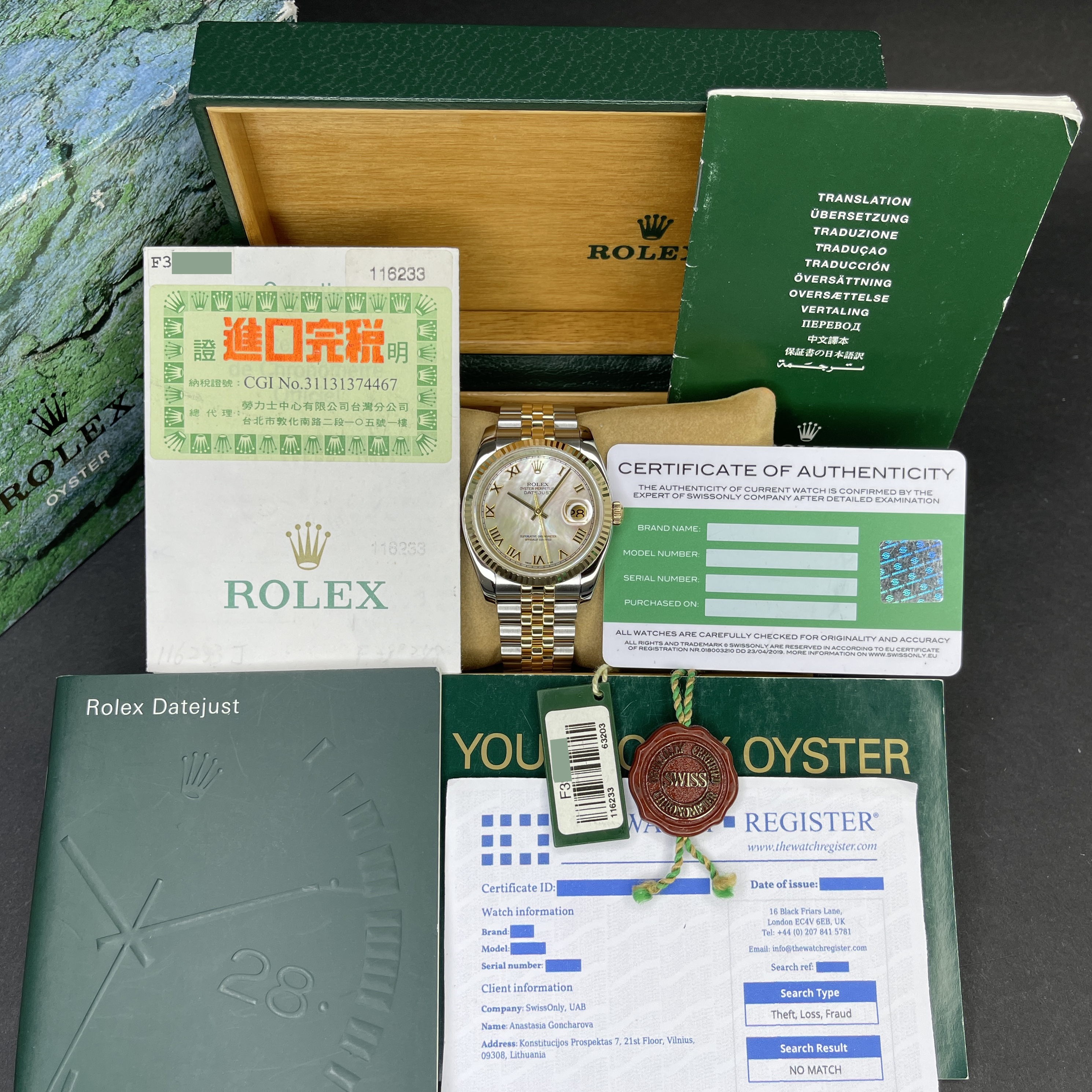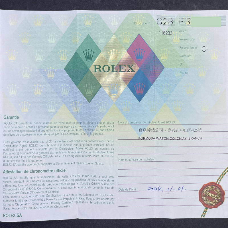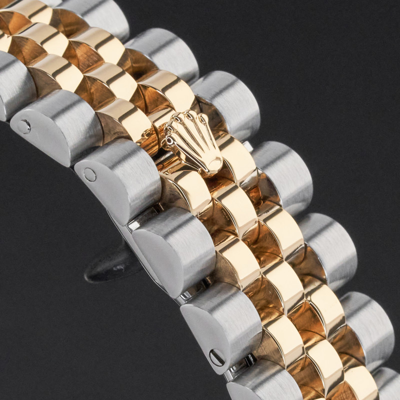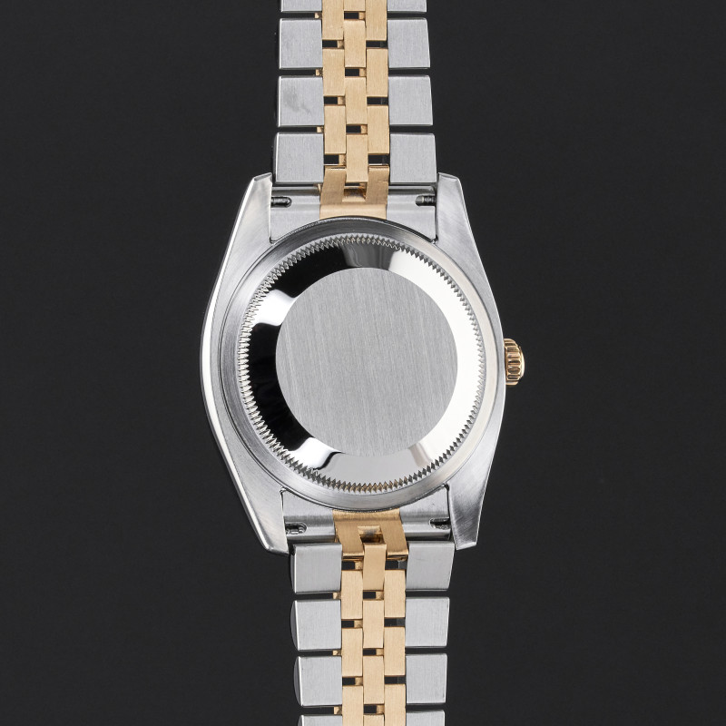 This Rolex Datejust 116233 features a Mother of Pearl Roman dial and is crafted from 18K yellow gold and stainless steel, with a production year of 2004.