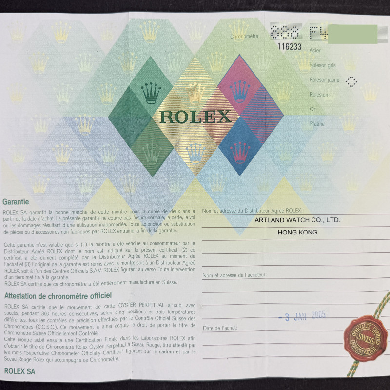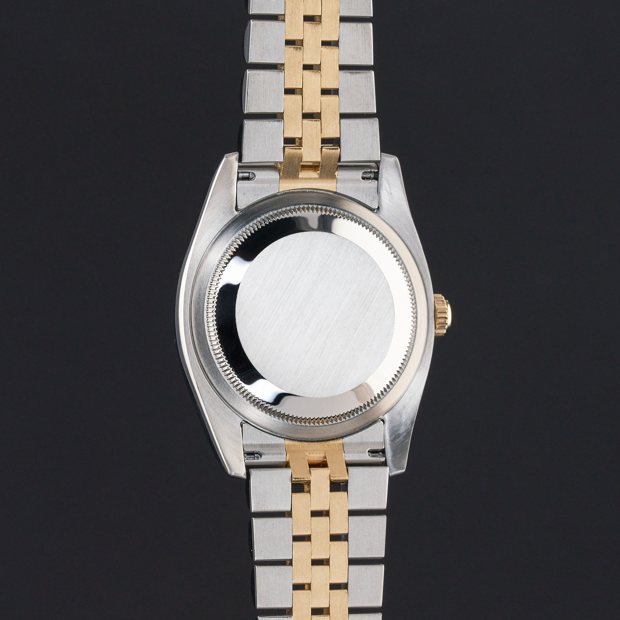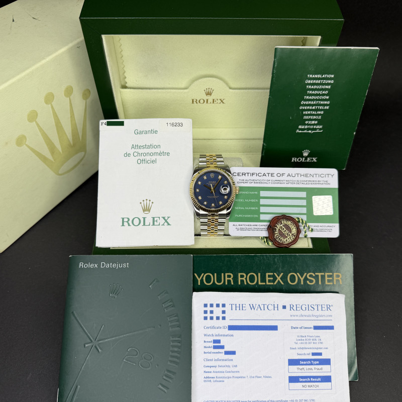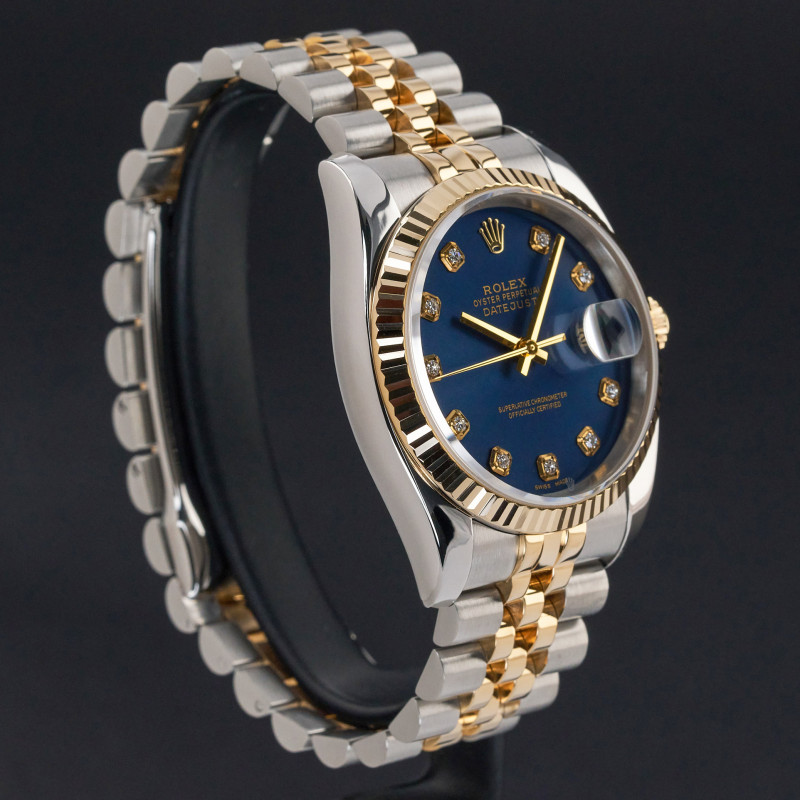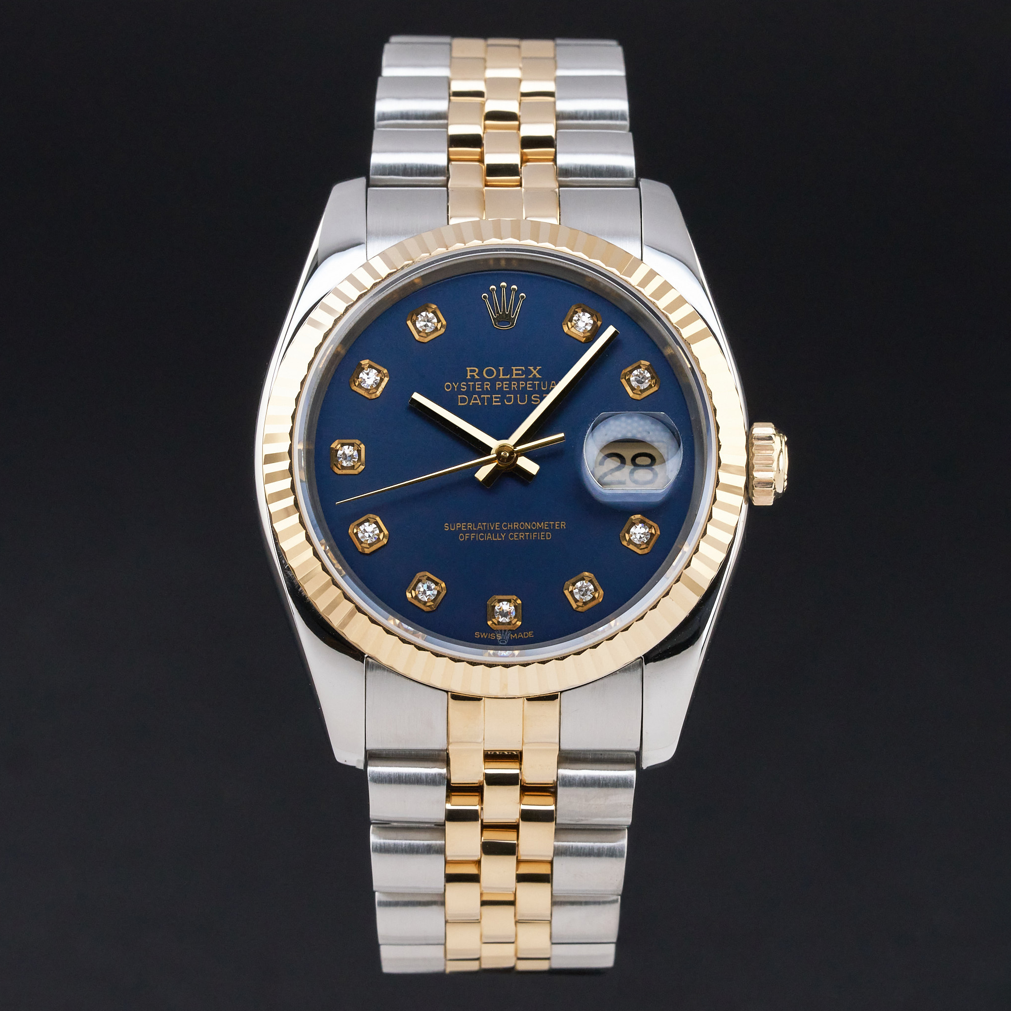 This Rolex Datejust 116233 features a Blue diamond dial and is crafted from 18K yellow gold and stainless steel, with a production year of 2005.