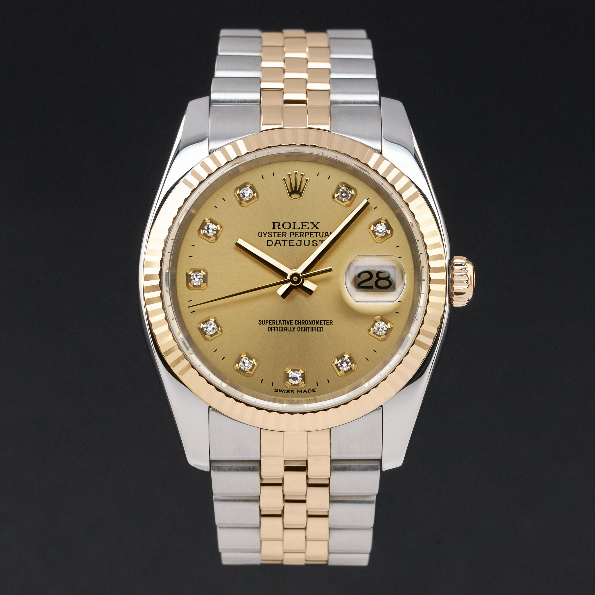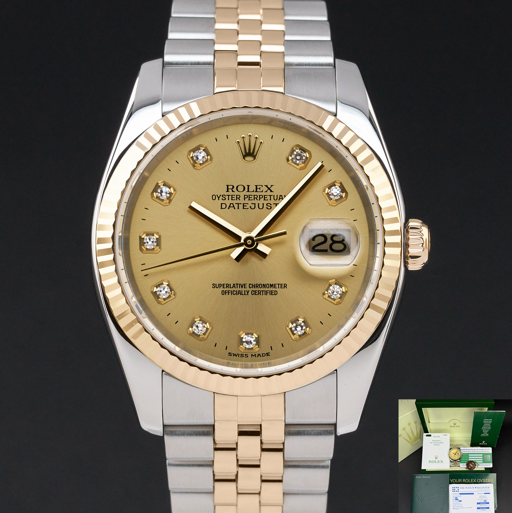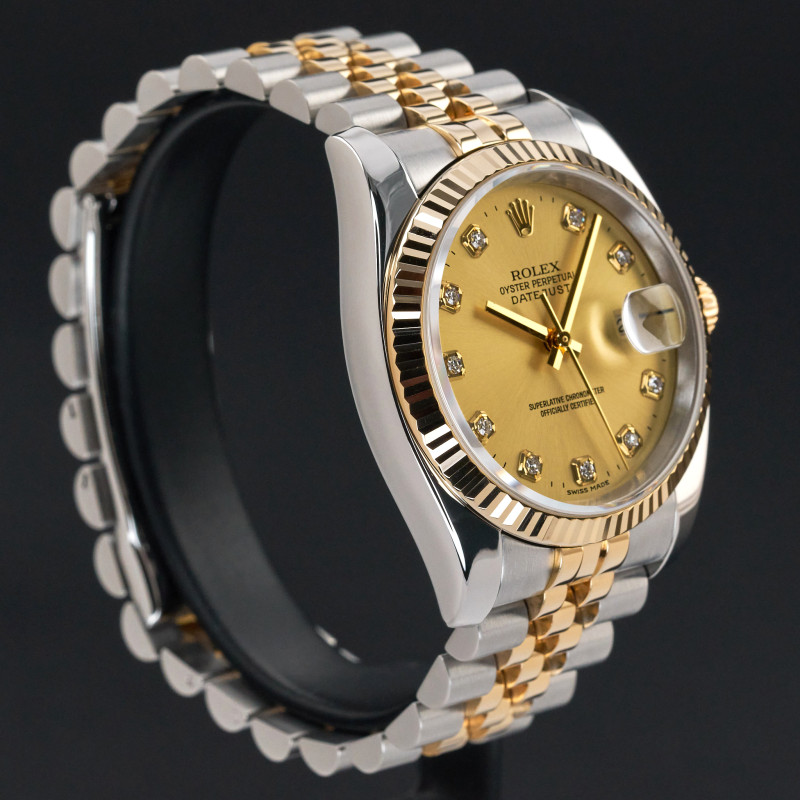 This Rolex Datejust 116233 features a Champagne diamond dial and is crafted from 18K yellow gold and stainless steel, with a production year of 2006.