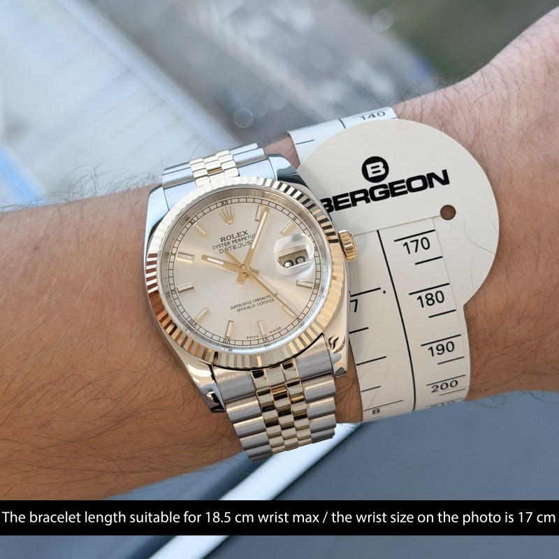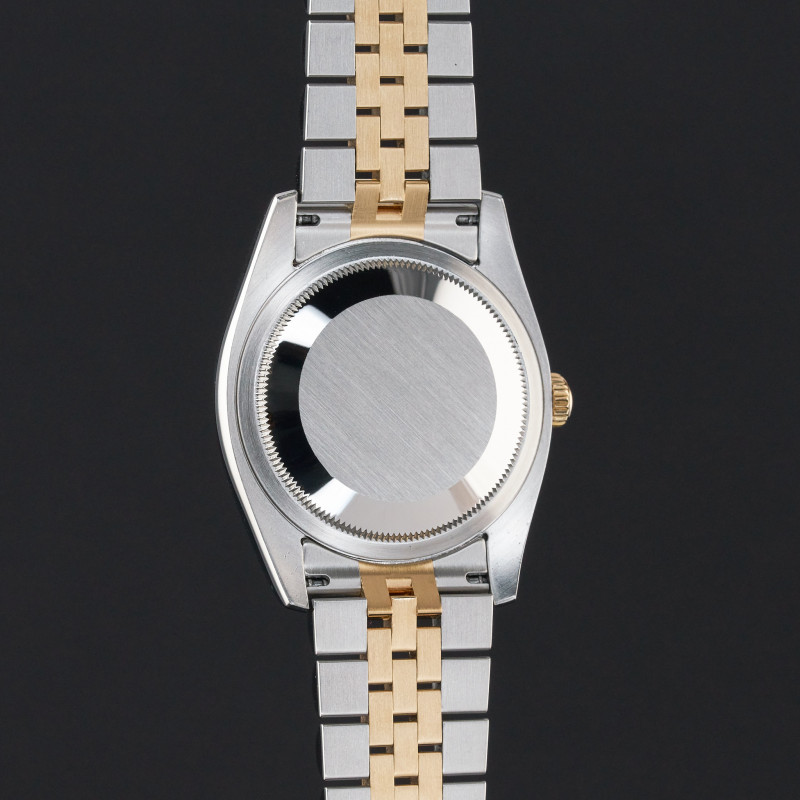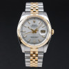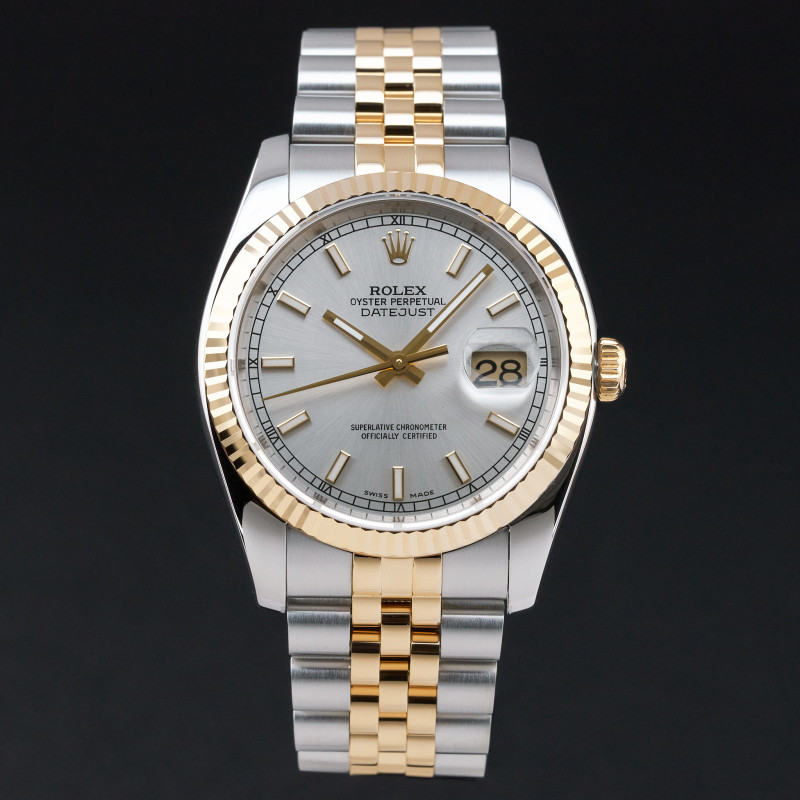 This Rolex Datejust 116233 features a Silver dial and is crafted from 18K yellow gold and stainless steel, with a production year of 2006.