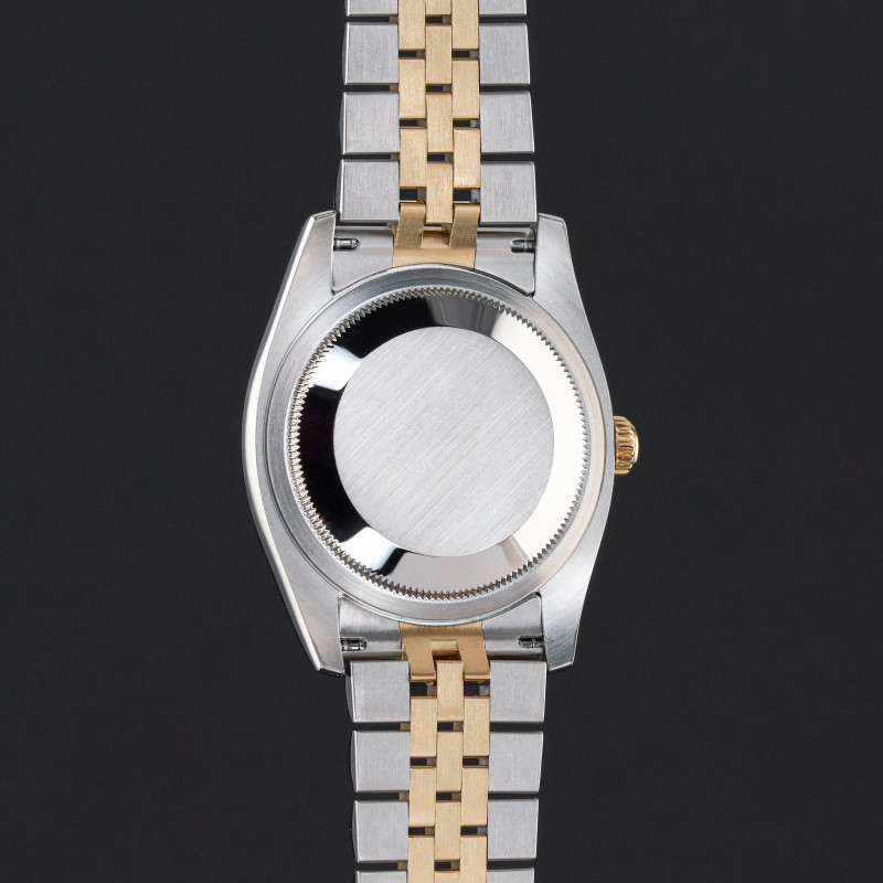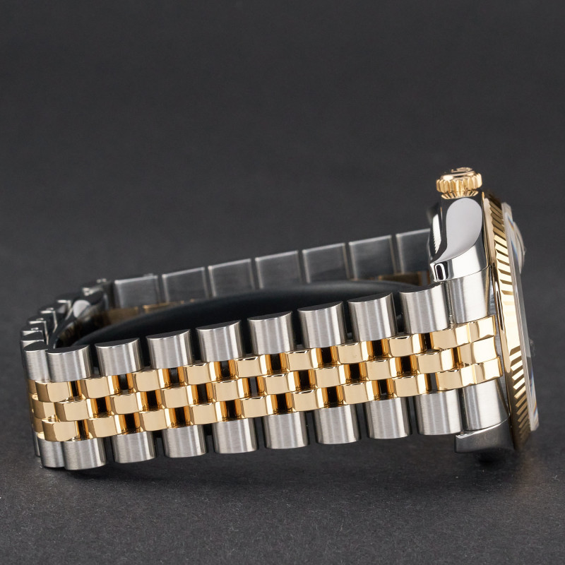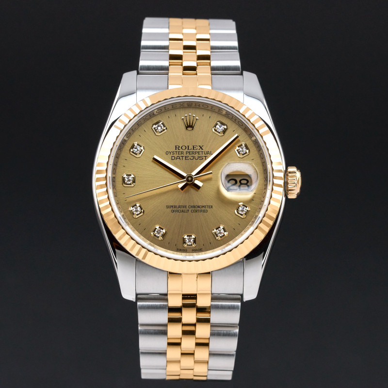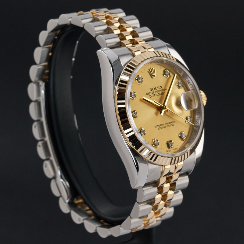 This Rolex Datejust 116233 features a Champagne diamond dial and is crafted from 18K yellow gold and stainless steel, with a production year of 2007.