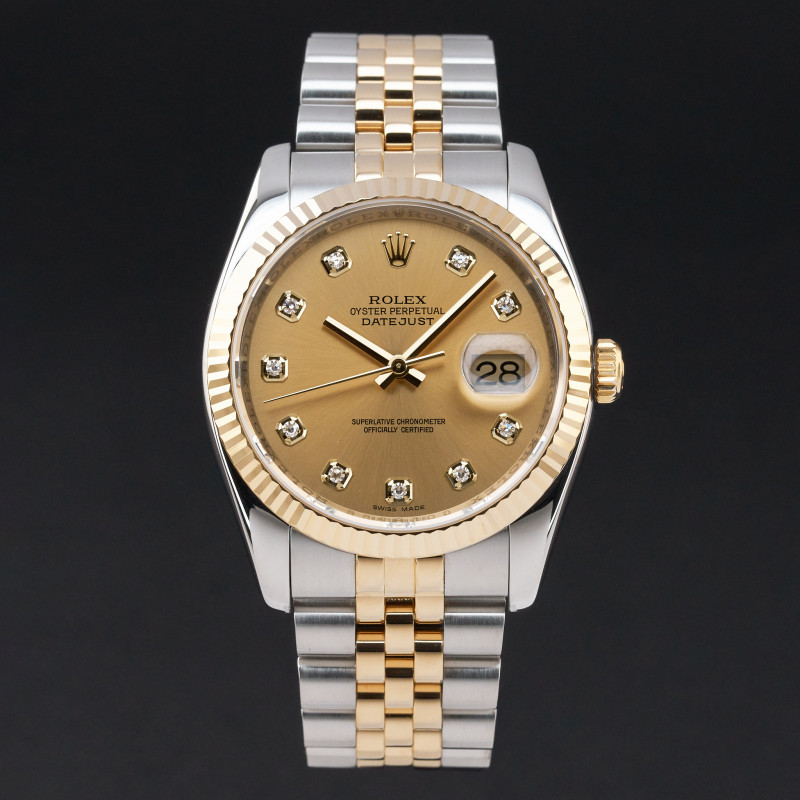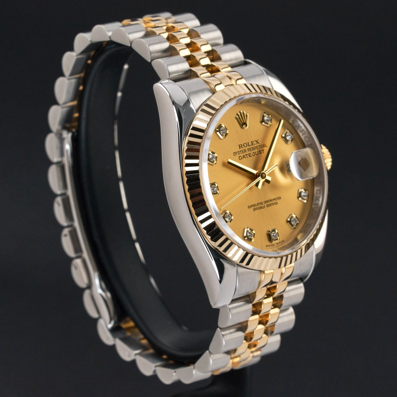 This Rolex Datejust 116233 features a Champagne diamond dial and is crafted from 18K yellow gold and stainless steel, with a production year of 2010.