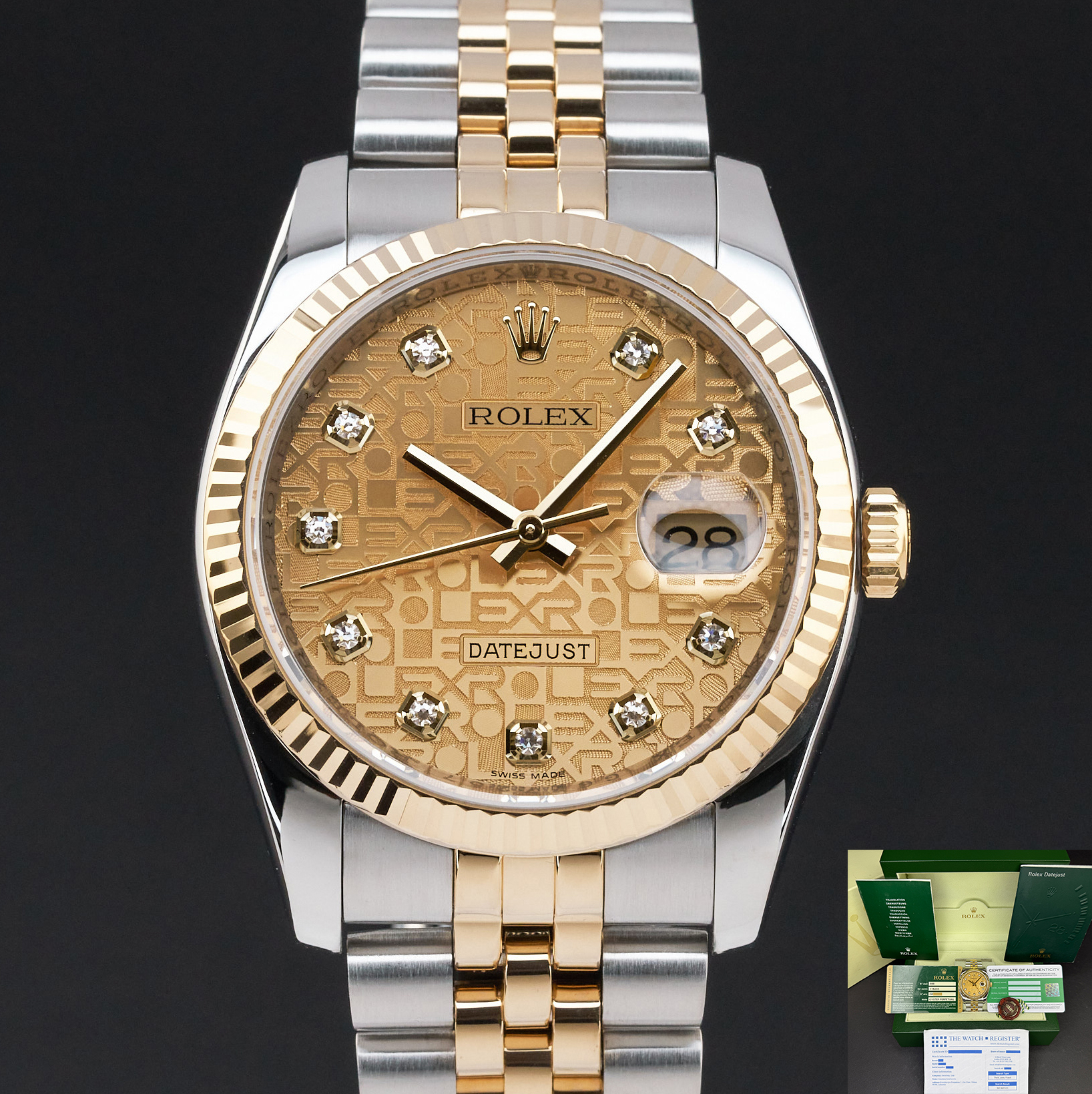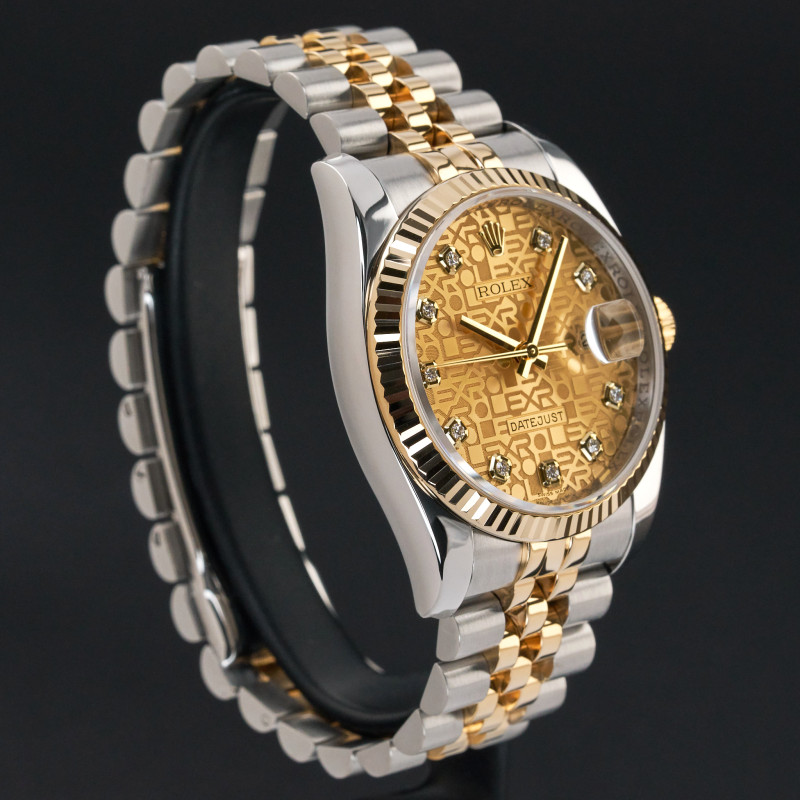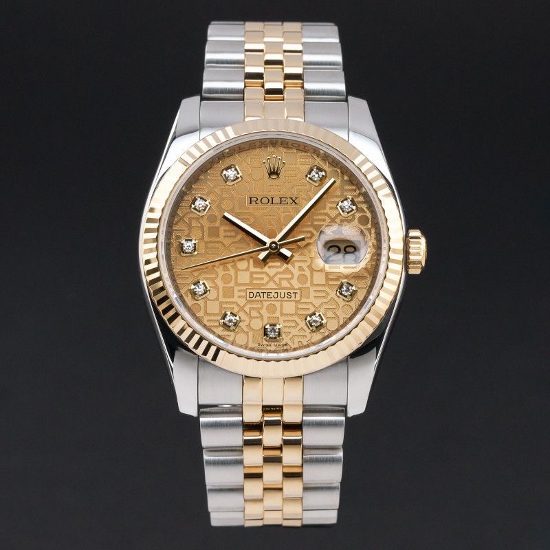 This Rolex Datejust 116233 features a Champagne jubilee diamond dial and is crafted from 18K yellow gold and stainless steel, with a production year of 2010.