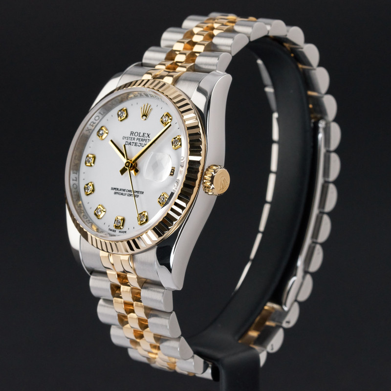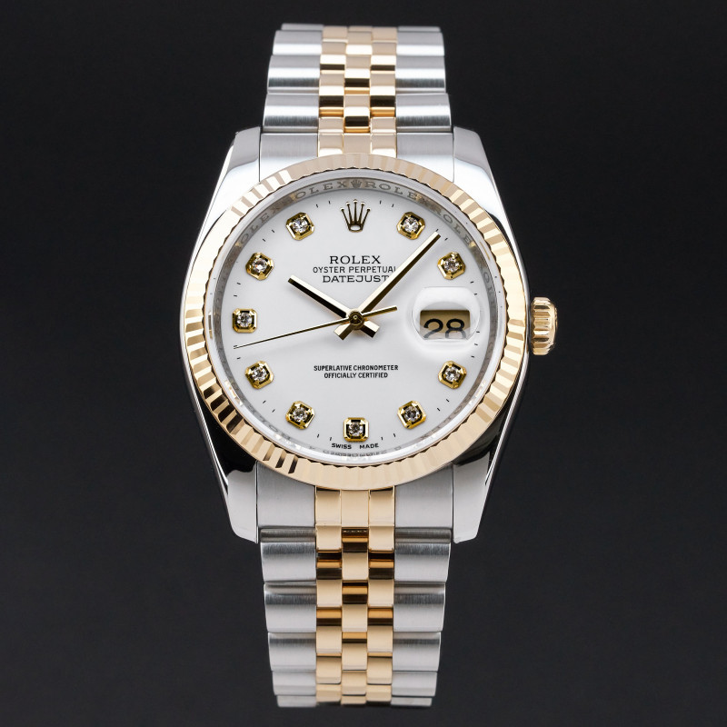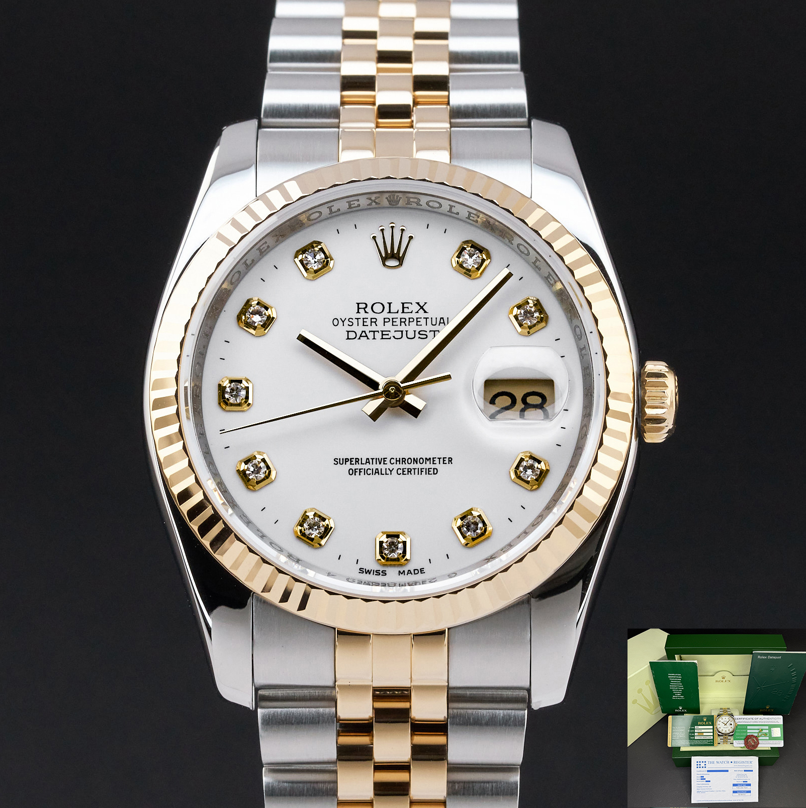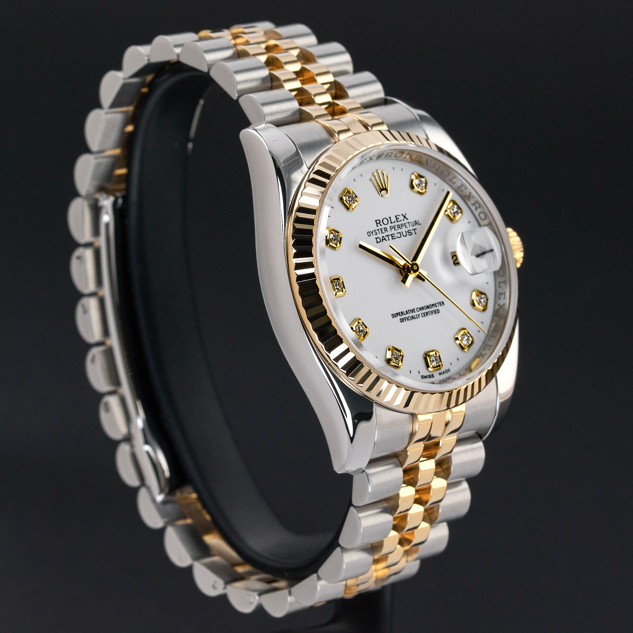 This Rolex Datejust 116233 features a White diamond dial and is crafted from 18K yellow gold and stainless steel, with a production year of 2010.