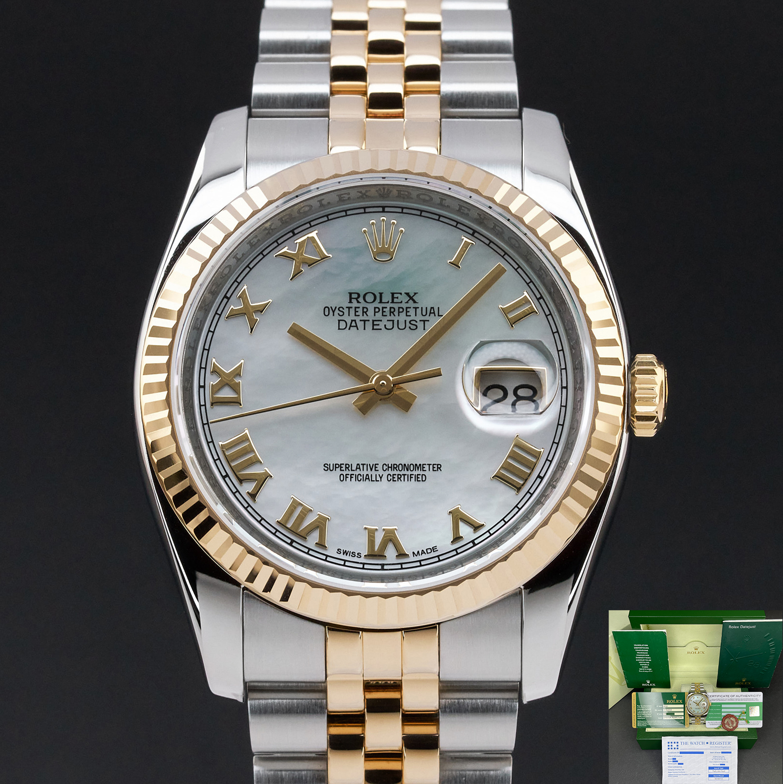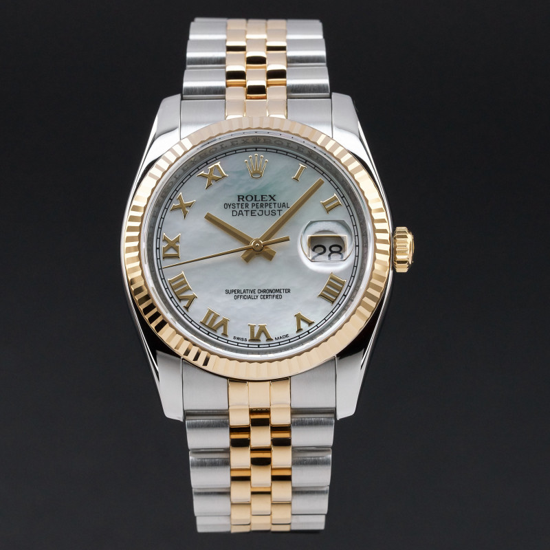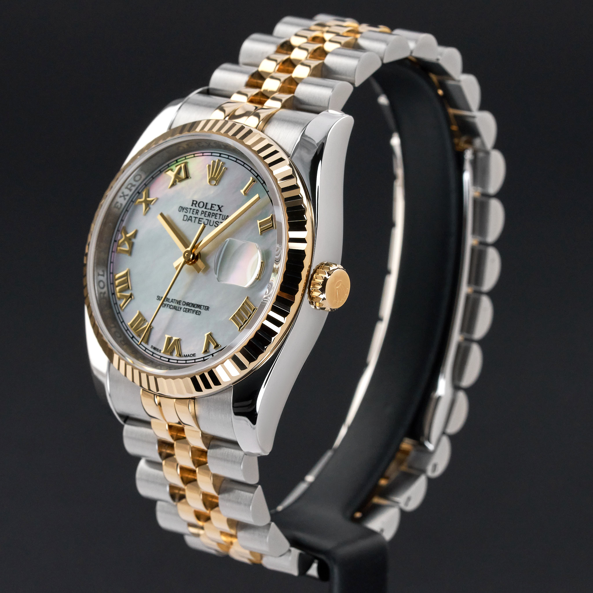 This Rolex Datejust 116233 features a Mother of Pearl Roman dial and is crafted from 18K yellow gold and stainless steel, with a production year of 2012.