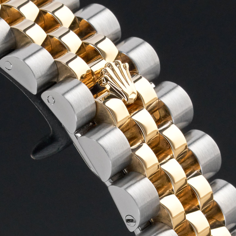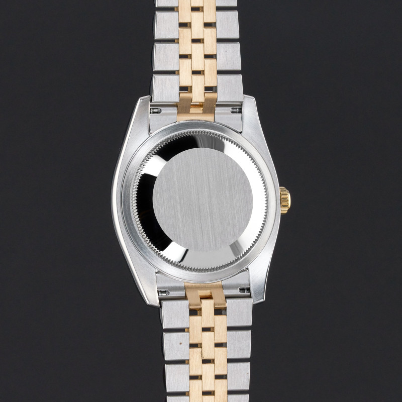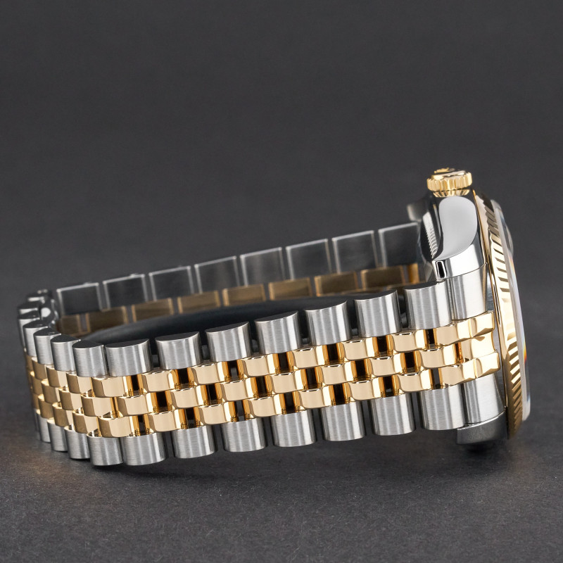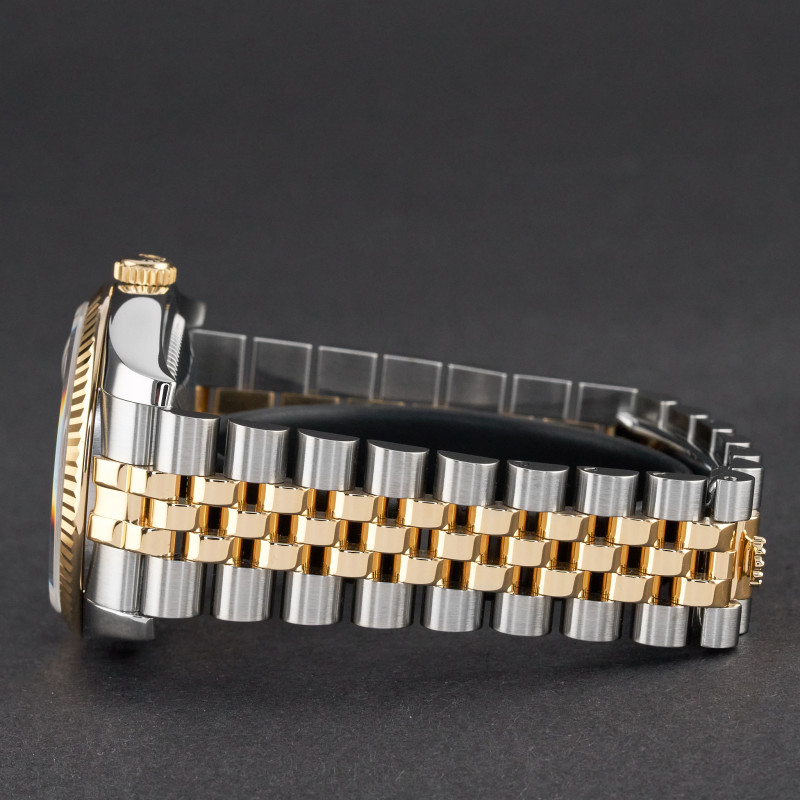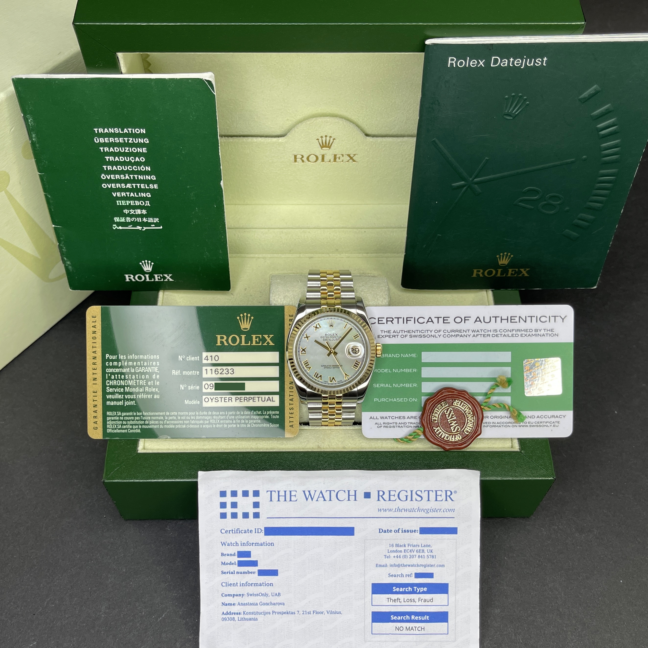 This Rolex Datejust 116233 features a Mother of Pearl Roman dial and is crafted from 18K yellow gold and stainless steel, with a production year of 2012.