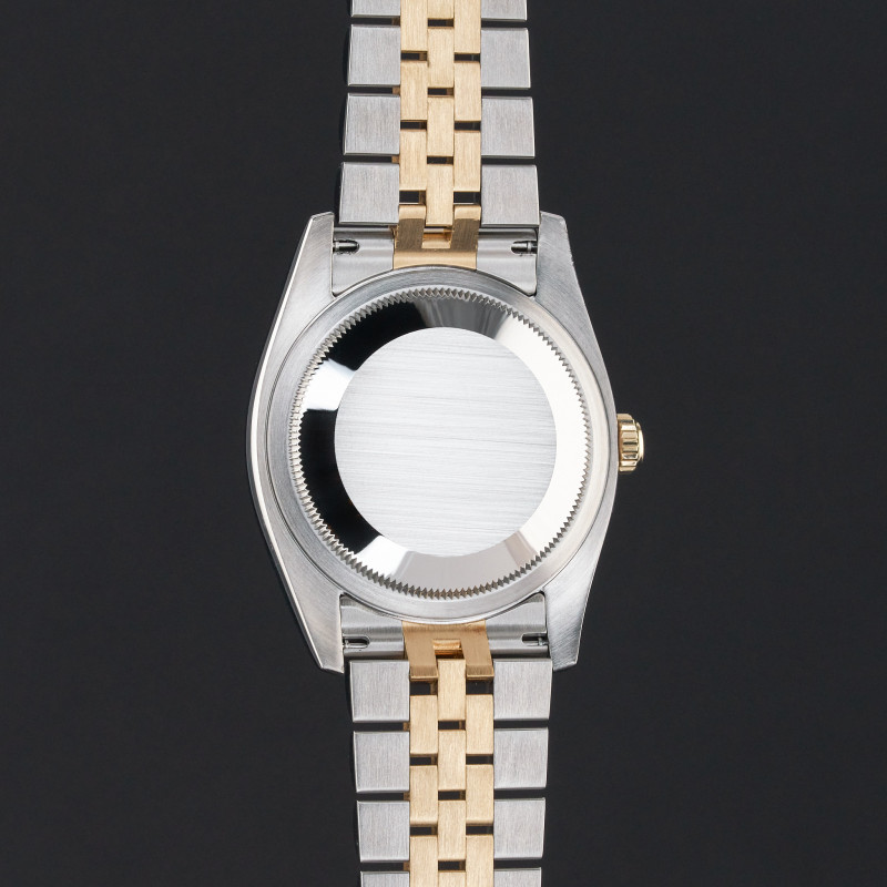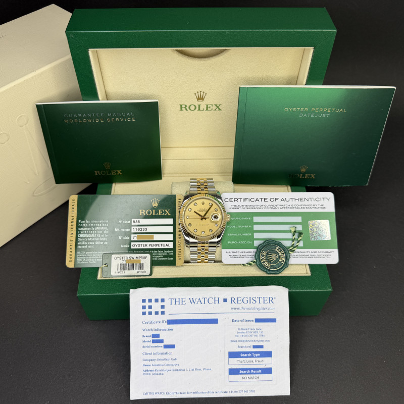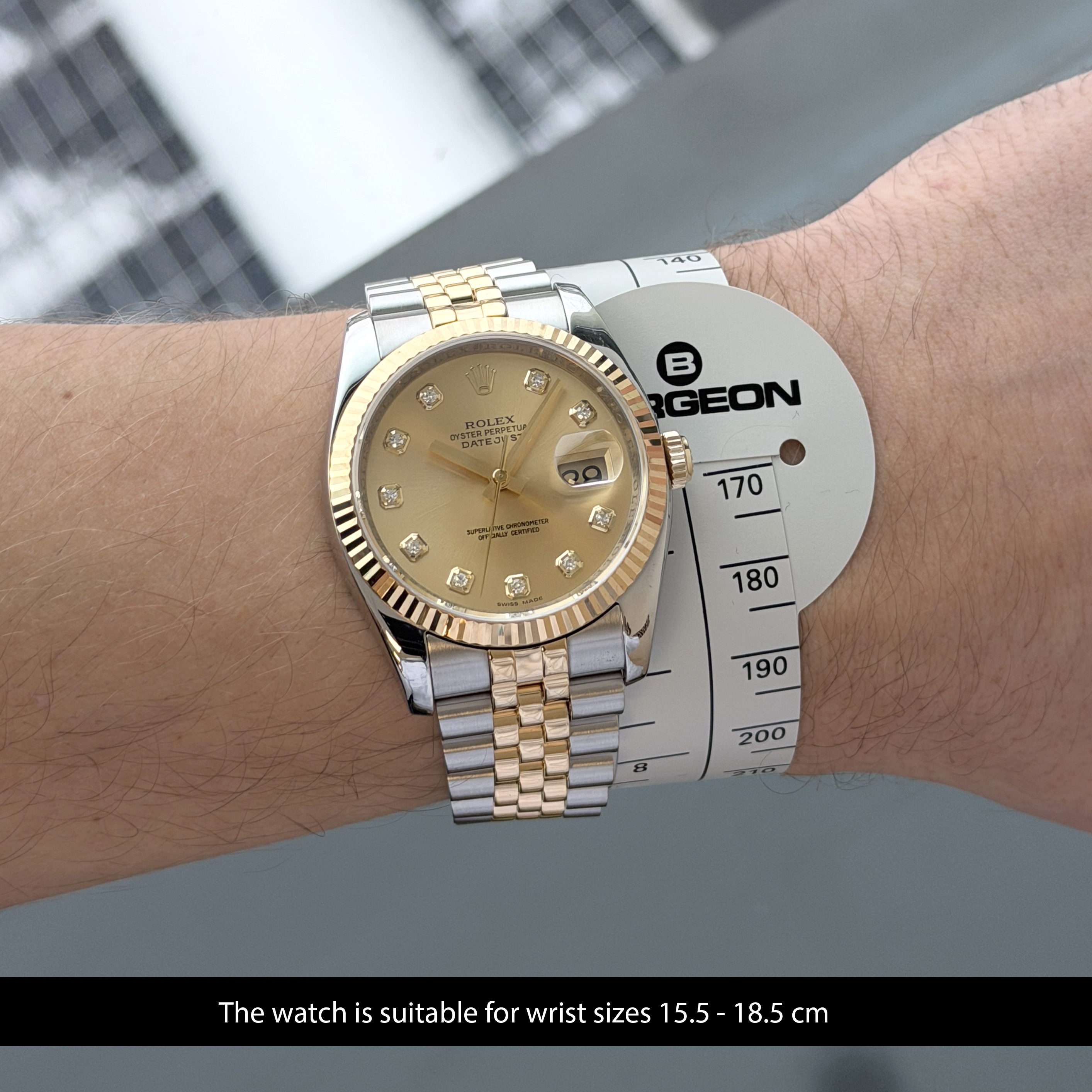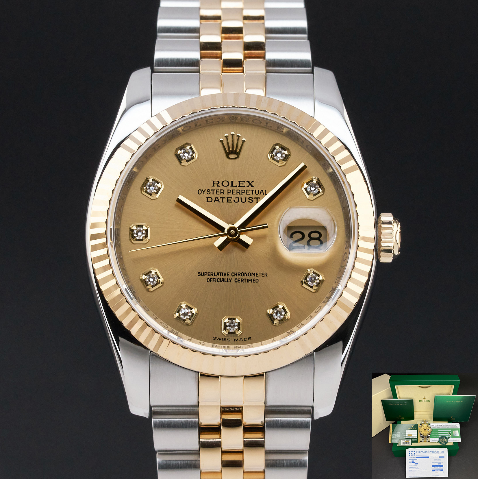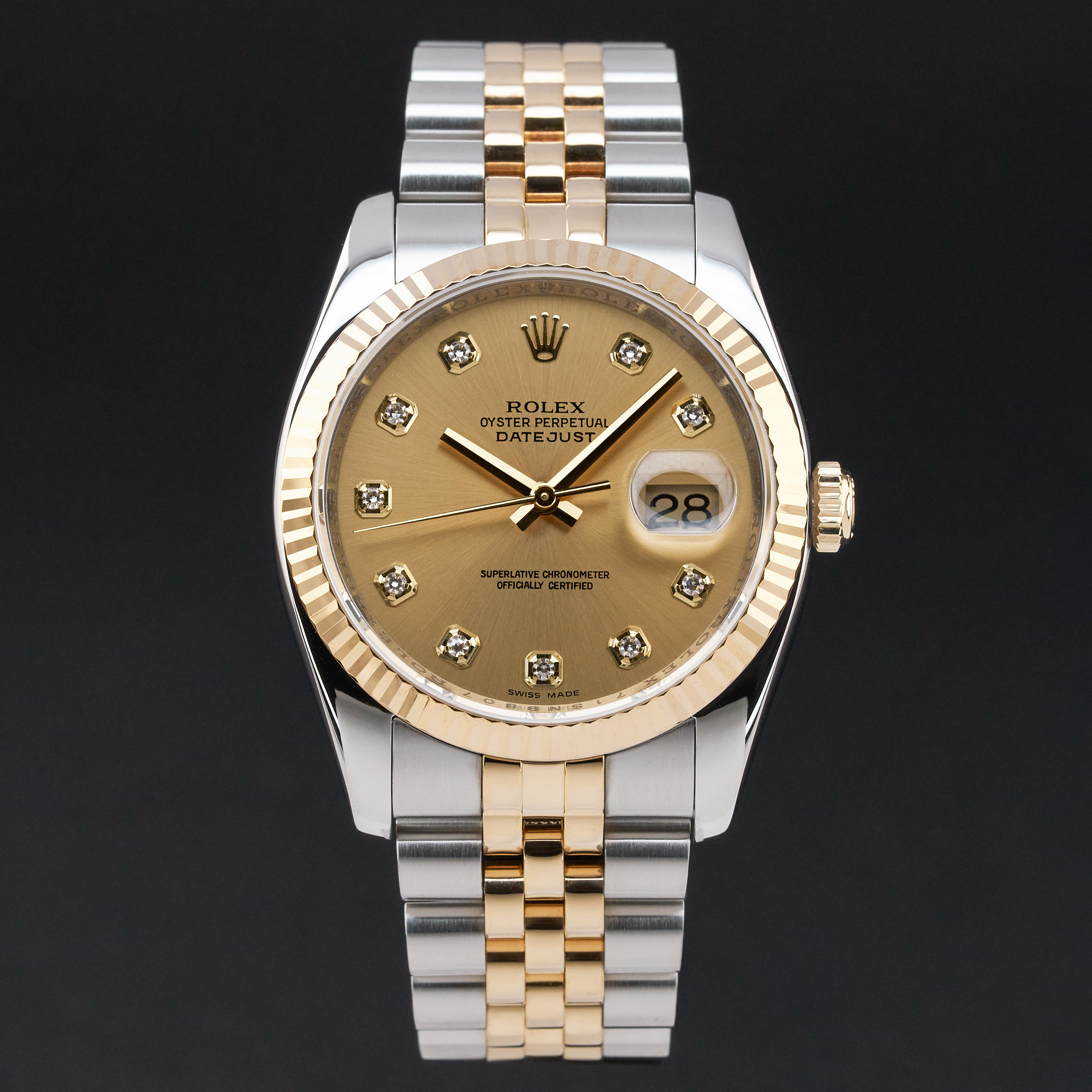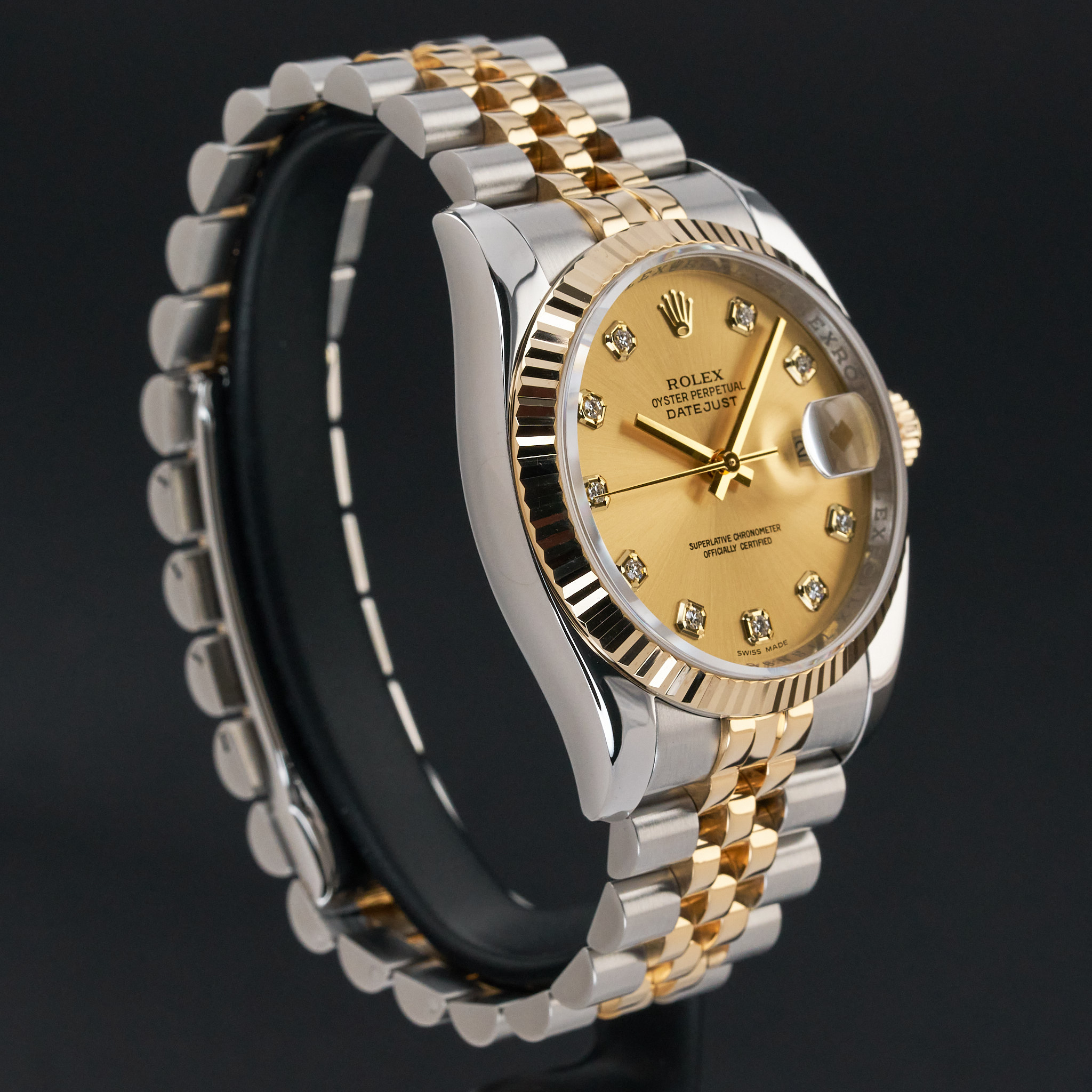 This Rolex Datejust 116233 features a Champagne diamond dial and is crafted from 18K yellow gold and stainless steel.