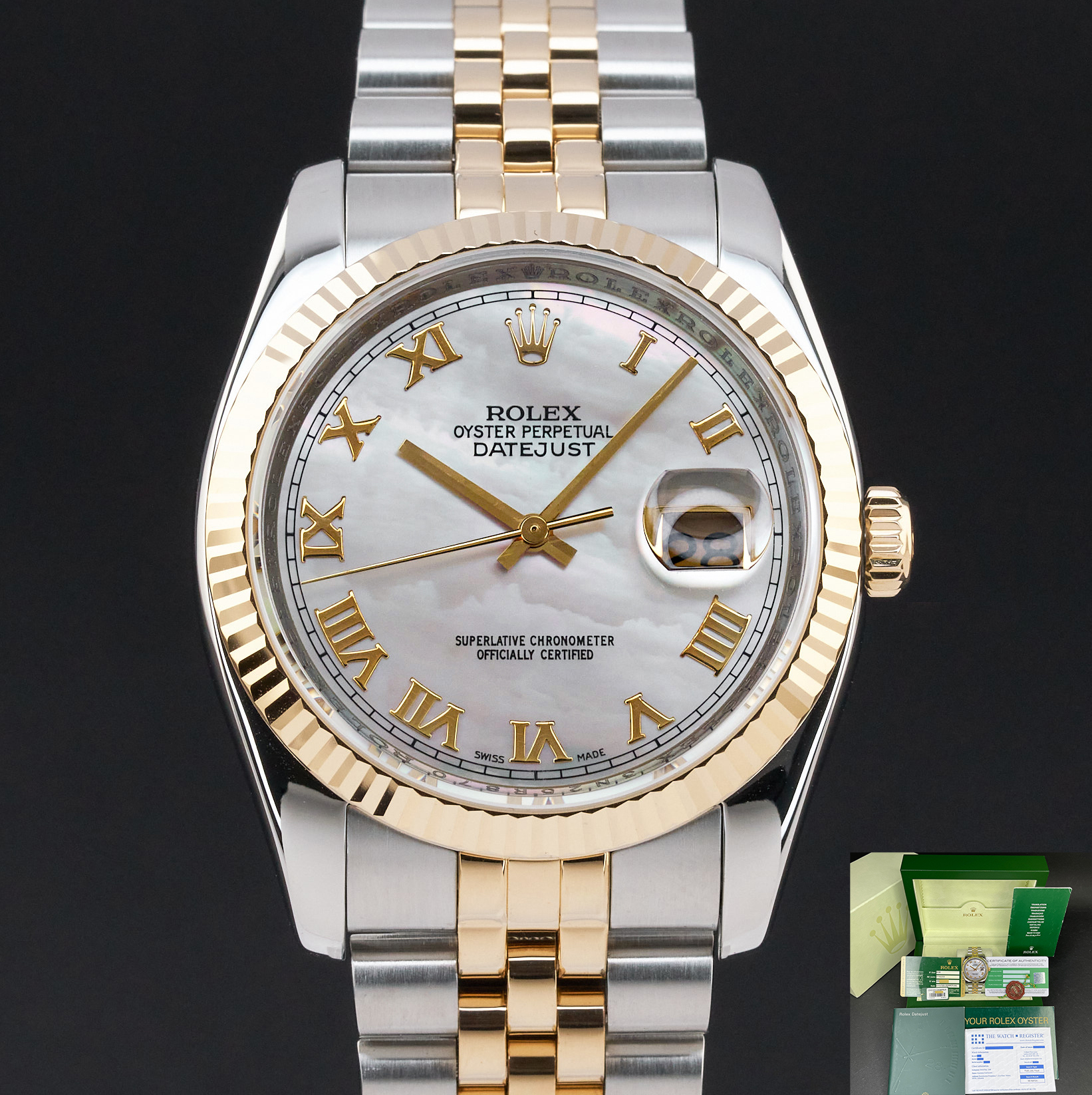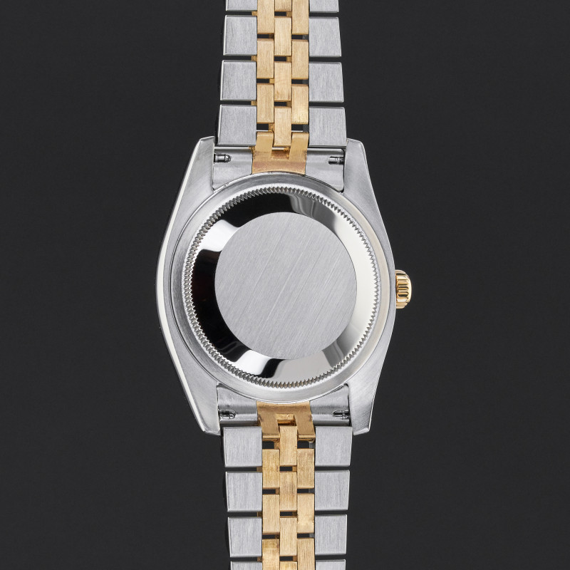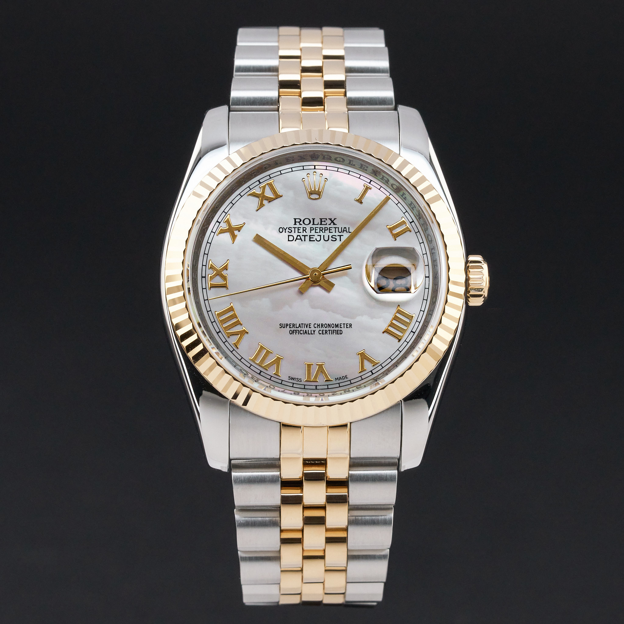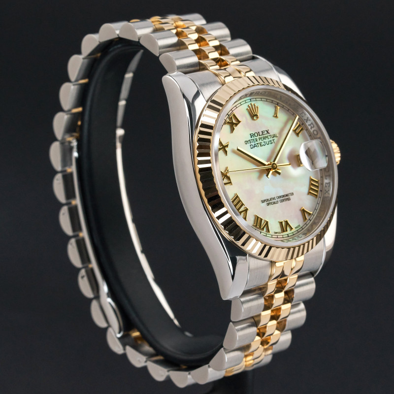 This Rolex Datejust 116233 features a Silver Mother of Pearl dial and is crafted from 18K yellow gold and stainless steel.