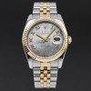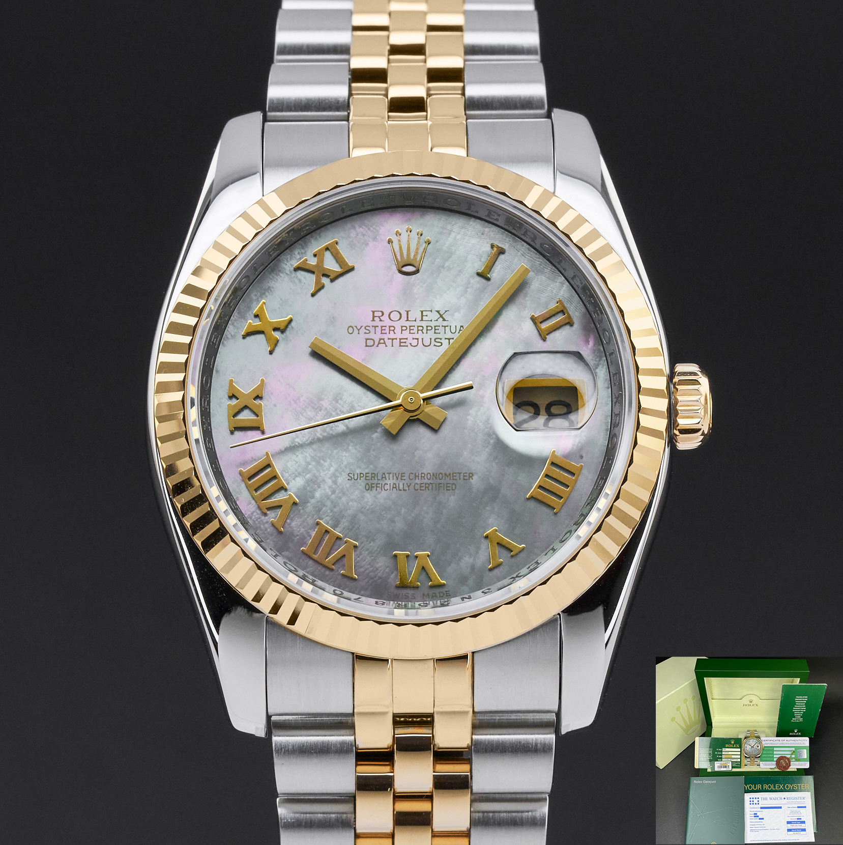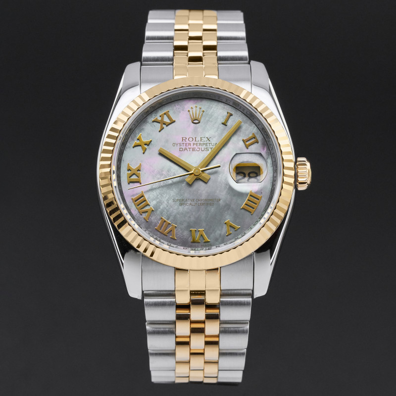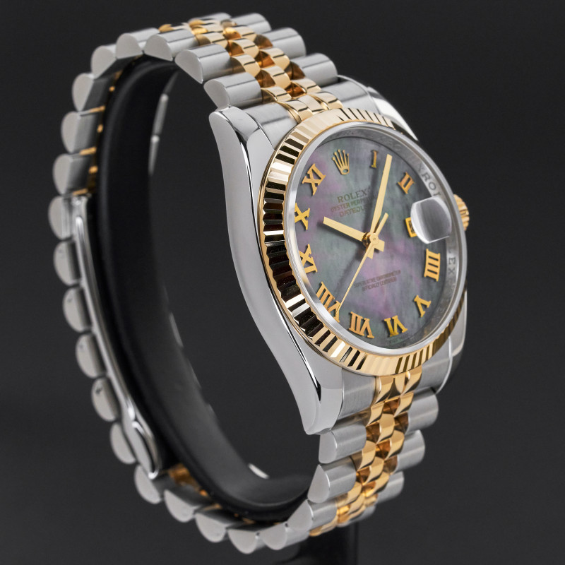 This Rolex Datejust 116233 features a Tahitian mother of pearl Roman dial and is crafted from 18K yellow gold and stainless steel.