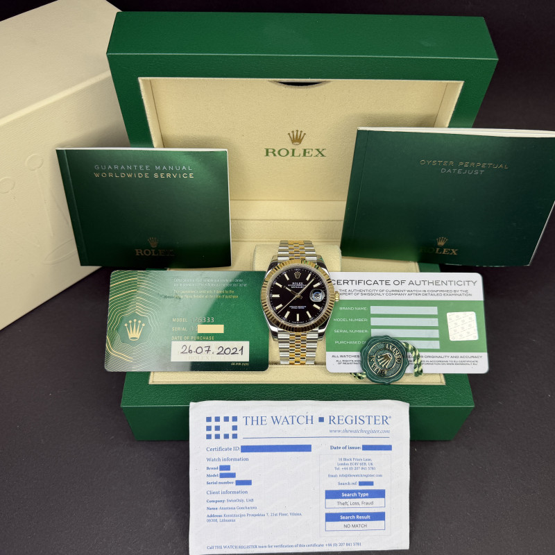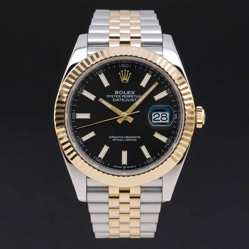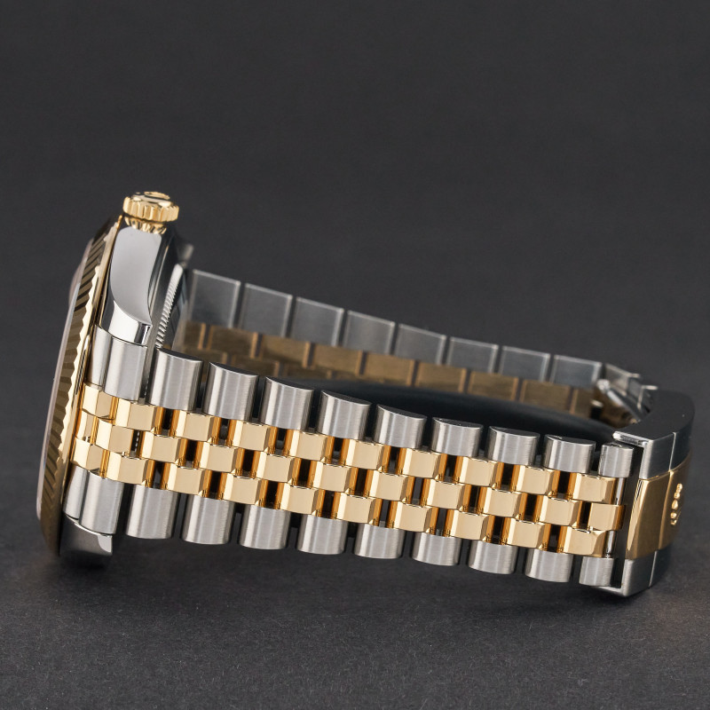 This Rolex Datejust 126333 features a Black dial and is crafted from 18K yellow gold and stainless steel, with a production year of 2021.