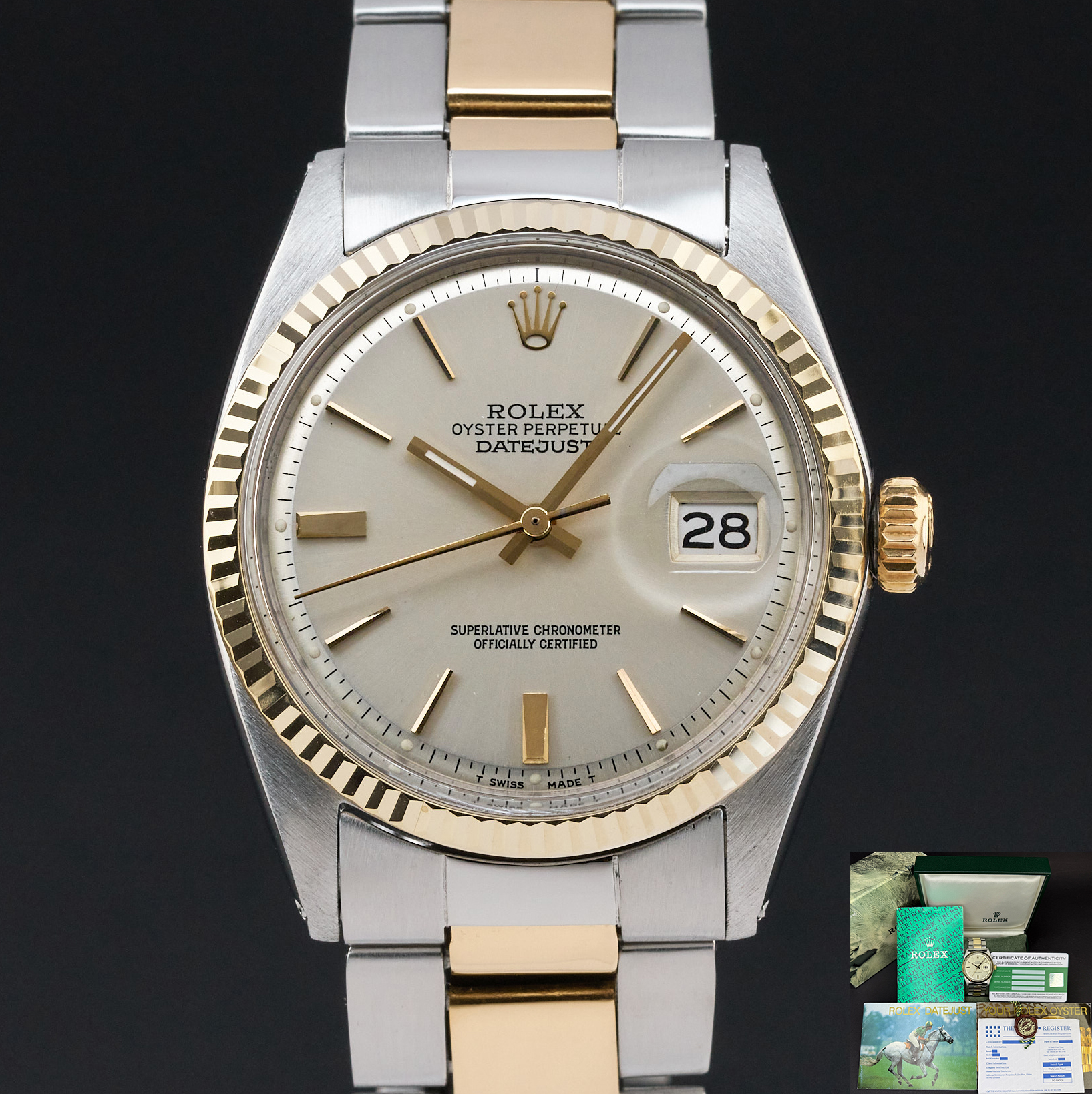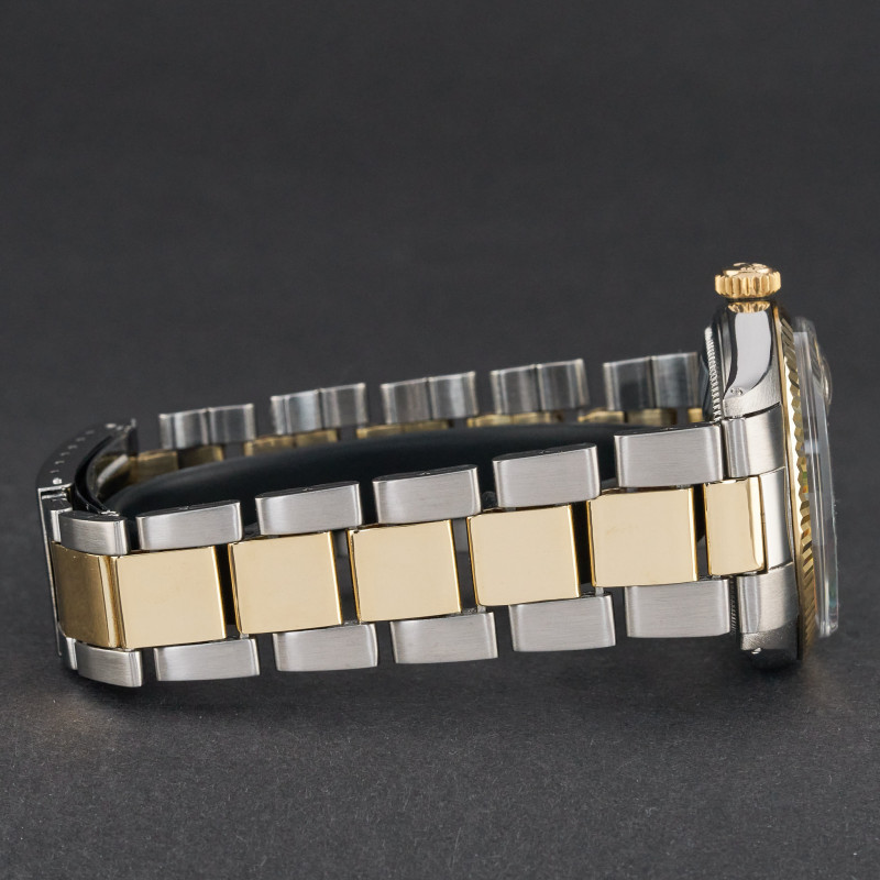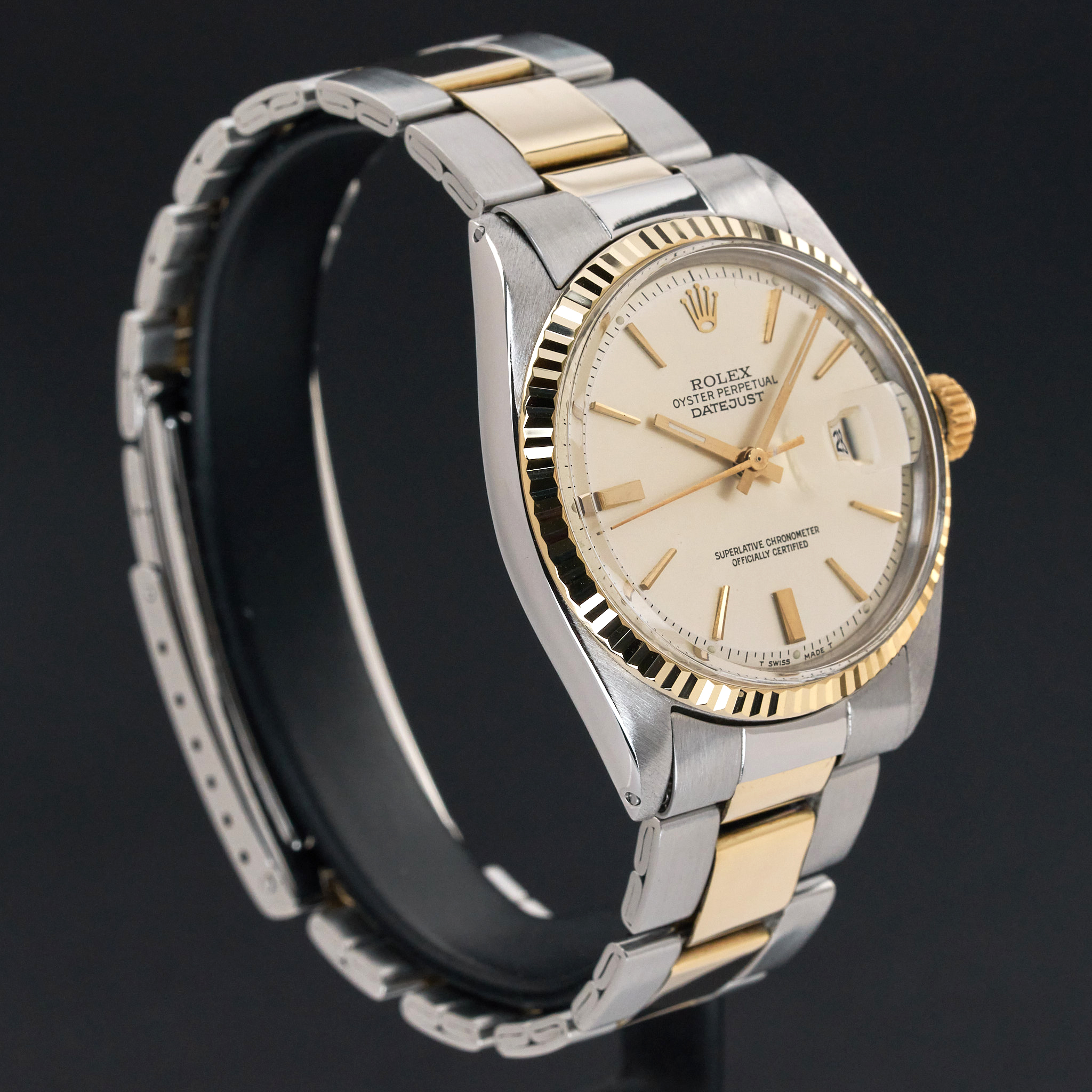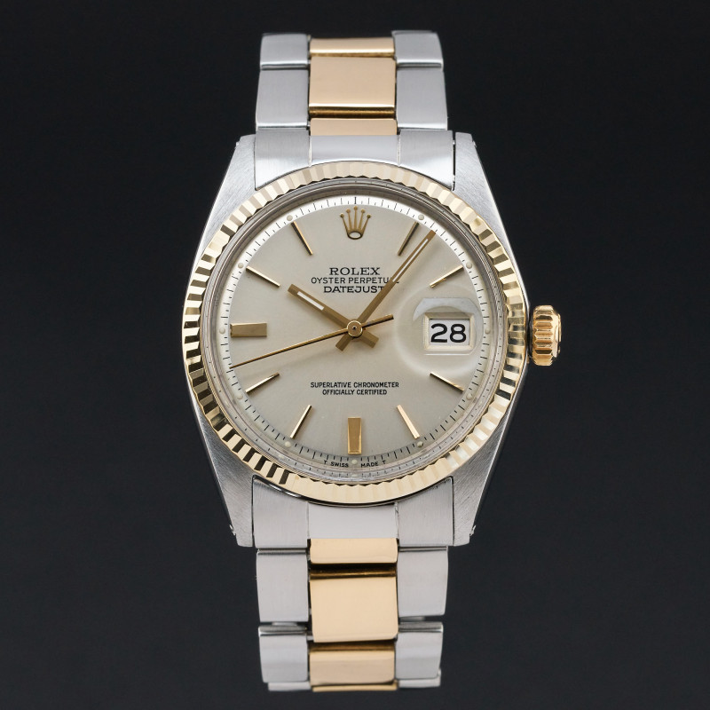 This Rolex Datejust 1601 features a Silver dial and is crafted from 18K yellow gold and stainless steel, with a production year of 1971.