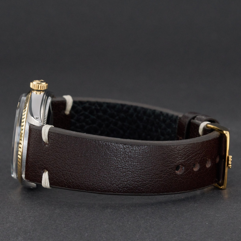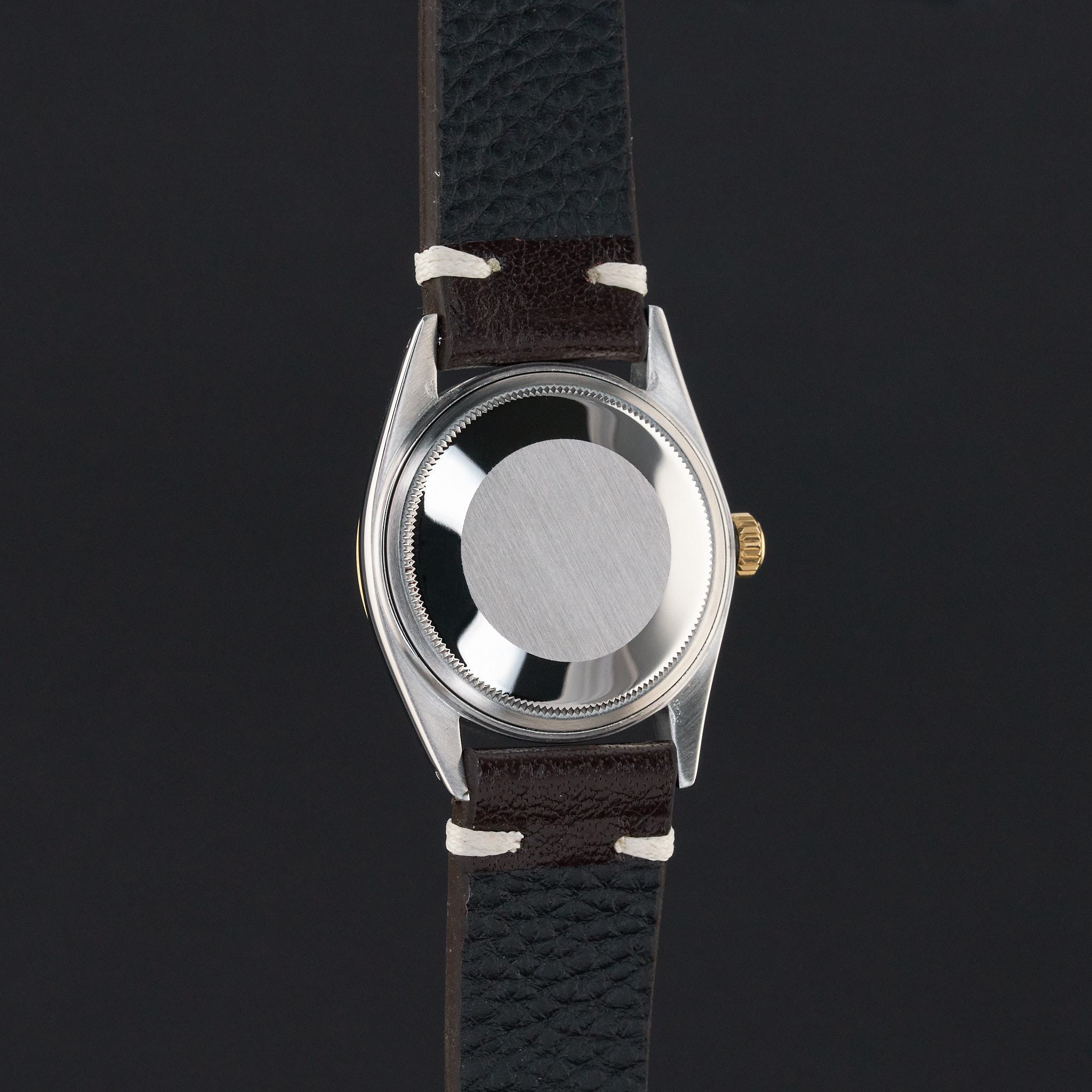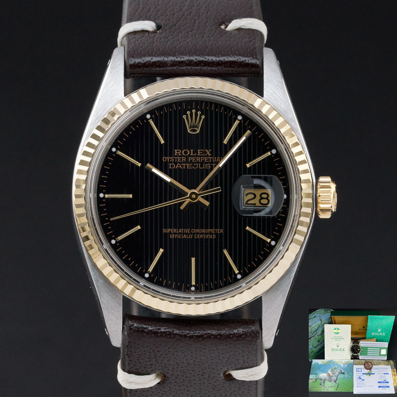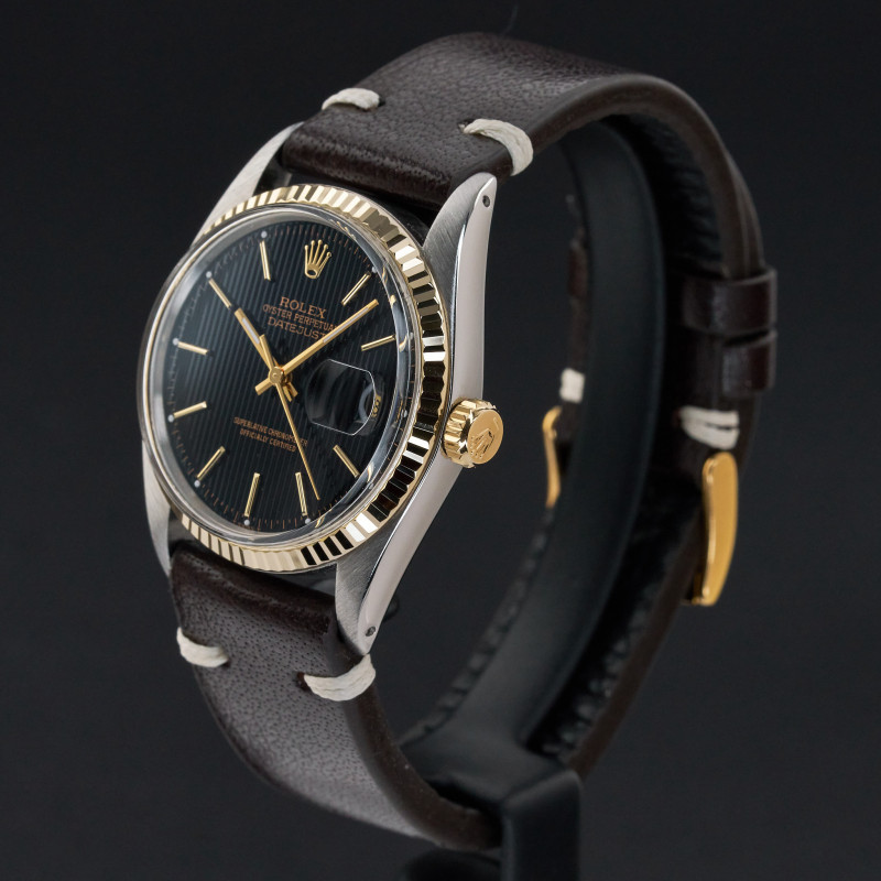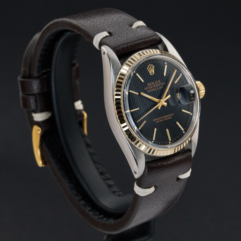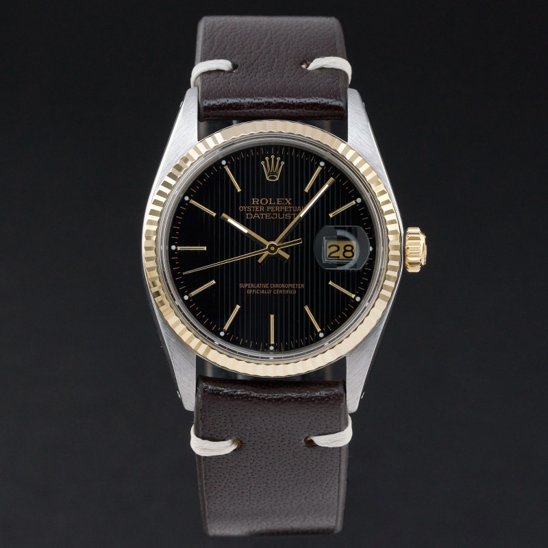 This Rolex Datejust 16013 features a Black Tapestry dial and is crafted from 18K yellow gold and stainless steel, with a production year of 1978.