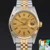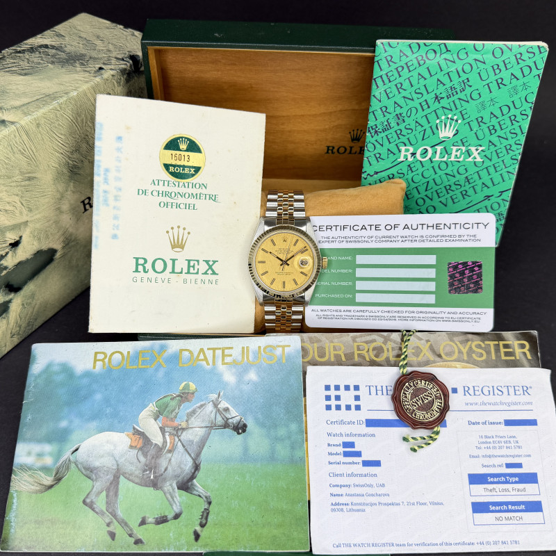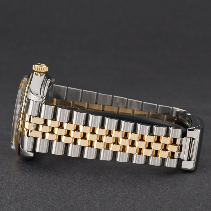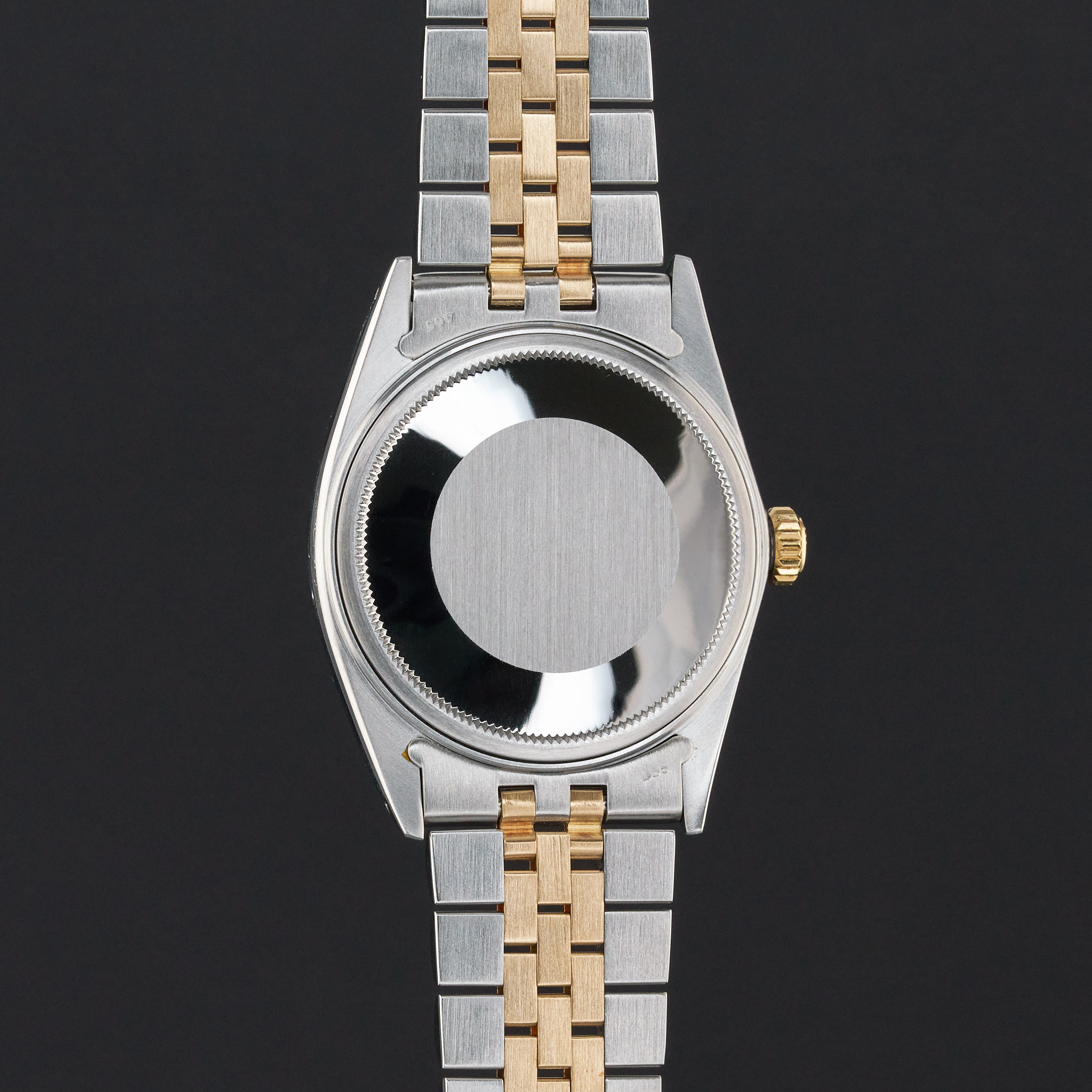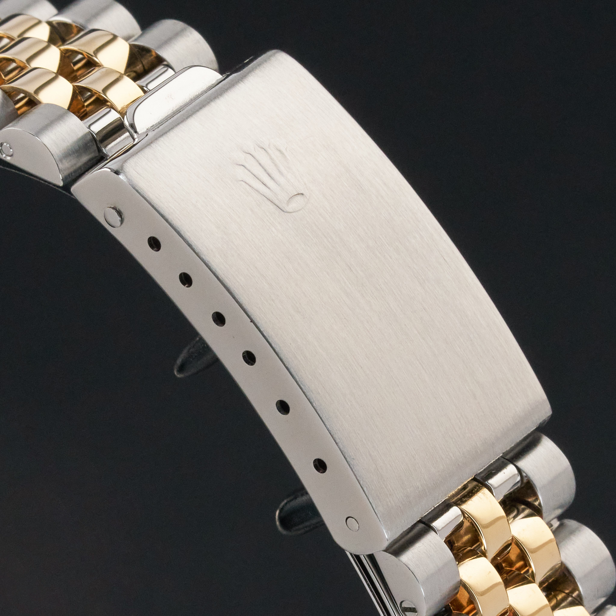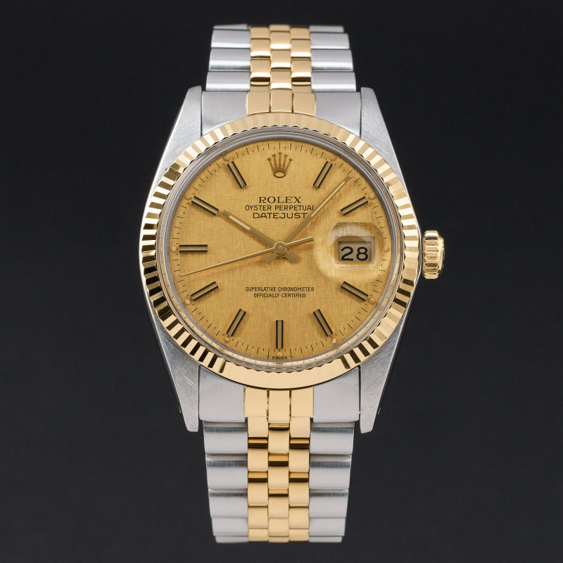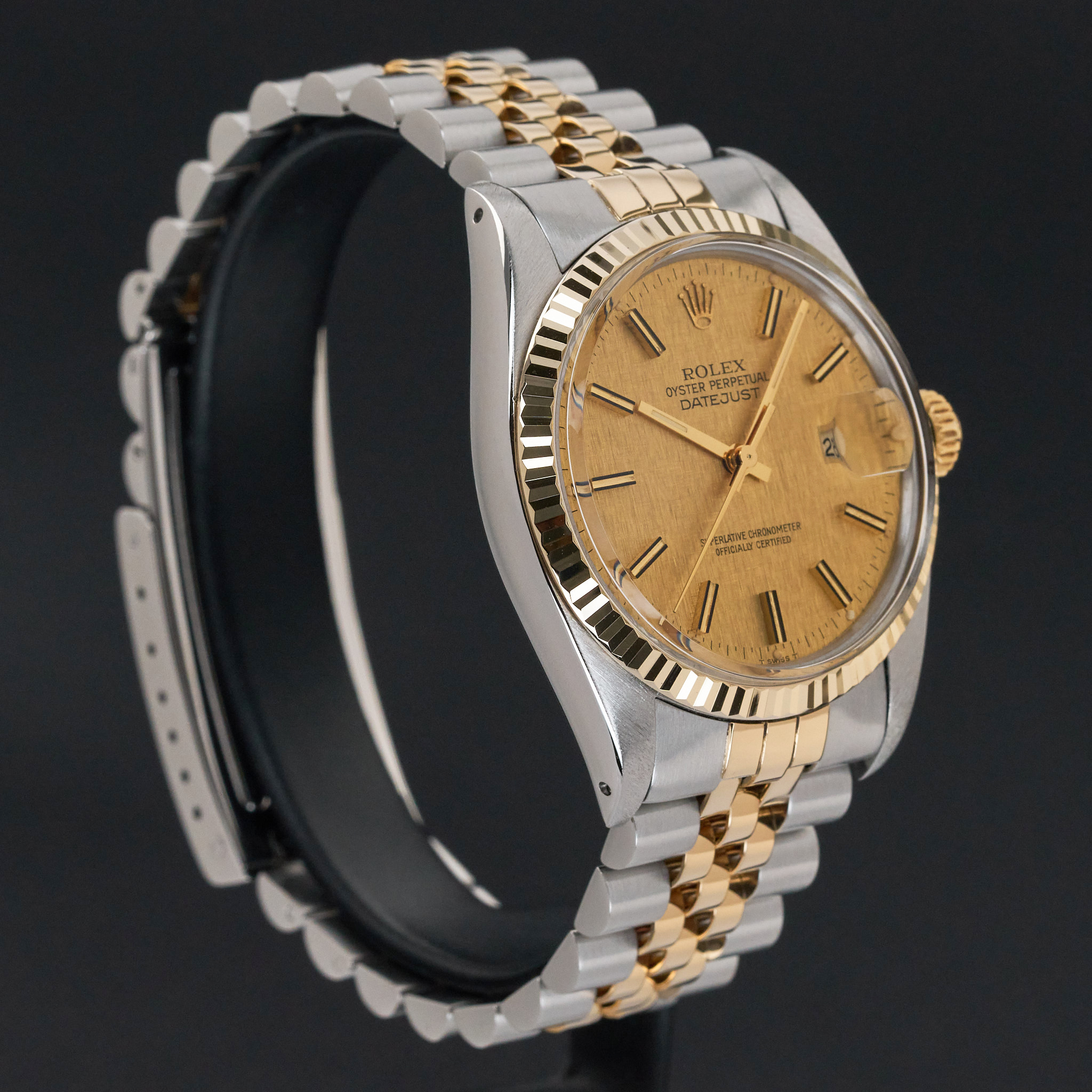 This Rolex Datejust 16013 features a Champagne linen dial and is crafted from 18K yellow gold and stainless steel, with a production year of 1982.