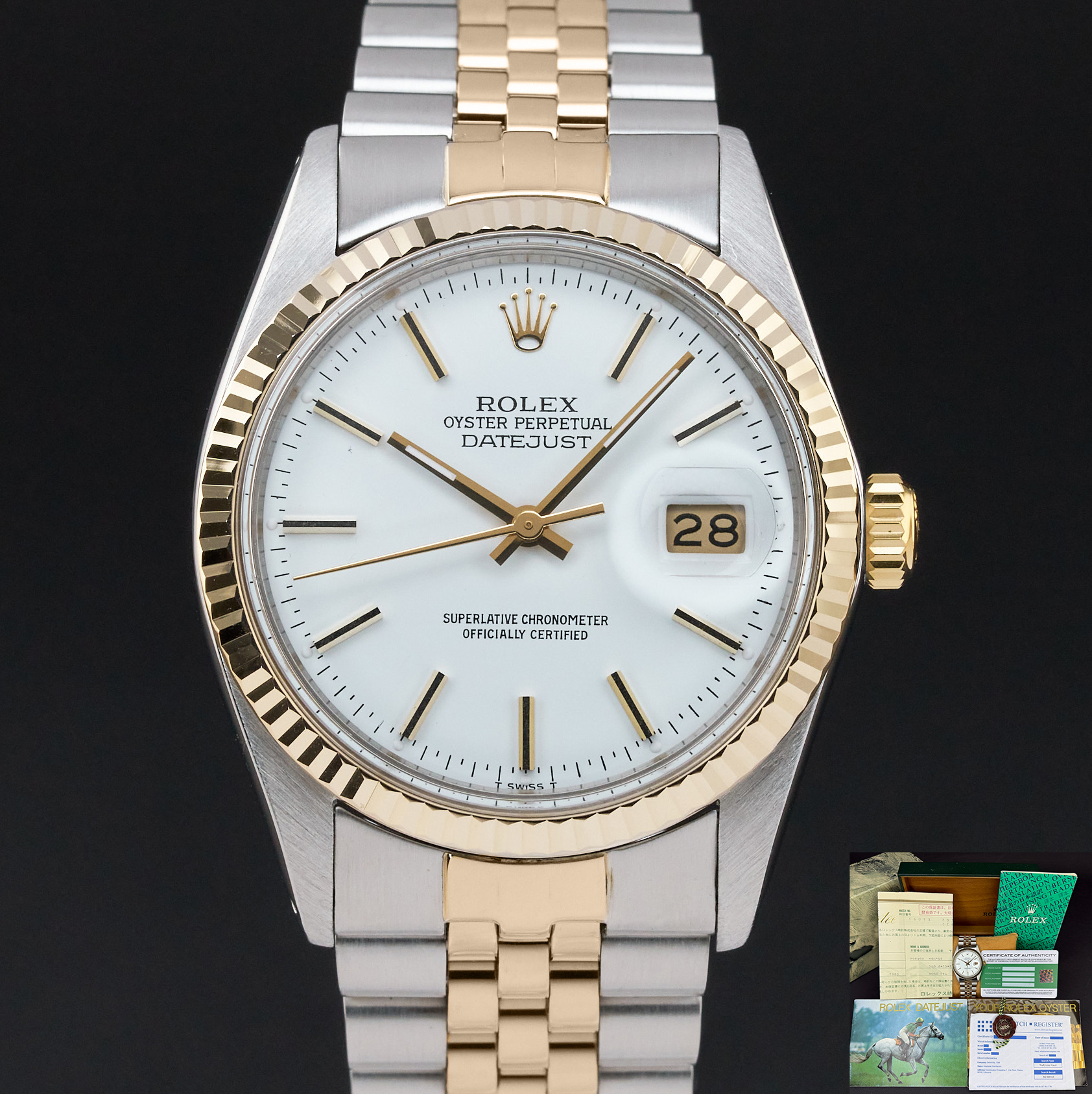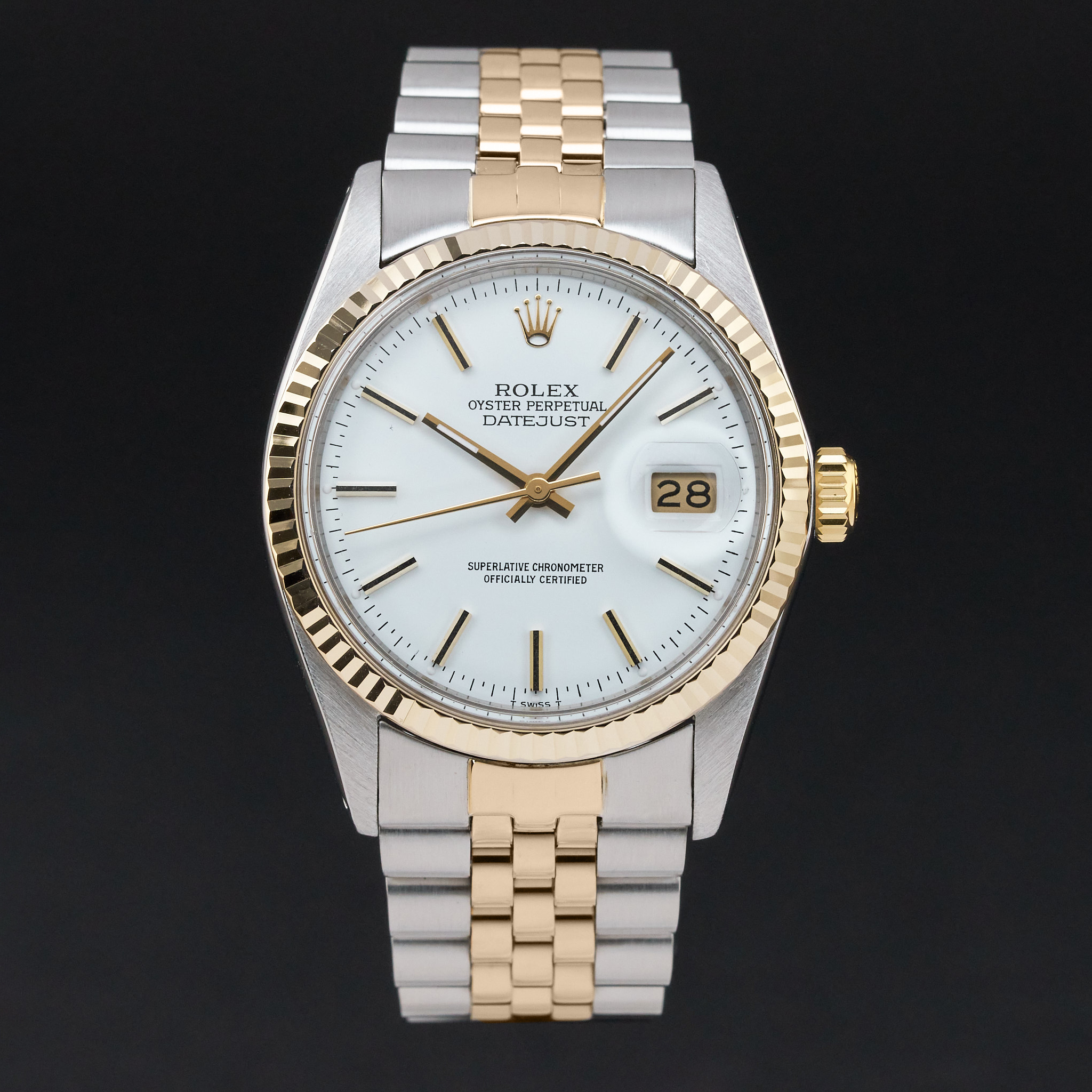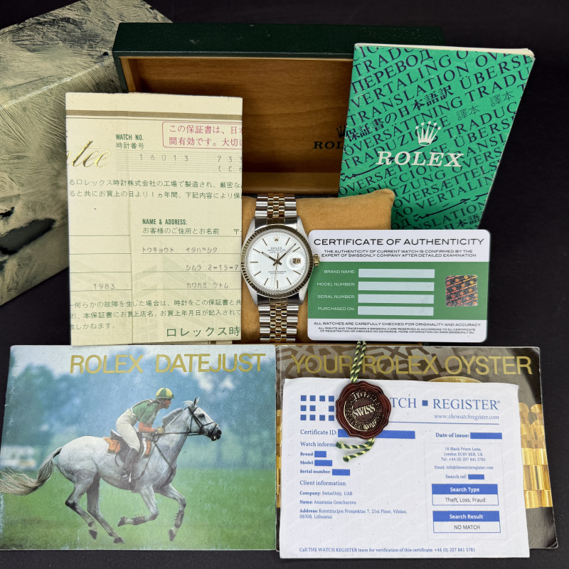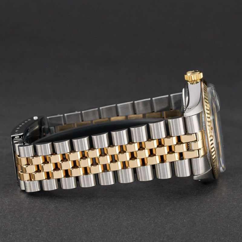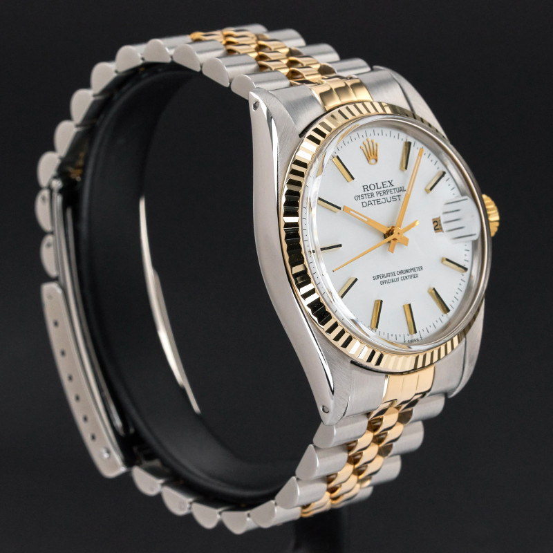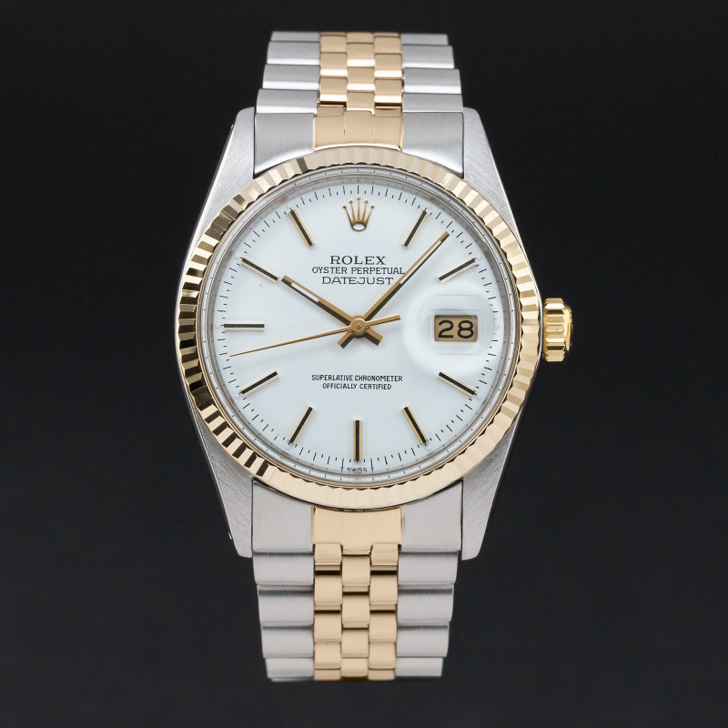 This Rolex Datejust 16013 features a White dial and is crafted from 18K yellow gold and stainless steel, with a production year of 1982.