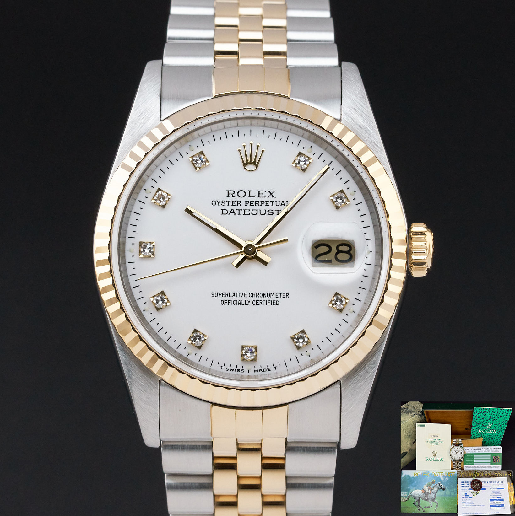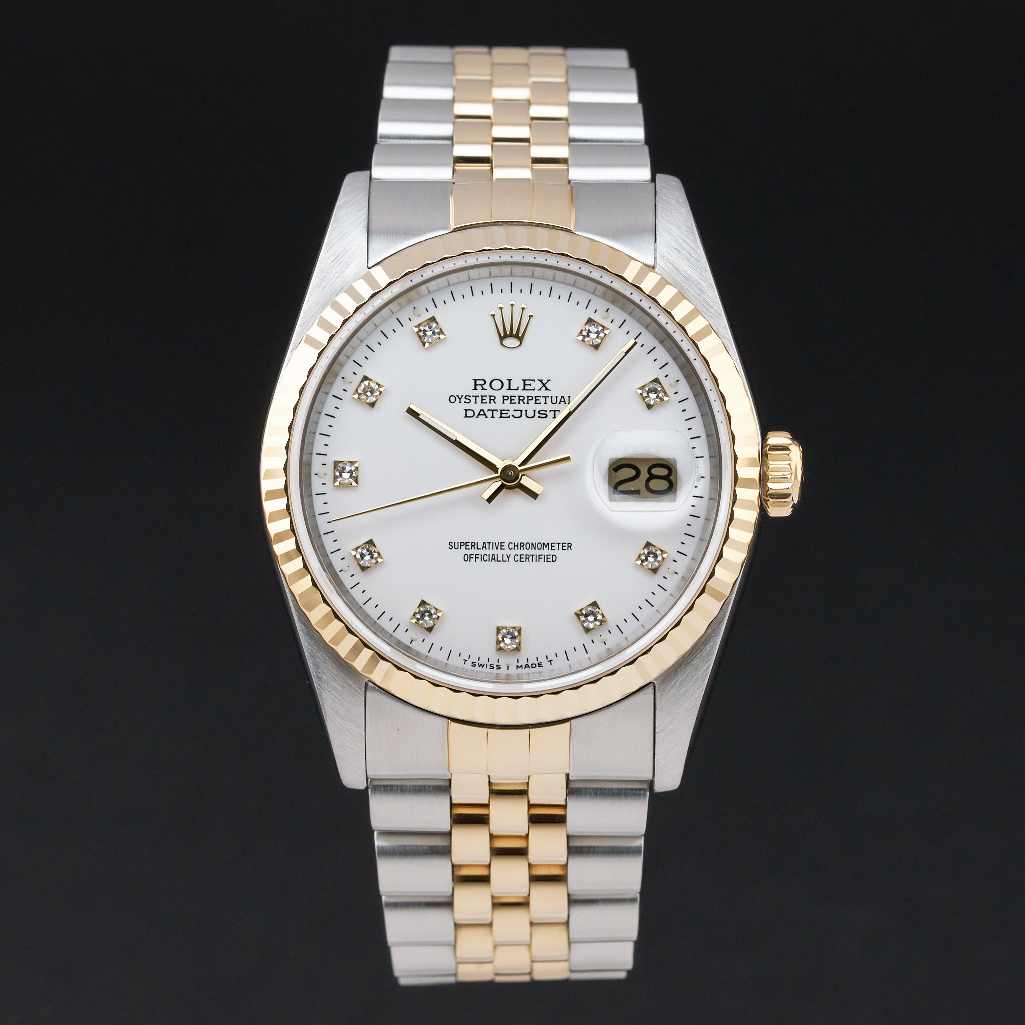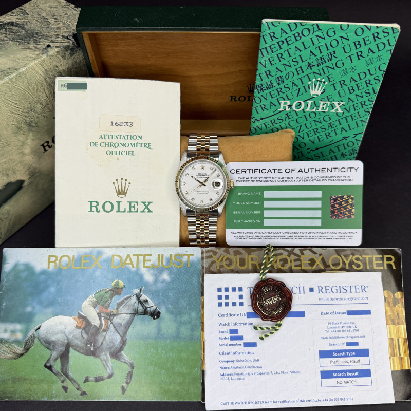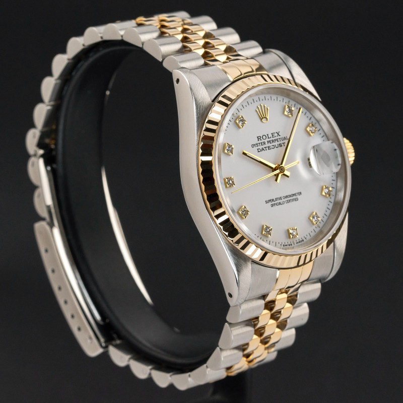 This Rolex Datejust 16233 features a White small diamond dial and is crafted from 18K yellow gold and stainless steel, with a production year of 1988.