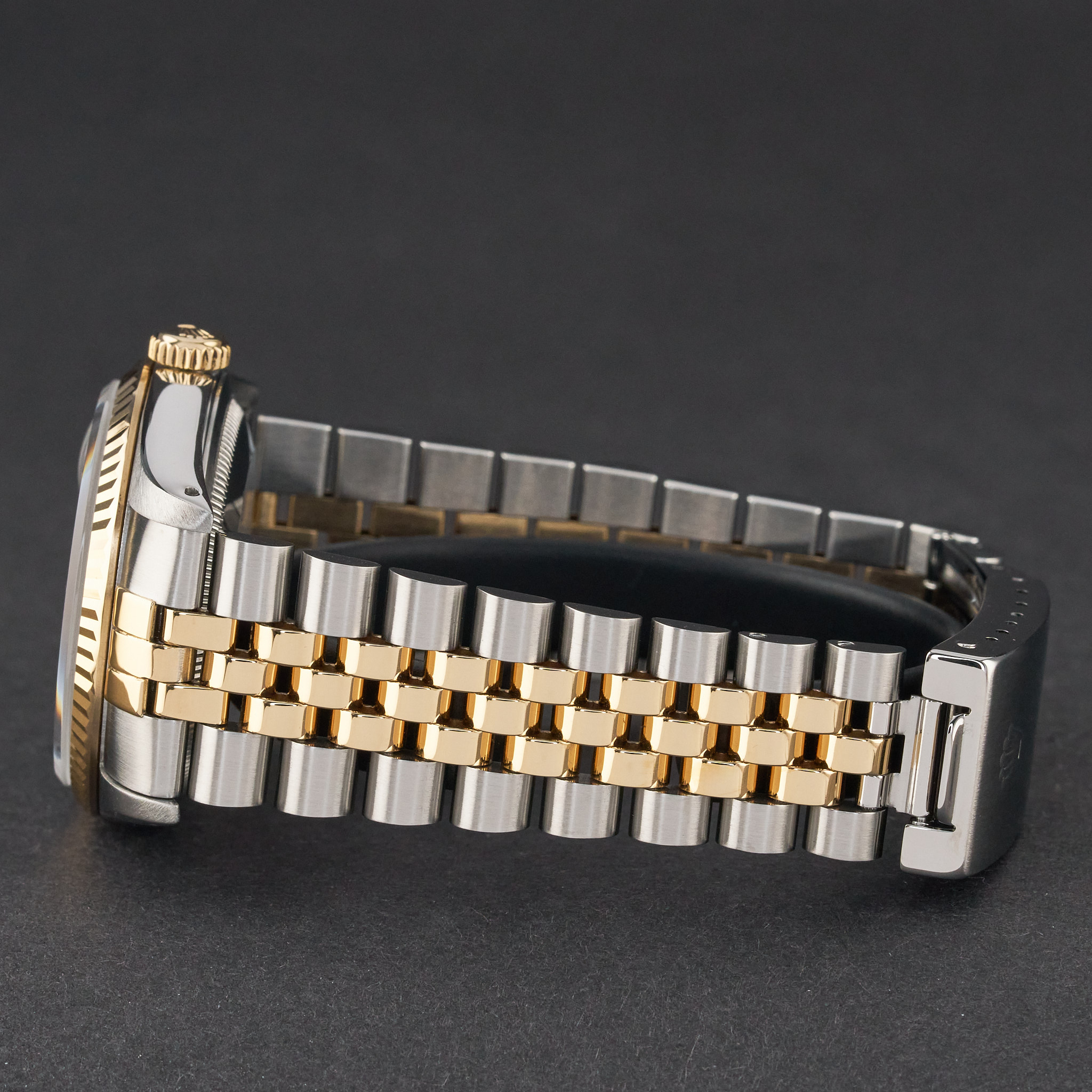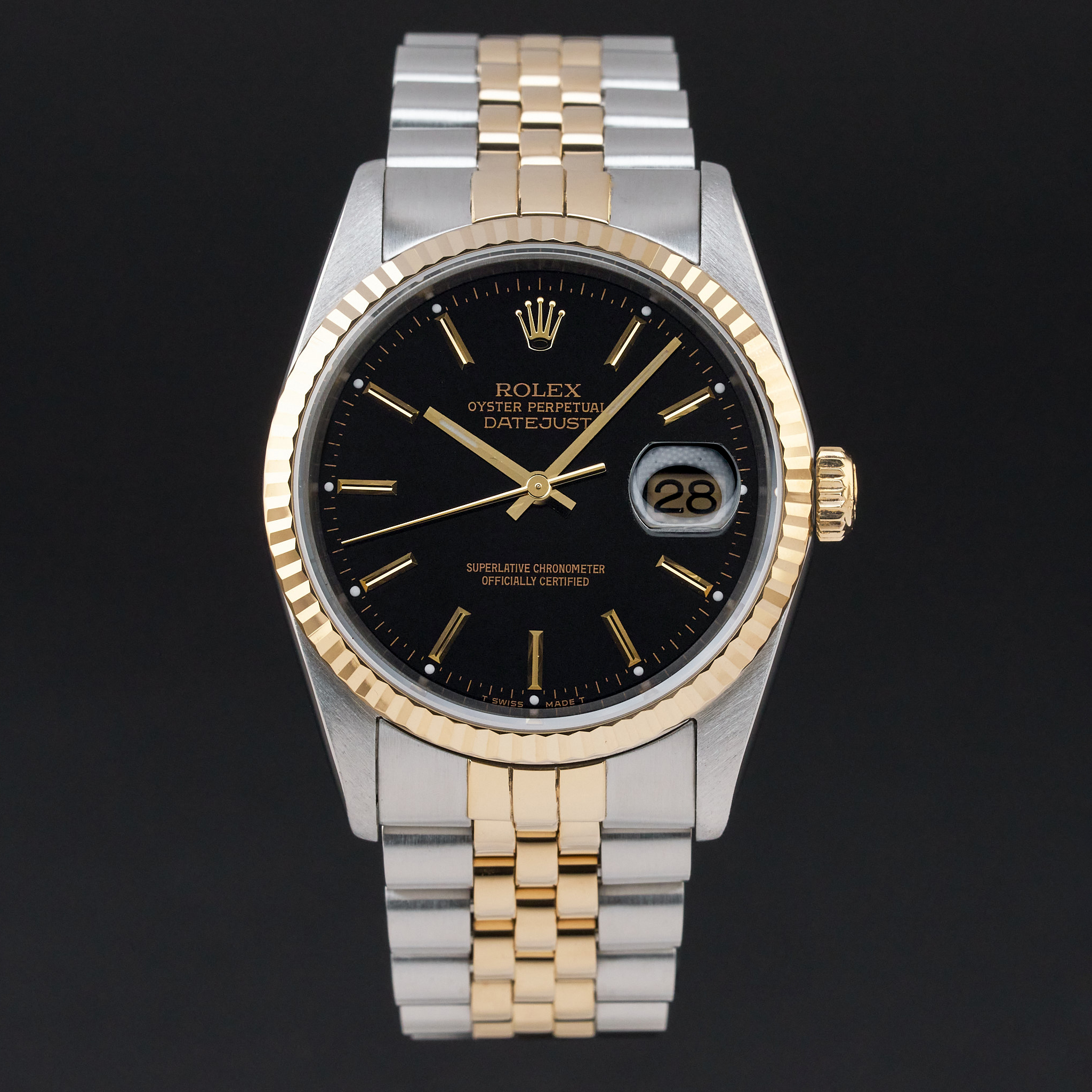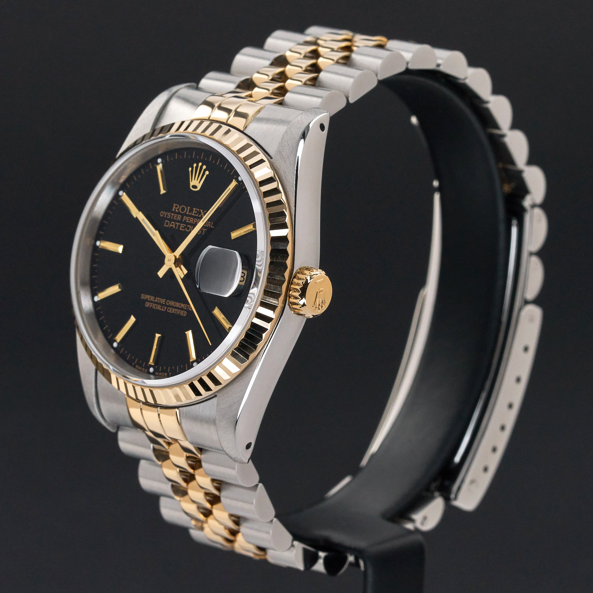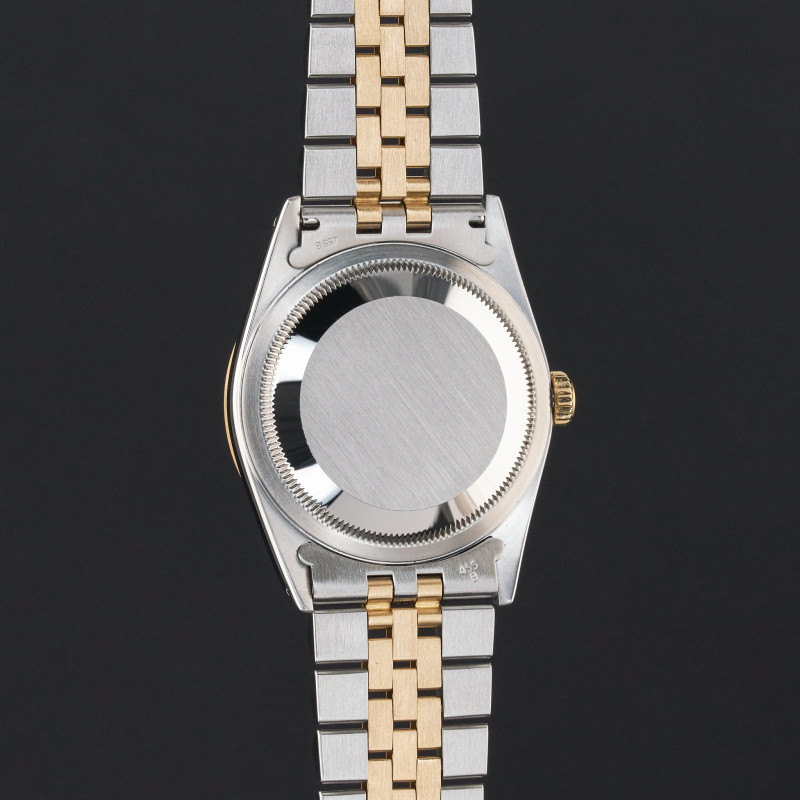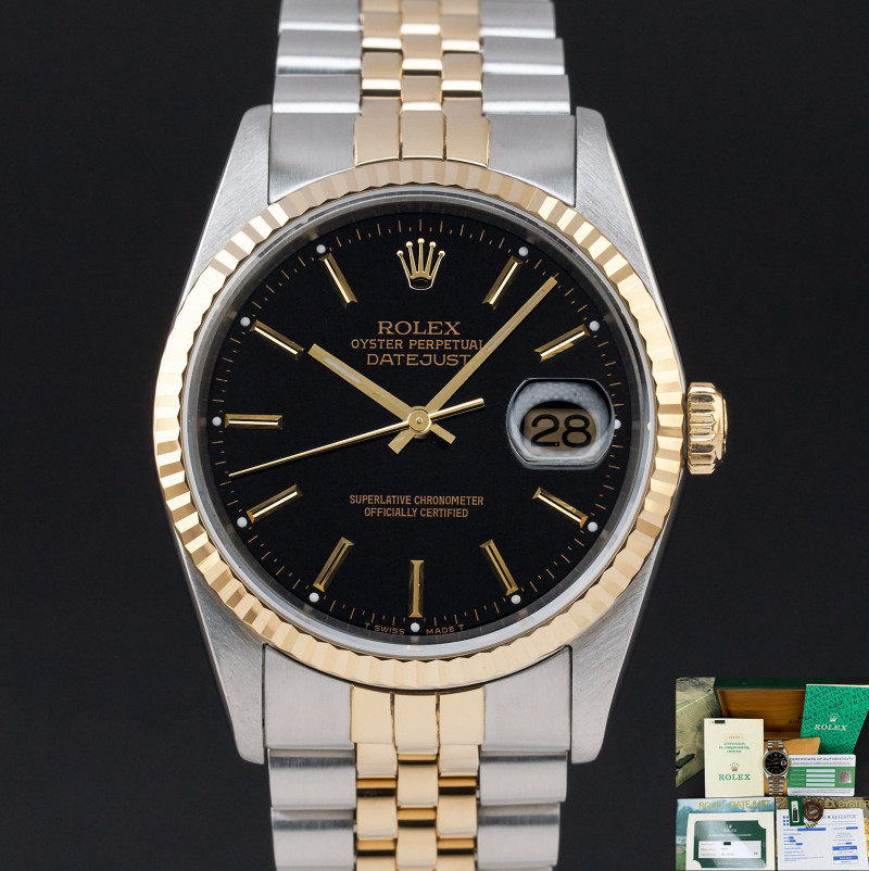 This Rolex Datejust 16233 features a Black dial and is crafted from 18K yellow gold and stainless steel, with a production year of 1989.